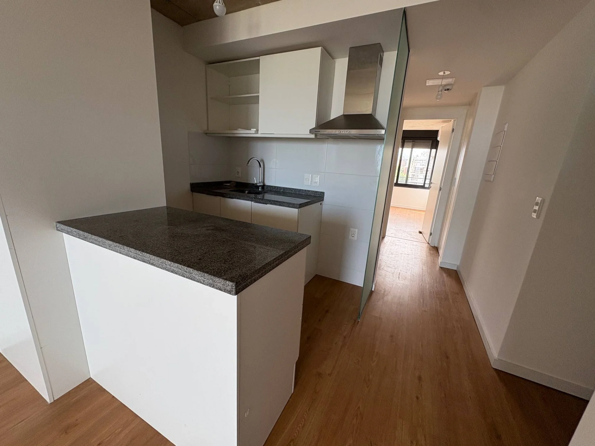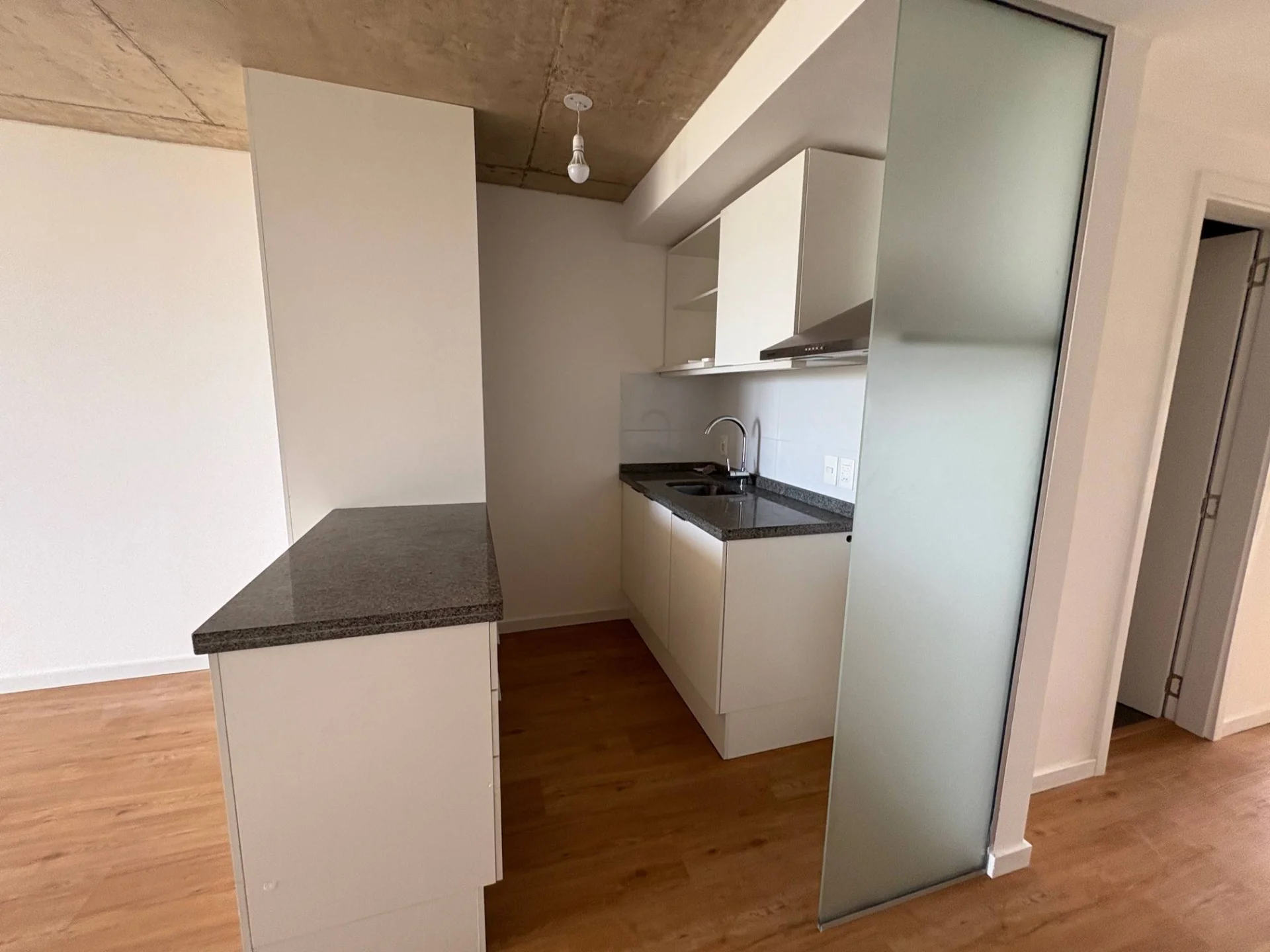 Cocina con placares varios, barra divisoria y campana de extraccion
