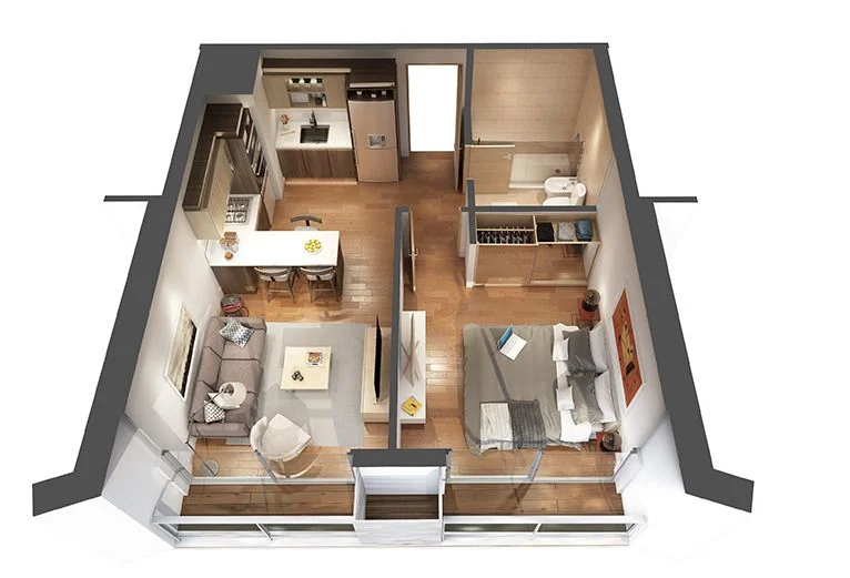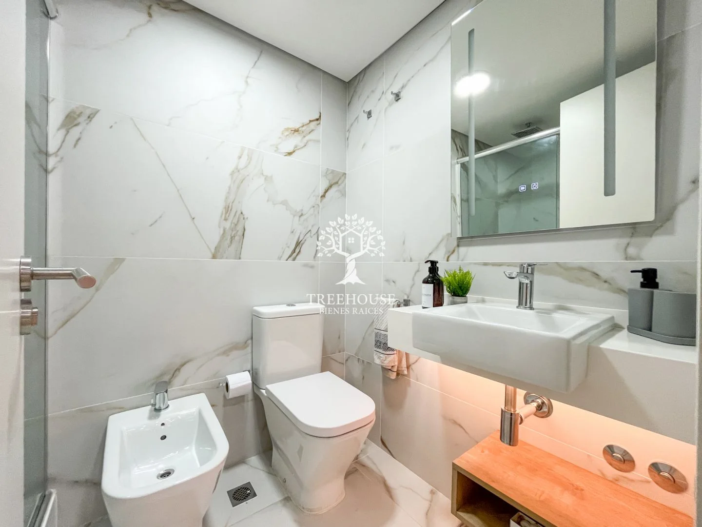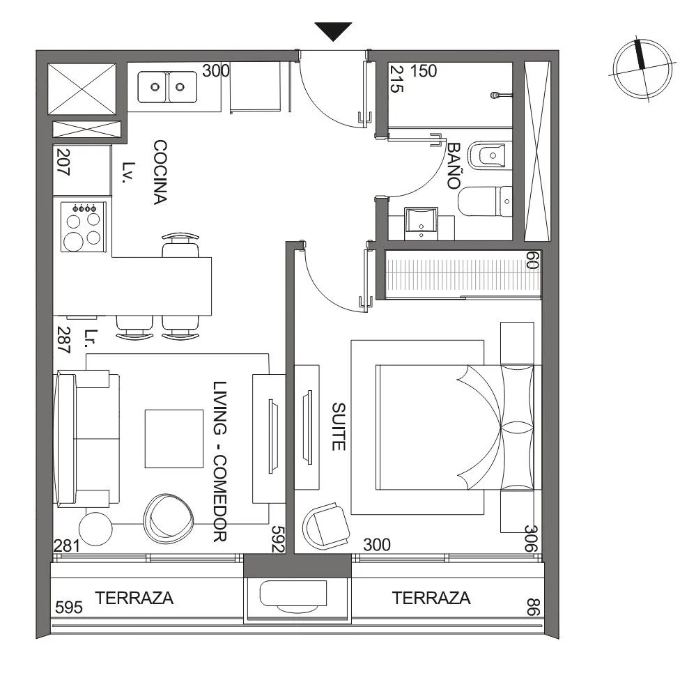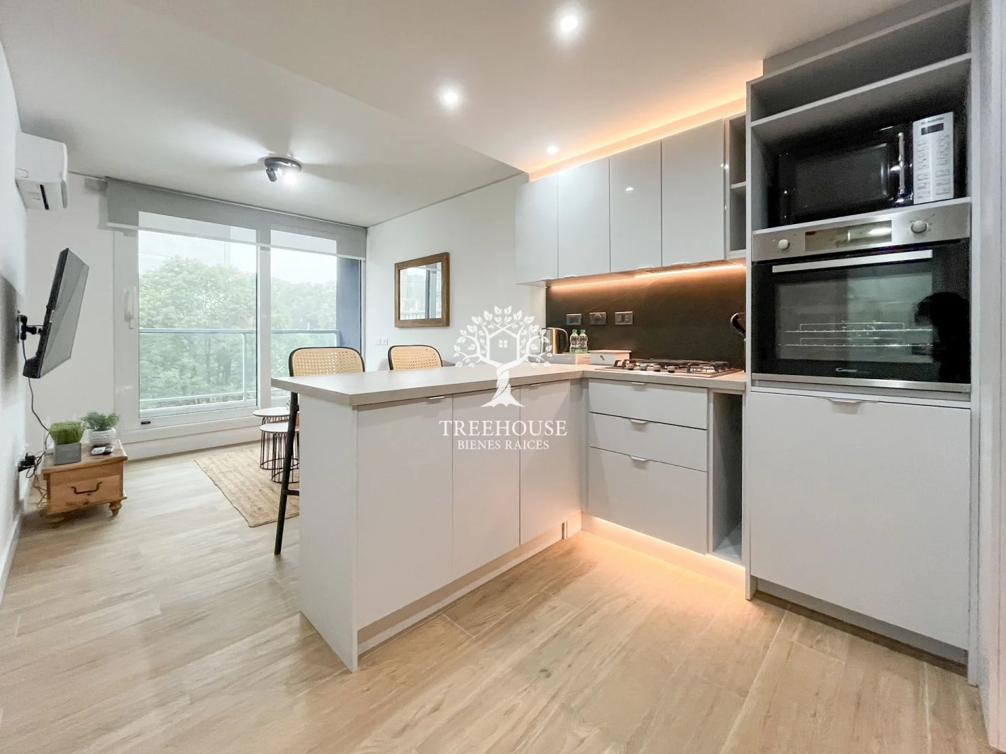 Compuesto por una sala de estar con salida hacia la terraza, cocina de concepto semi-integrado, completamente equipada, con desayunador. Dormitorio con salida a la segunda terraza y placard empotrado. Baño completo con mampara y accesorios.
