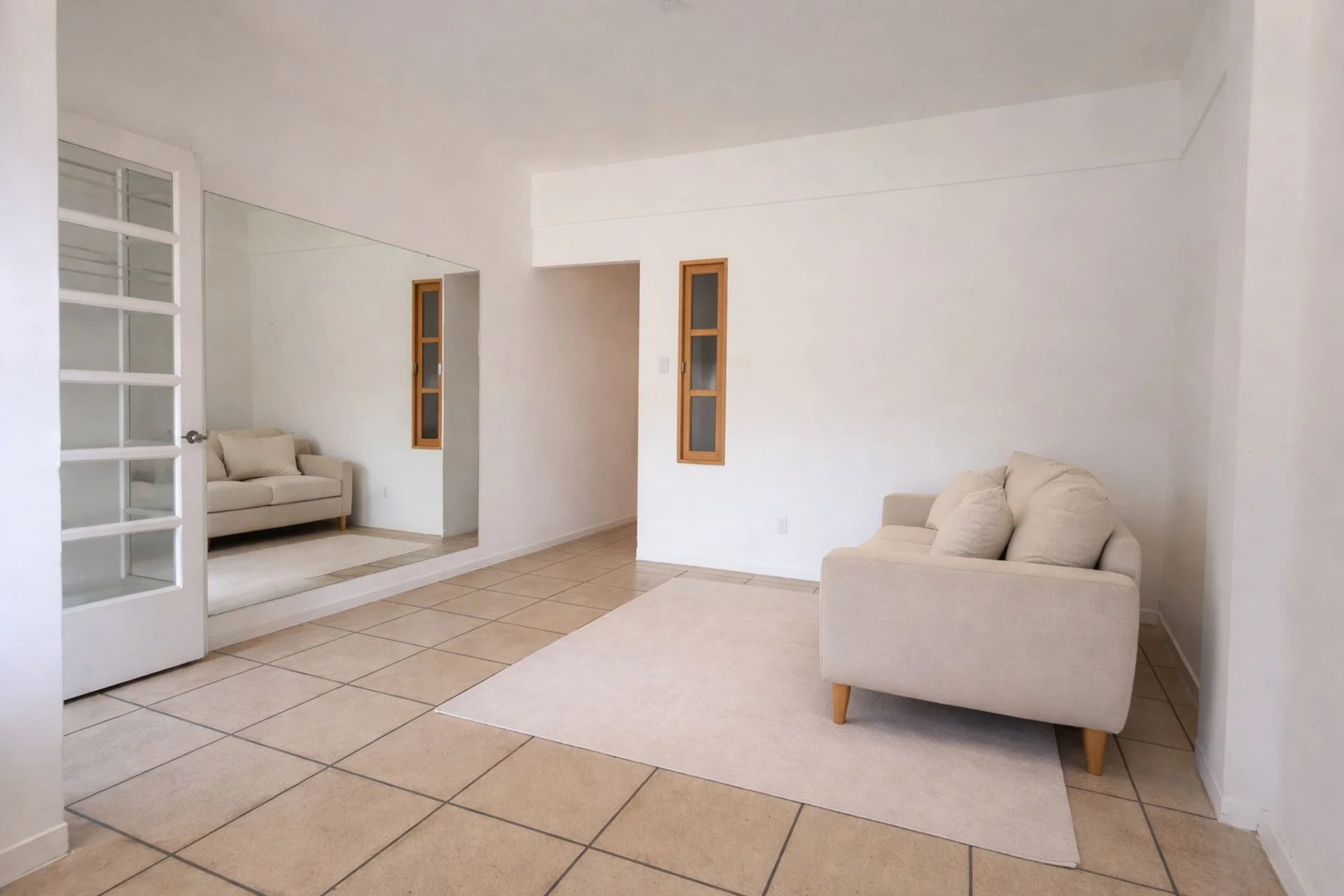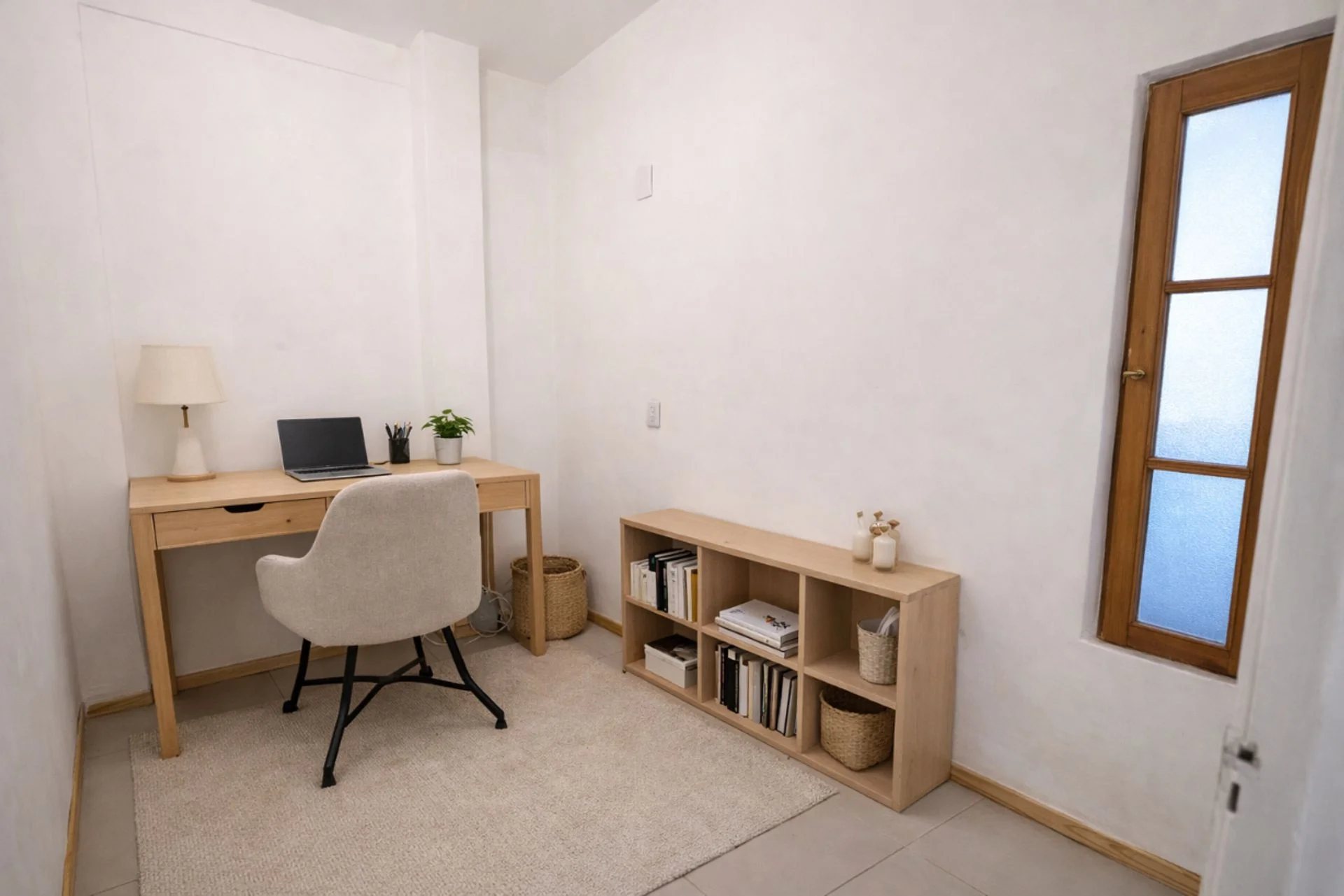 Desde un pasillo de distribución interno se accede a los distintos ambientes. Primero se encuentra una habitación pequeña, apta para cama de una plaza o escritorio, con ventana interna al living.