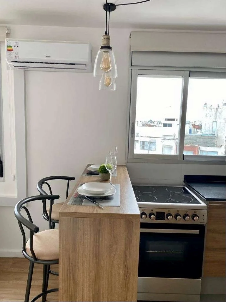 Amplio living comedor con cocina integrada con anafe, horno, campana, heladera y microondas. Barra con banquetas.