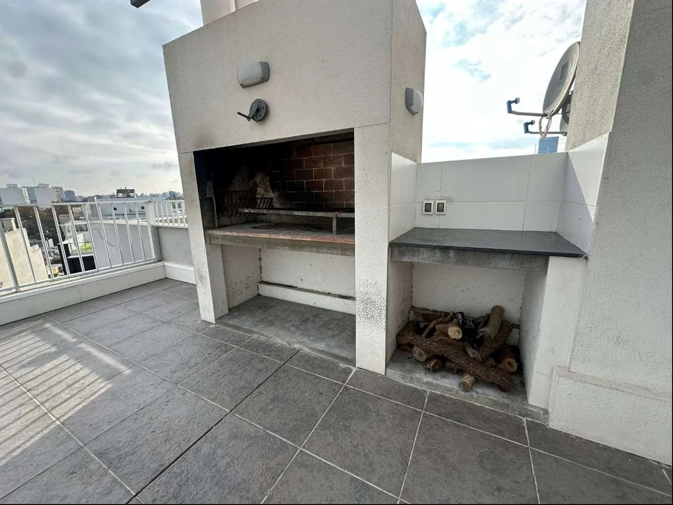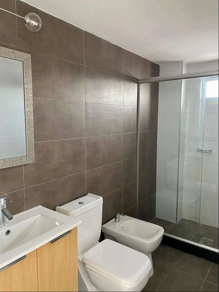 Baño completo con mampara. Dormitorio de buen tamaño con placard y sommier de 2 plazas. Terraza con excelente vista a la ciudad.