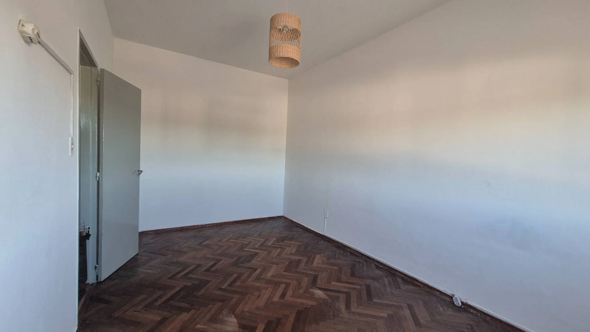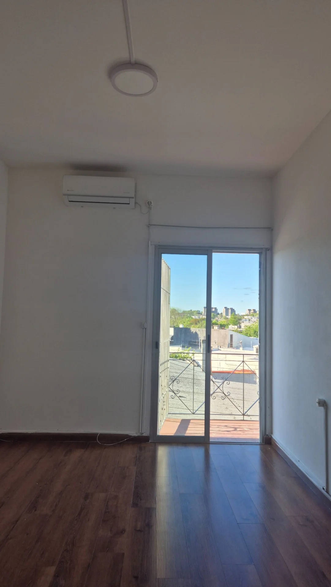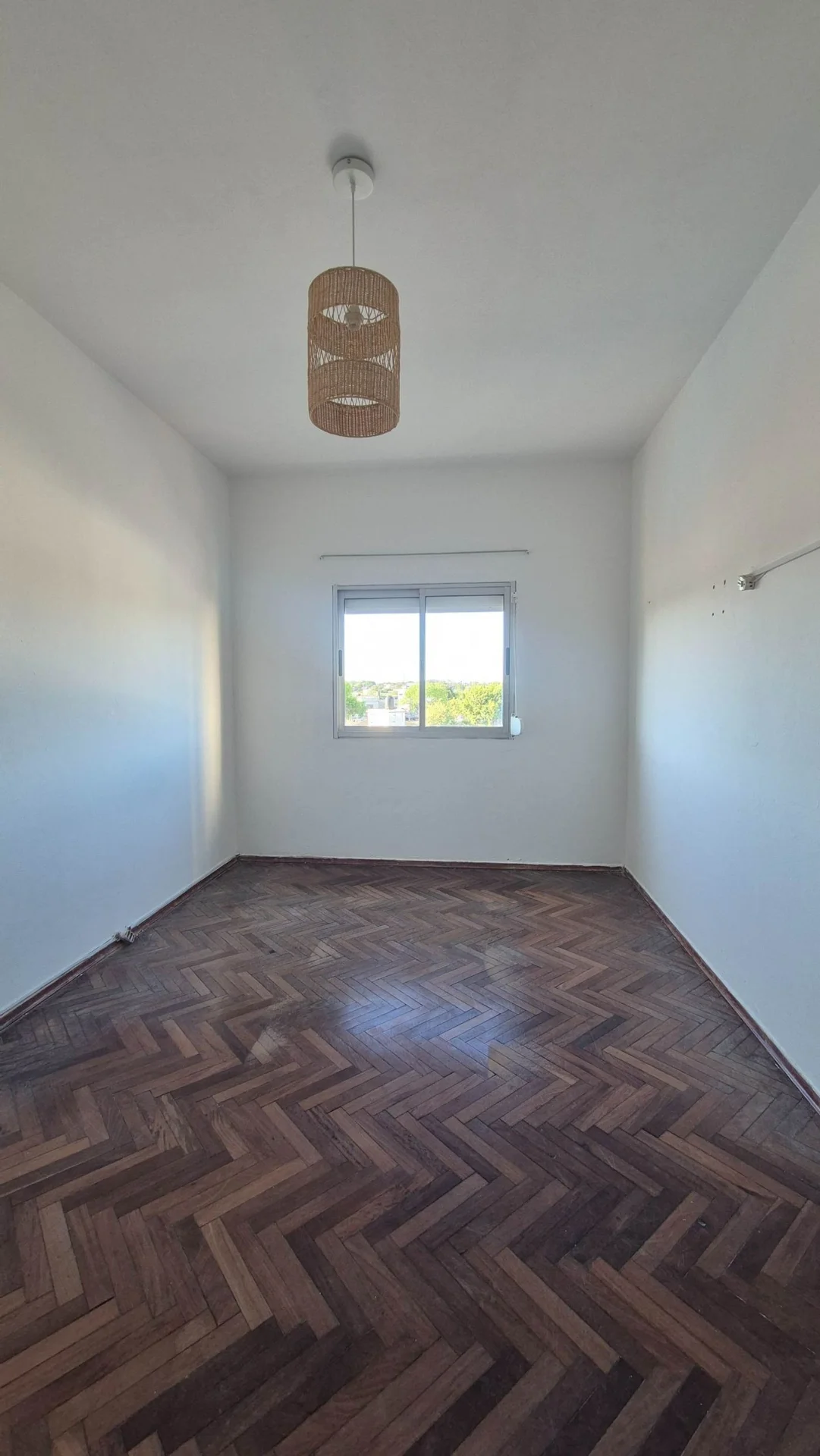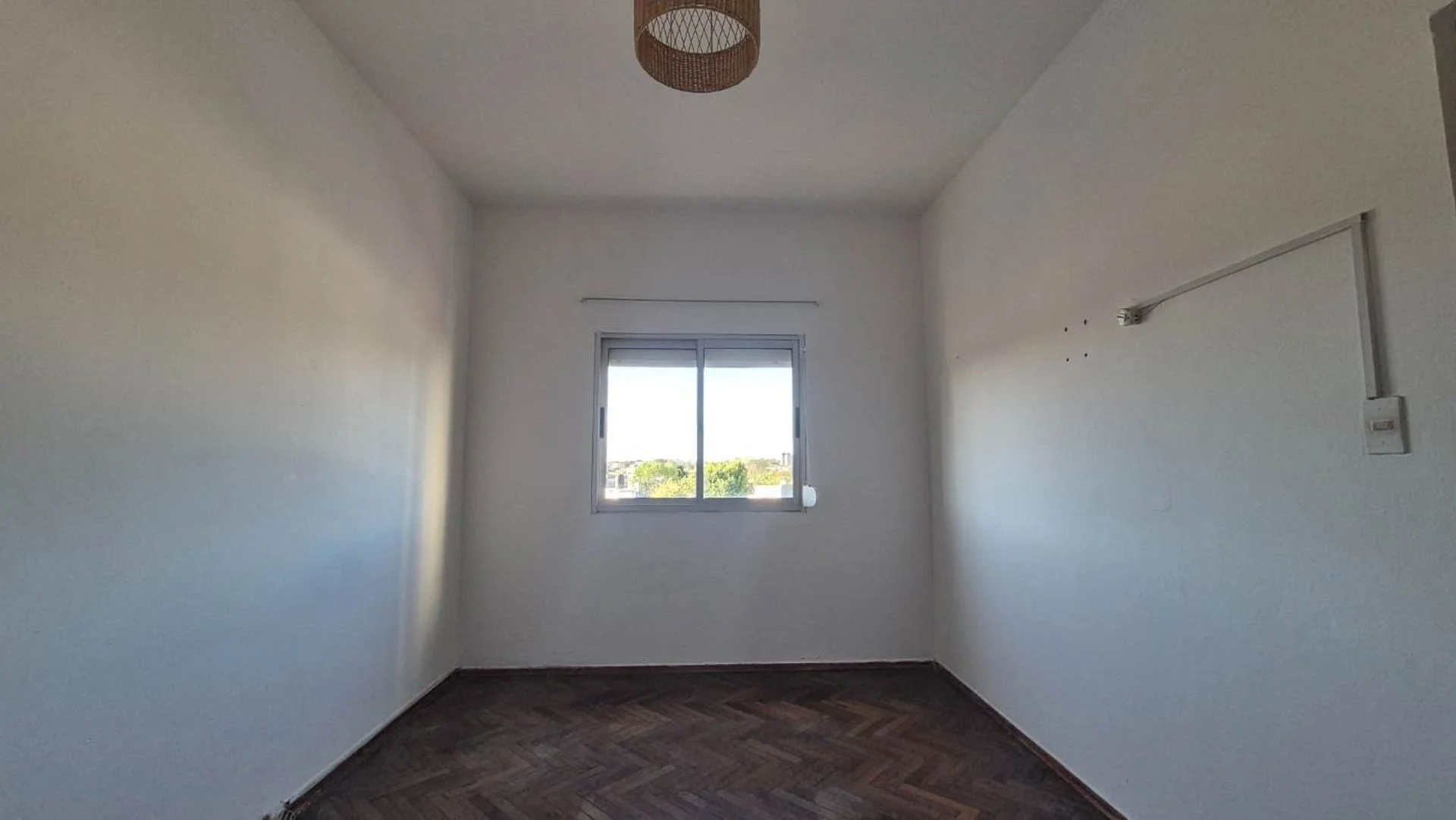 Un dormitorio con pisos de parque y ventana a contrafrente. Azotea con lugar para tendido de ropa.