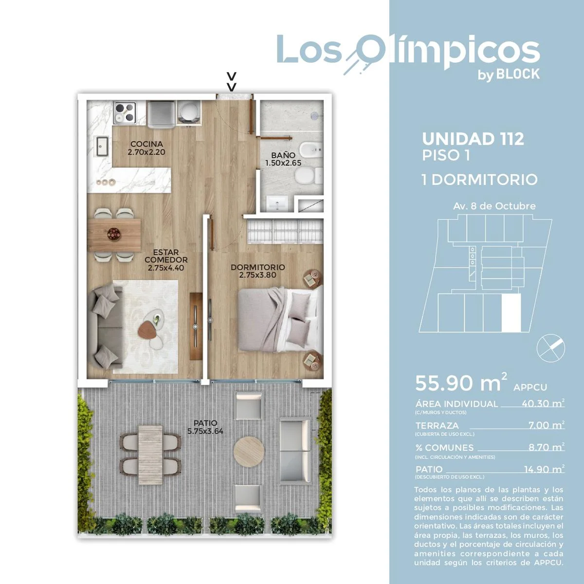 El apartamento forma parte de un edificio moderno construido con sistema tradicional, con estructura independiente de hormigón armado y excelentes terminaciones. Las unidades cuentan con pisos vinílicos símil madera en estar y dormitorio, revestimientos de porcelanato o cerámica de primera calidad en baños y cocina, y aberturas de aluminio con cortinas de enrollar. La cocina dispone de mesada de granito y pileta de acero inoxidable, mientras que el baño cuenta con artefactos y grifería monocomando de primera calidad. Además, el apartamento cuenta con previsión para instalación de lavarropas y preinstalación para aire acondicionado tipo split.