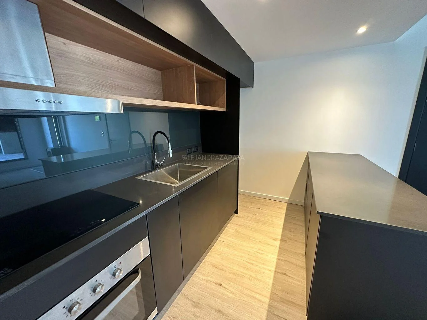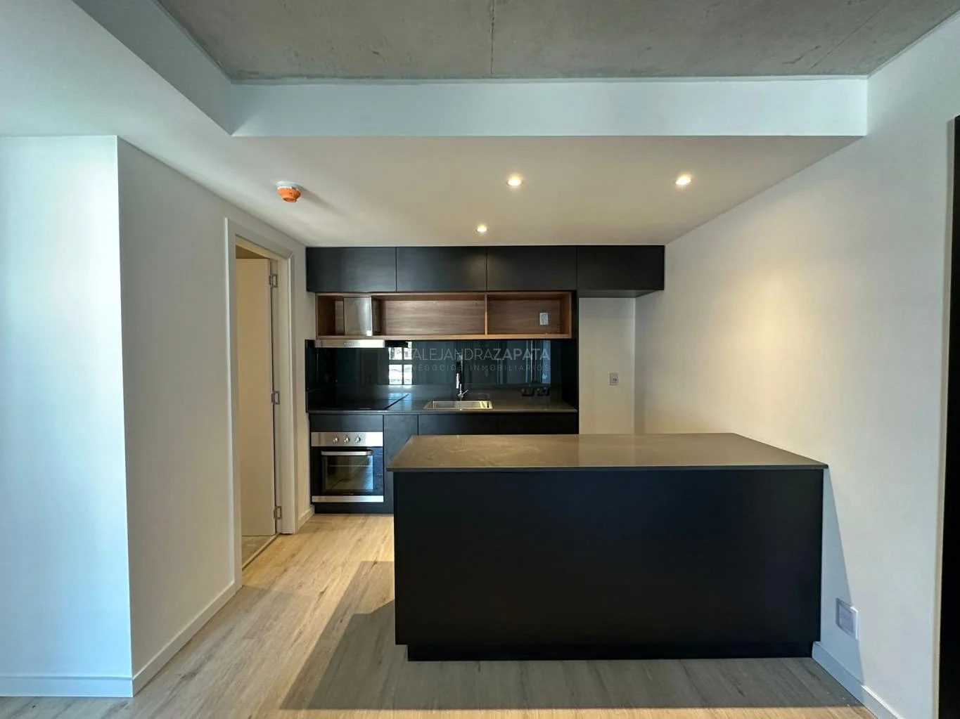 Amplio living comedor con cocina integrada y moderna barra con gran profusión de placares.
