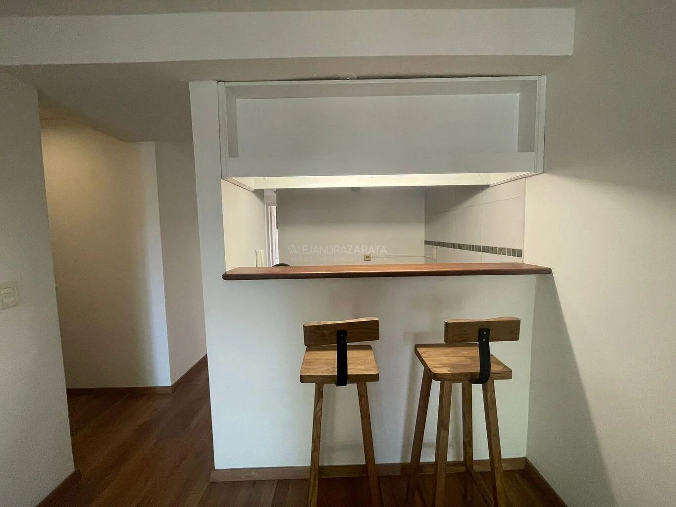 Cocina integrada con barra desayunadora y campana extractora instalada.. Buena capacidad de placares sobre y bajo mesada.