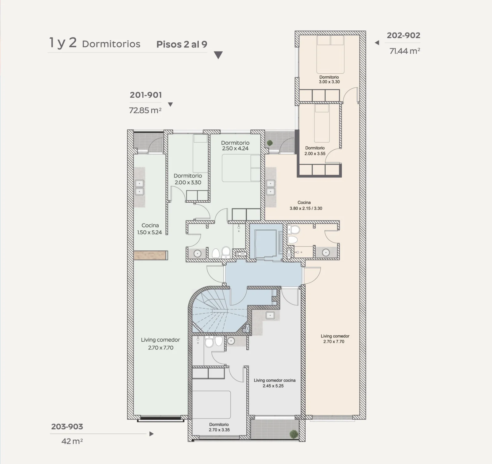 Apartamento a estrenar en piso 9, living comedor amplio de 7.70 x 2.70 mts. permite armar living y comedor de forma cómoda.