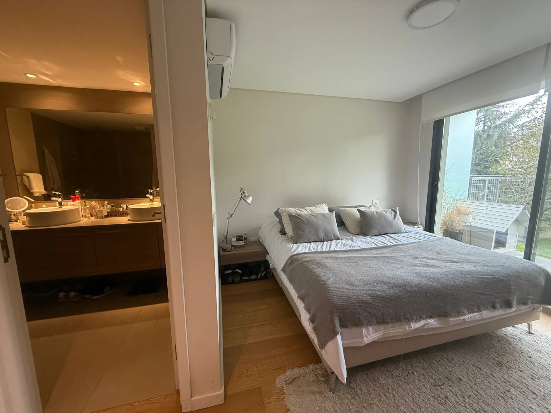 La suite principal cuenta con vestidor y baño amplio, y una gran ventanal con vista al jardín.