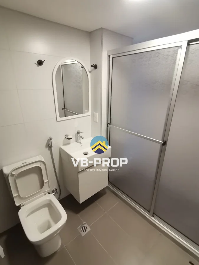 Baño con ventilación natural, mampara corrediza e instalación para lavadora y secarropa.