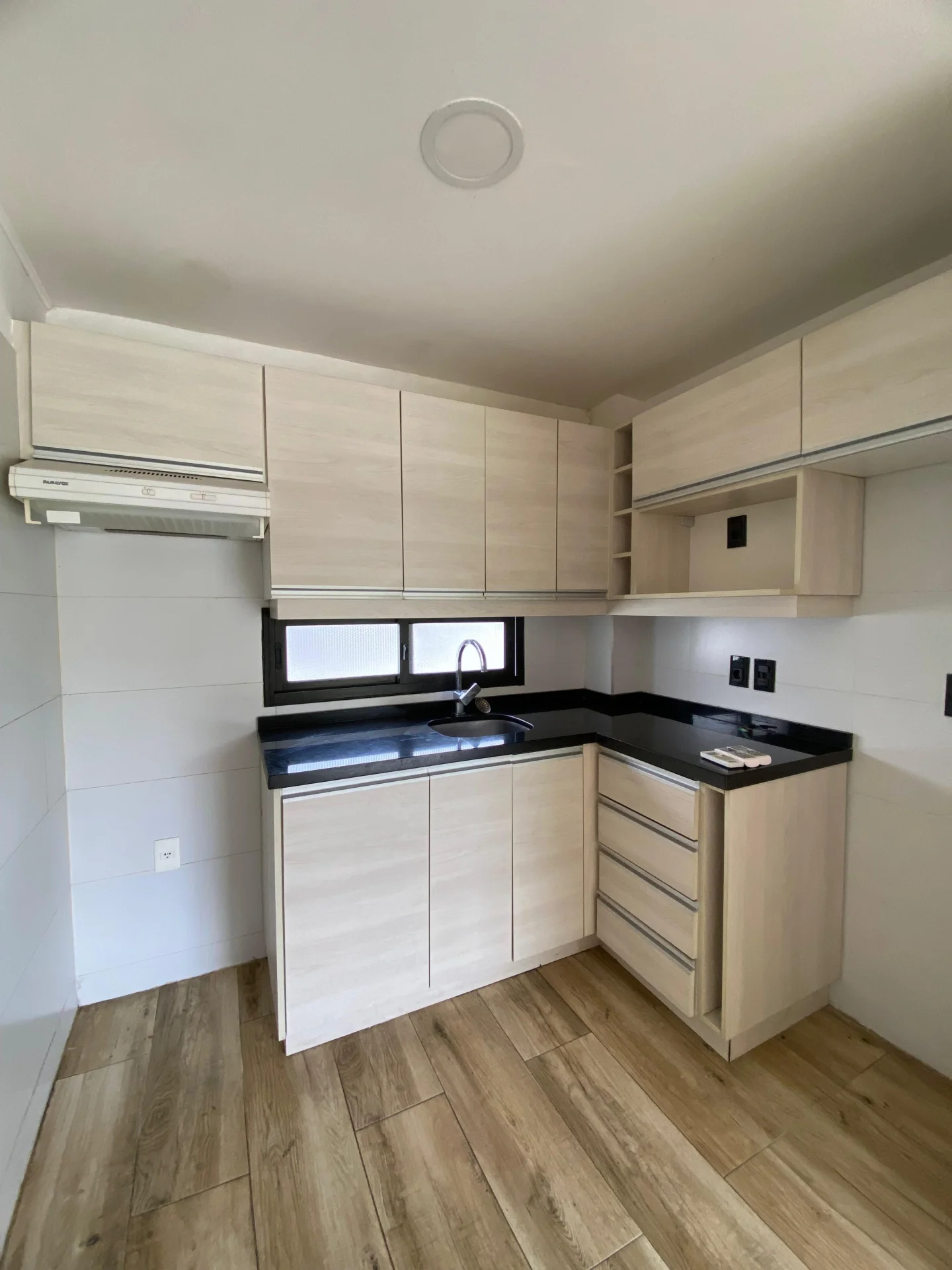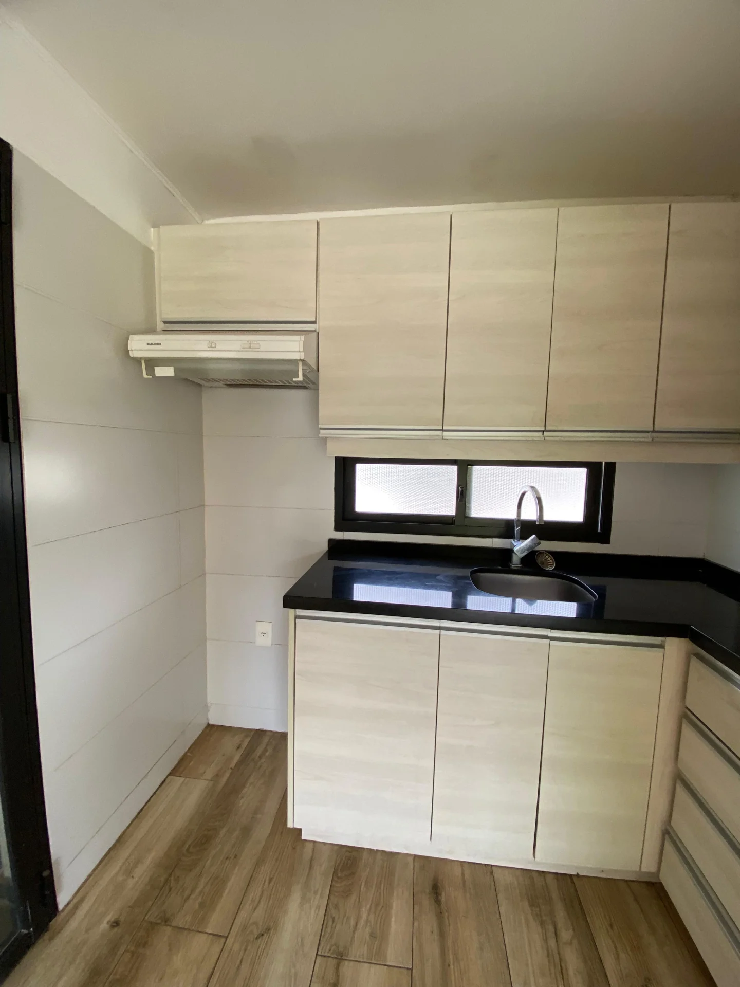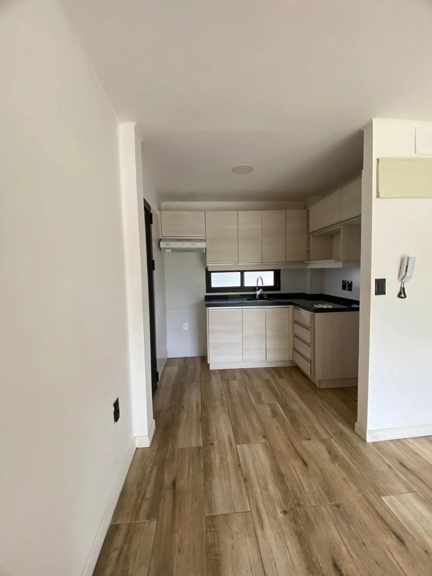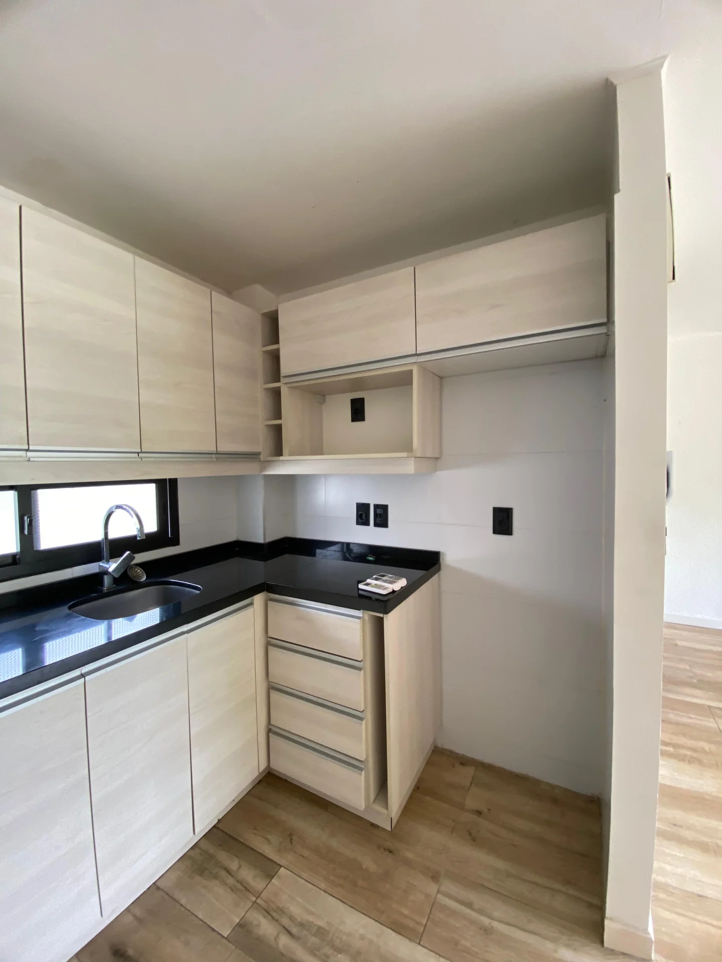 Cocina definida con gran mesada en L, con muebles bajo y sobre la misma, campana extractora y salida a terraza lavadero.