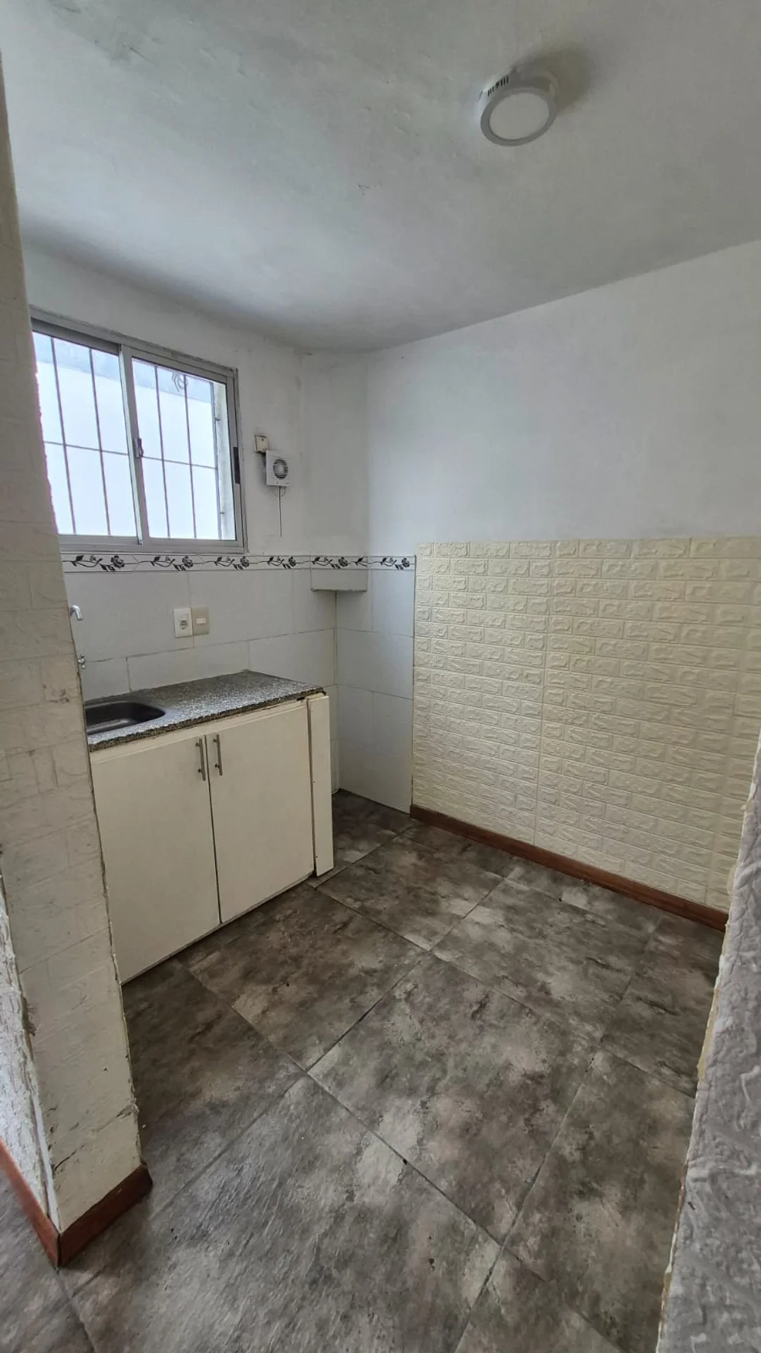 Cocina con piso de cerámica, mesada de granito y ventana de aluminio