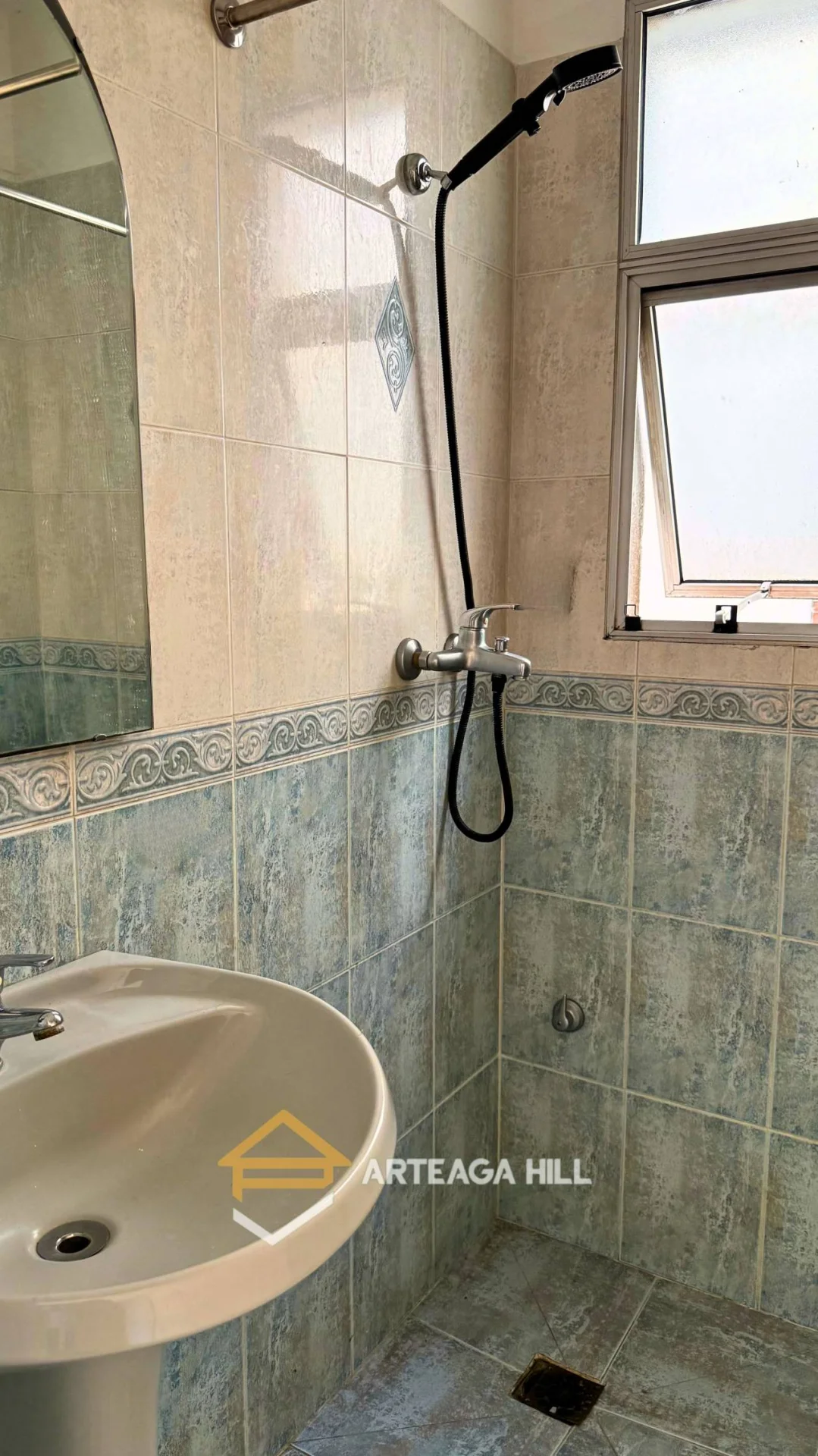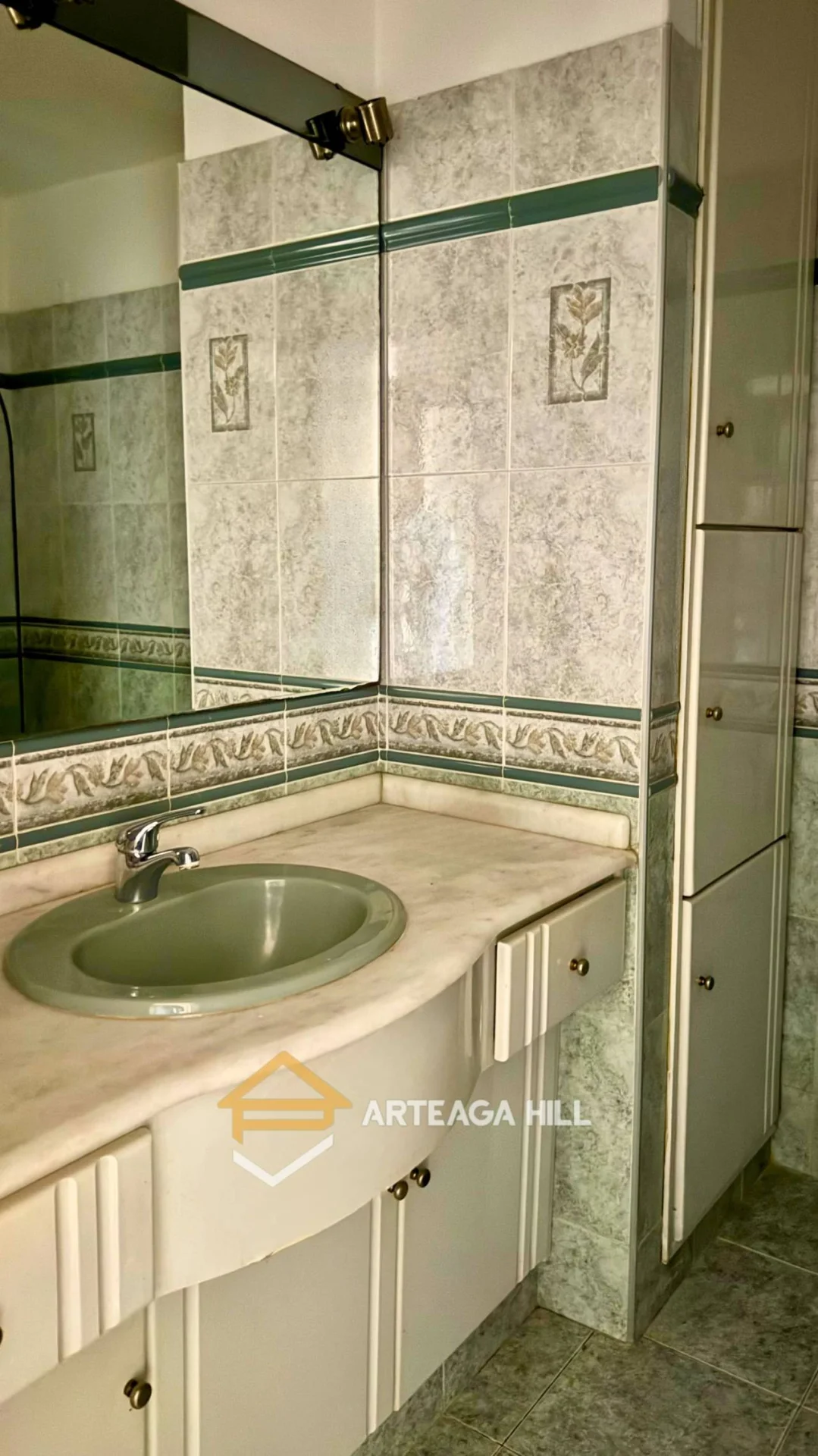 Baño principal amplio, equipado con mampara y mueble empotrado.
