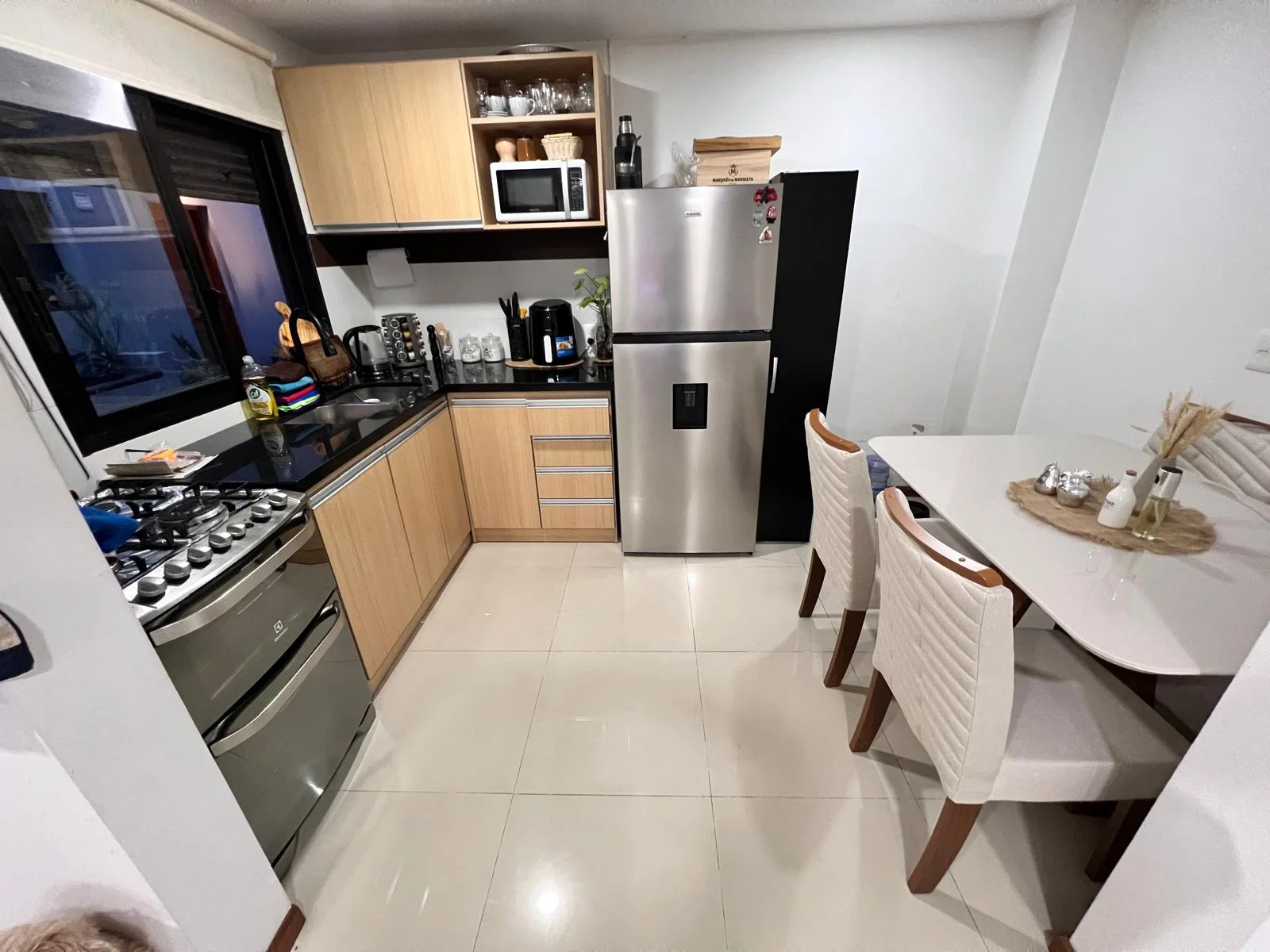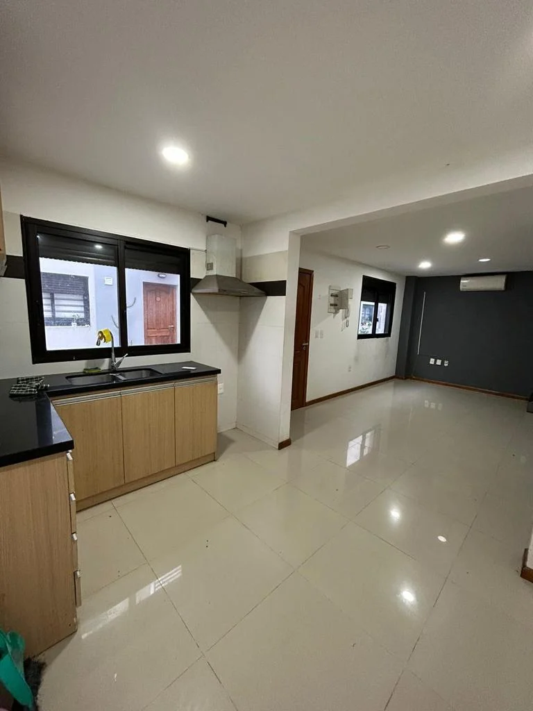 Cocina integrada con gran mesada y muebles bajo y sobre mesada, ventana con persiana y campana extractora.