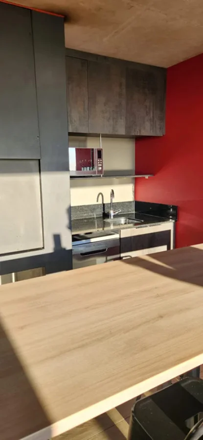 . Cocina integrada con placares, anafe de vitrocerámica, campana extractora y heladera frigobar