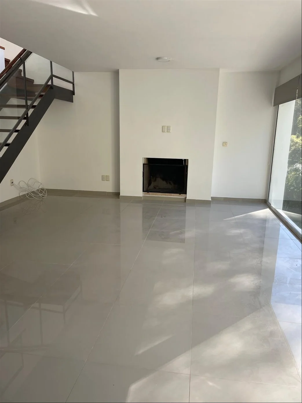 Living comedor con estufa a leña y salida a terraza, ventanales de piso a techo.