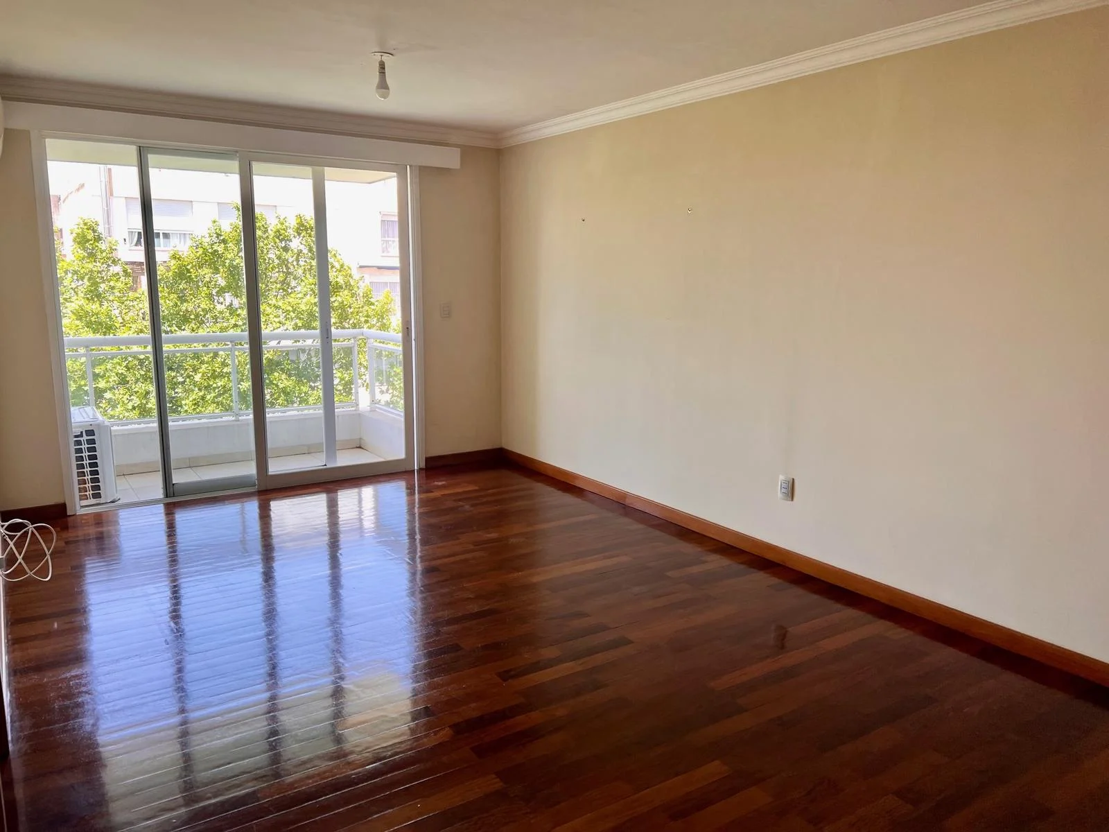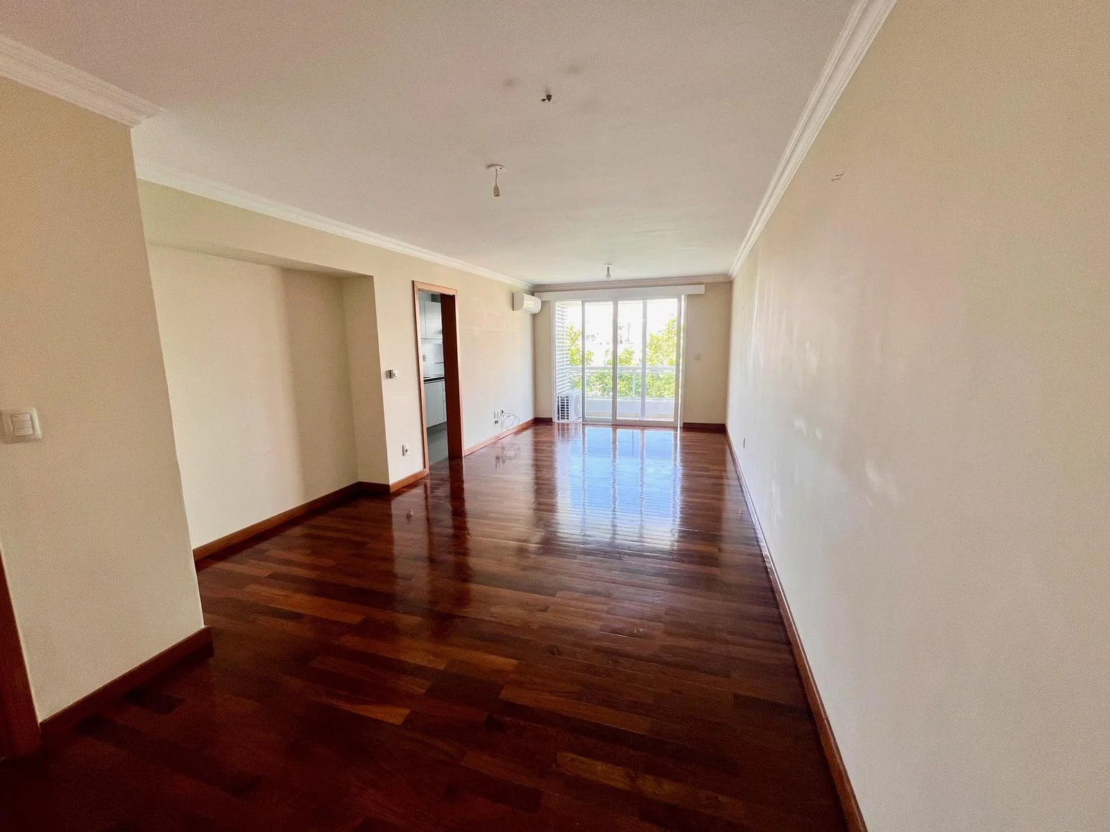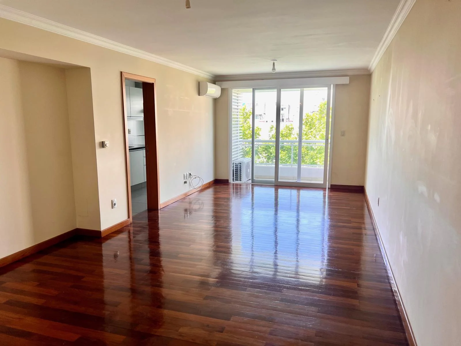 Entrada a living comedor amplio, con pisos de lapacho y salida a balcón con vista lateral despejada sobre los árboles y literal al Parque.
