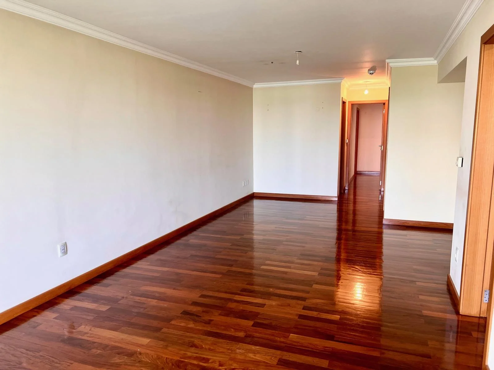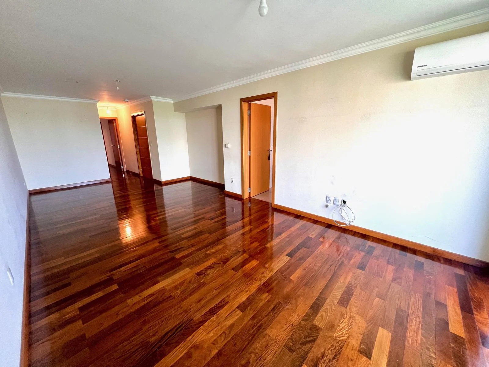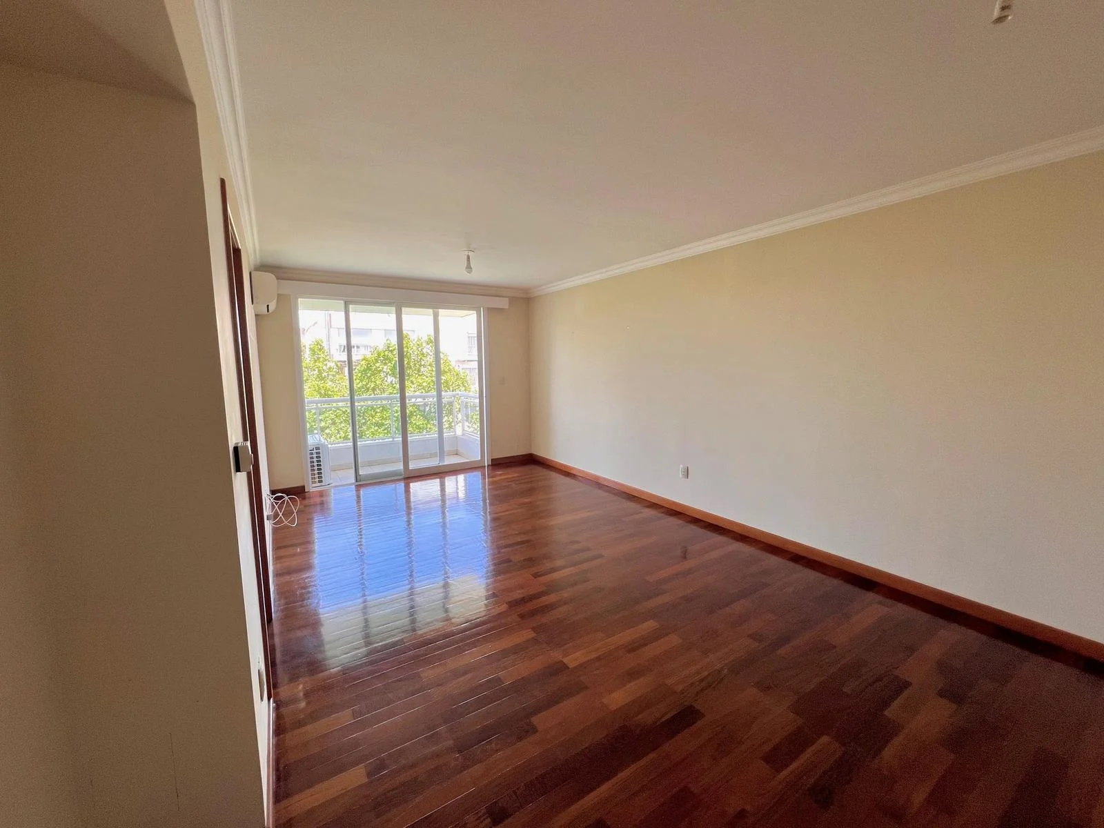 Entrada a living comedor amplio, con pisos de lapacho y salida a balcón con vista lateral despejada sobre los árboles y literal al Parque.