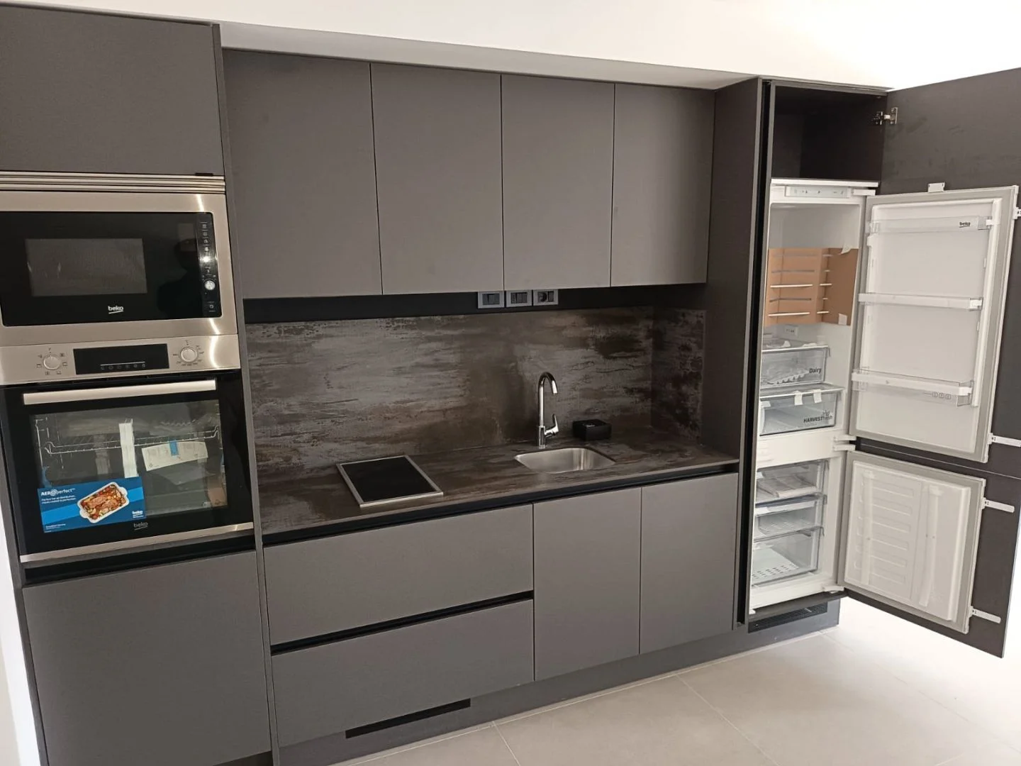 Muebles Todesquini con cocina, heladera, microondas y campana, todo integrado en un mueble especialmente diseñado para que se integra al ambiente de manera natural.