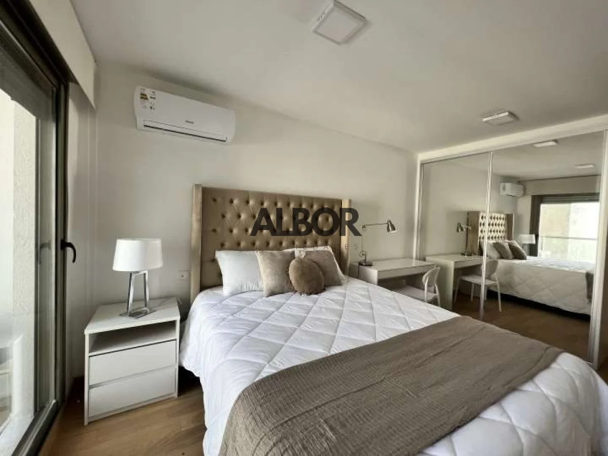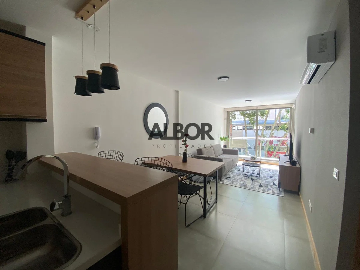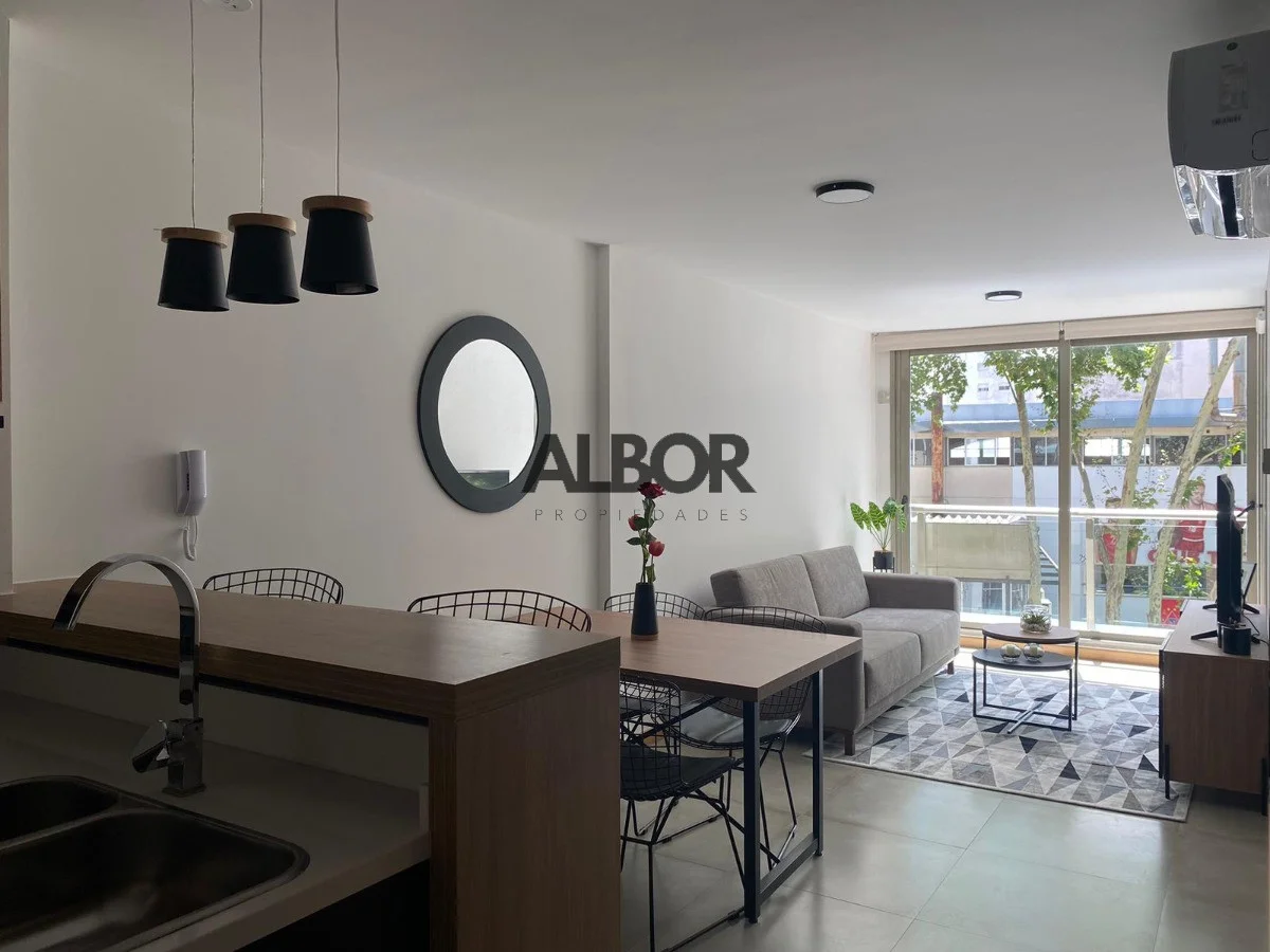 El apartamento de un dormitorio se alquila totalmente amoblado listo para mudarse, cuenta con cocina americana, barra desayunadora, equipado con cocina, heladera, calefón y todos los electrodomesticos necesarios, vajilla. Living comedor confortable y cama. Baño completo con finas terminaciones y mampara de cristal.