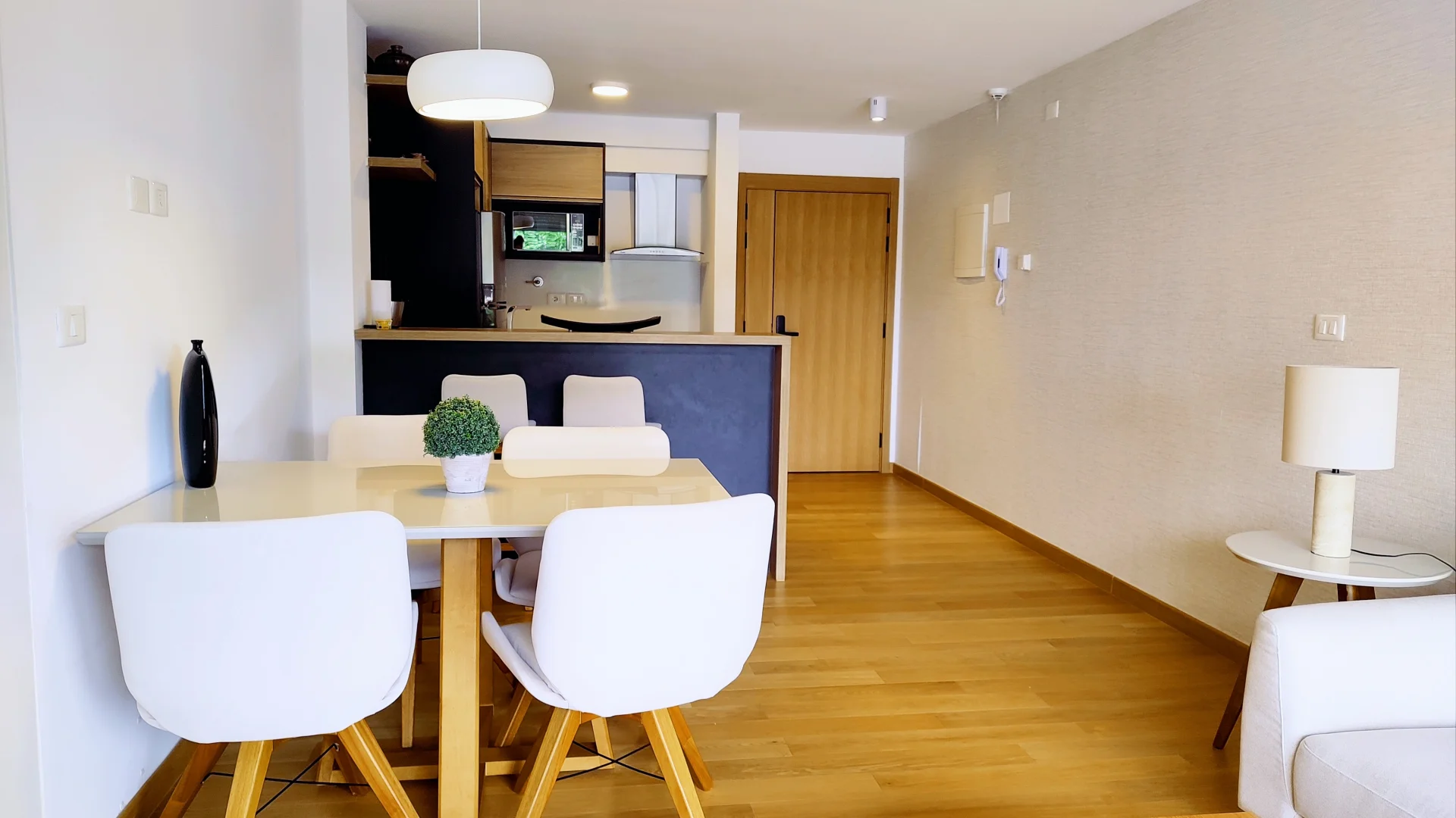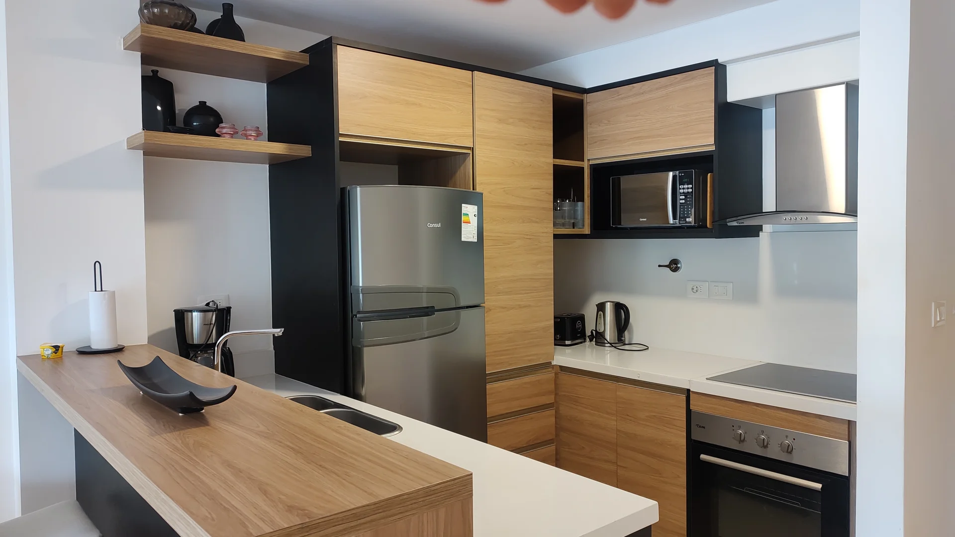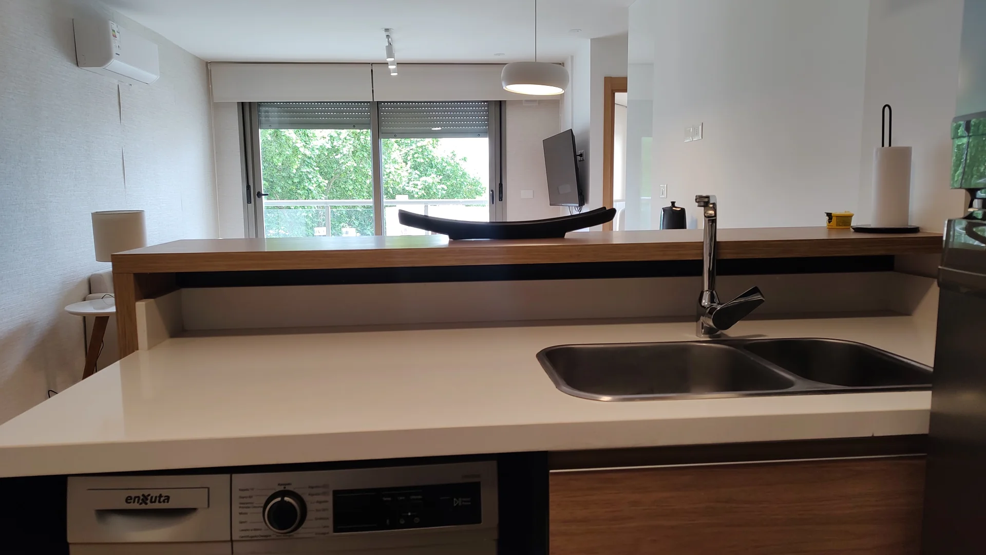 El diseño interior incluye un amplio living comedor equipado con sofá, TV y mesa de comedor, generando un ambiente confortable. La cocina integrada cuenta con heladera, anafe, horno, extractor, lavavajillas, microondas y un sistema de almacenamiento mediante placares altos y bajos.