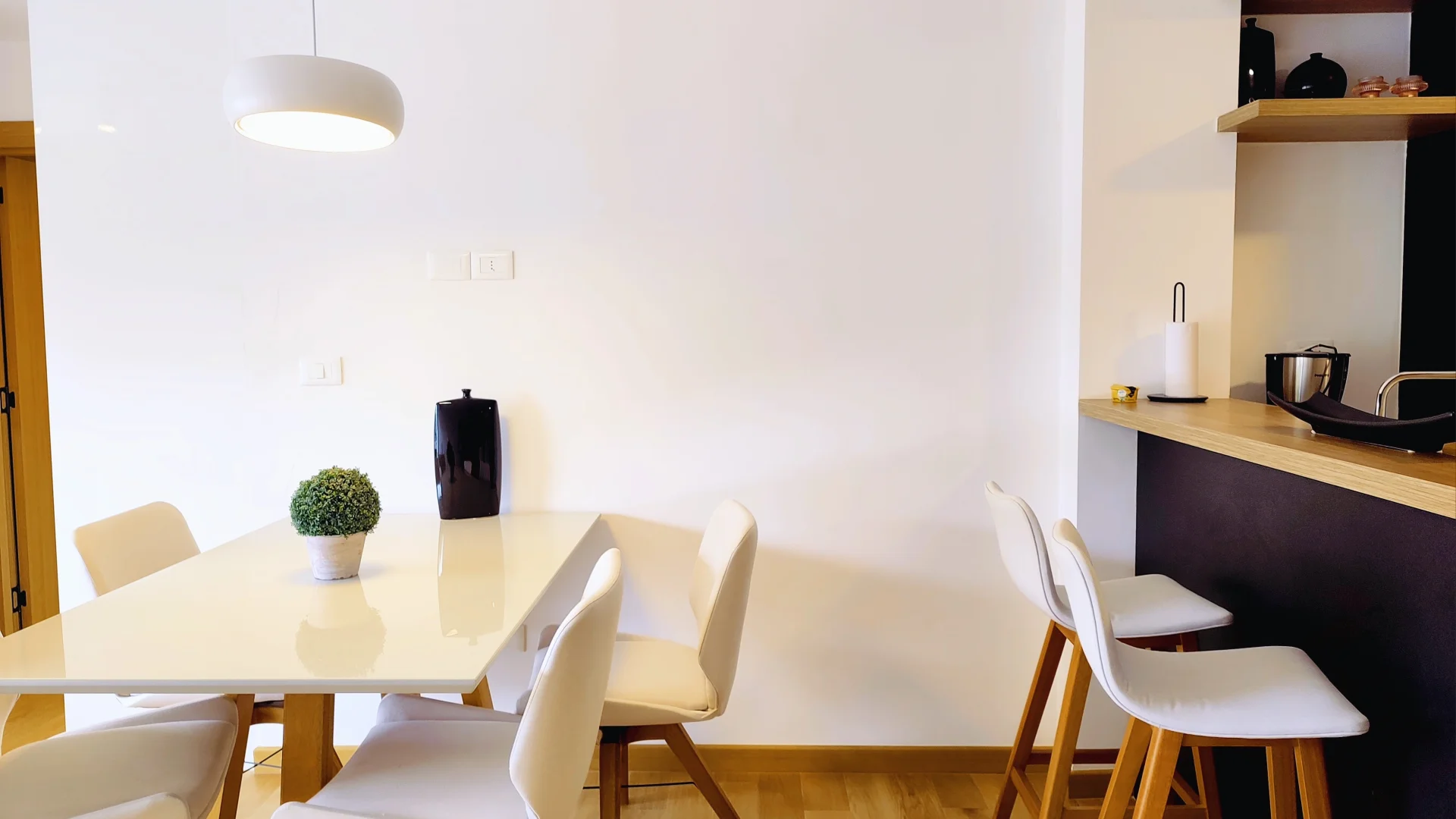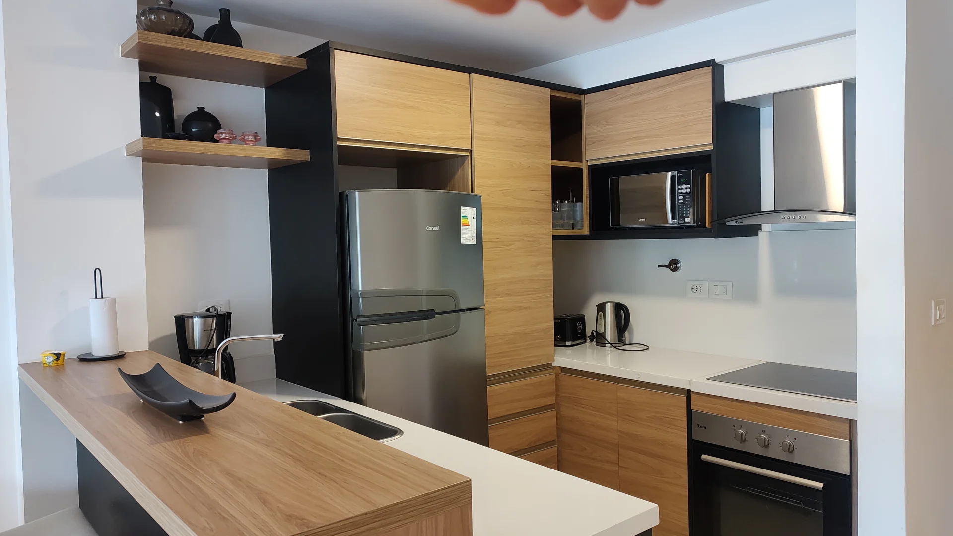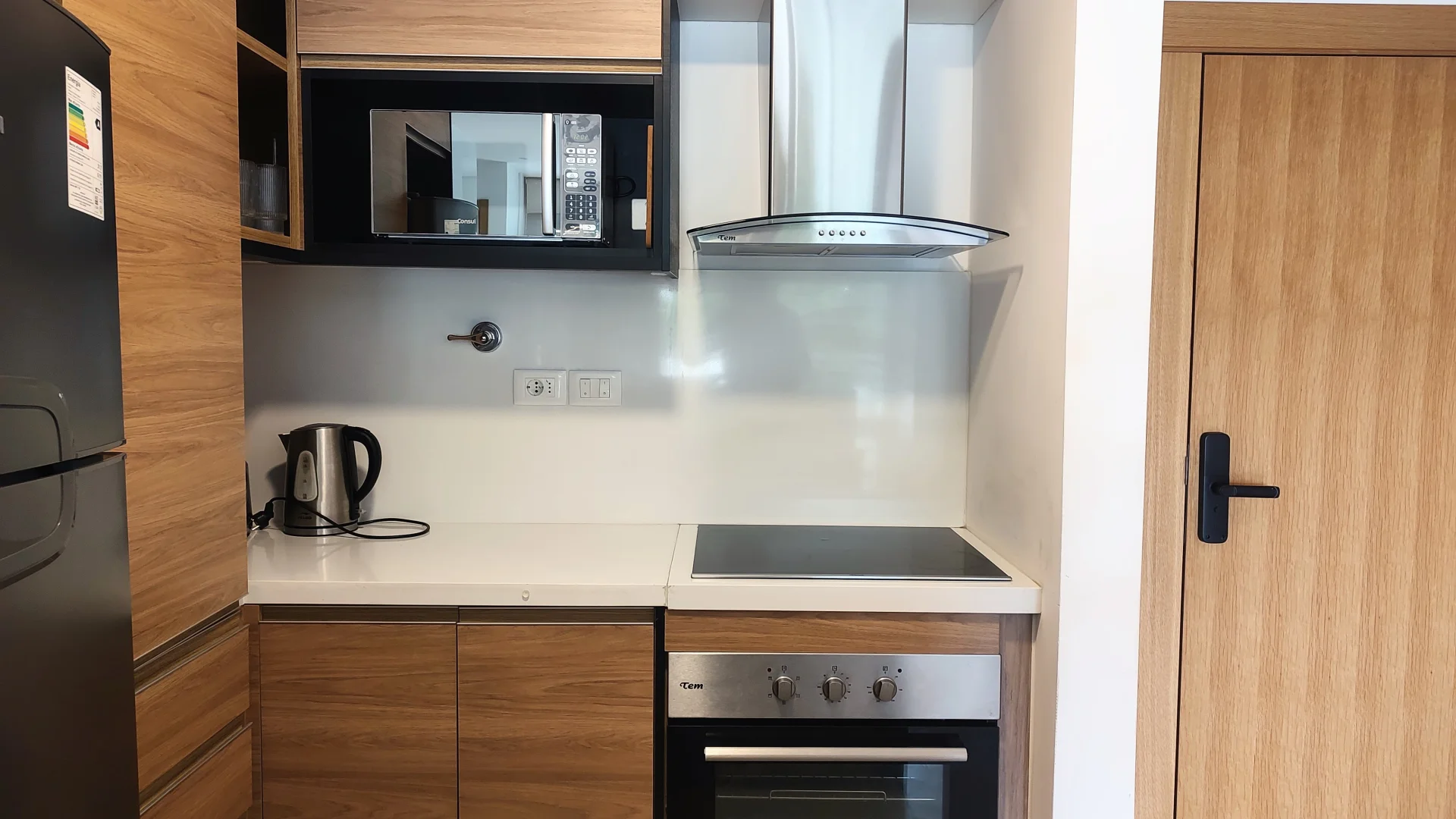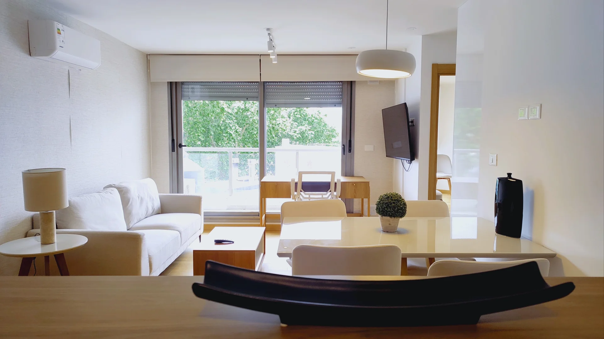El diseño interior incluye un amplio living comedor equipado con sofá, TV y mesa de comedor, generando un ambiente confortable. La cocina integrada cuenta con heladera, anafe, horno, extractor, lavavajillas, microondas y un sistema de almacenamiento mediante placares altos y bajos.