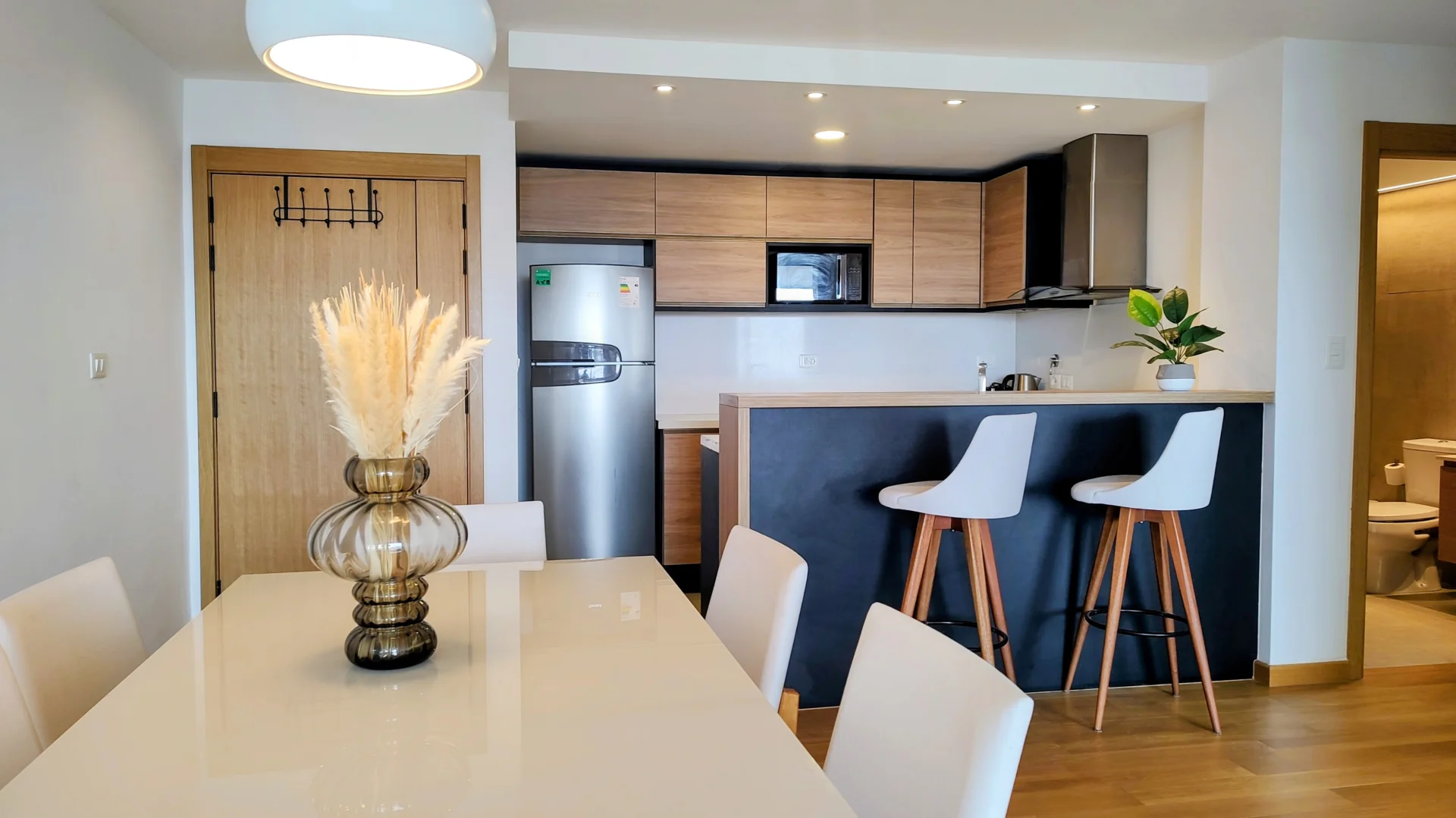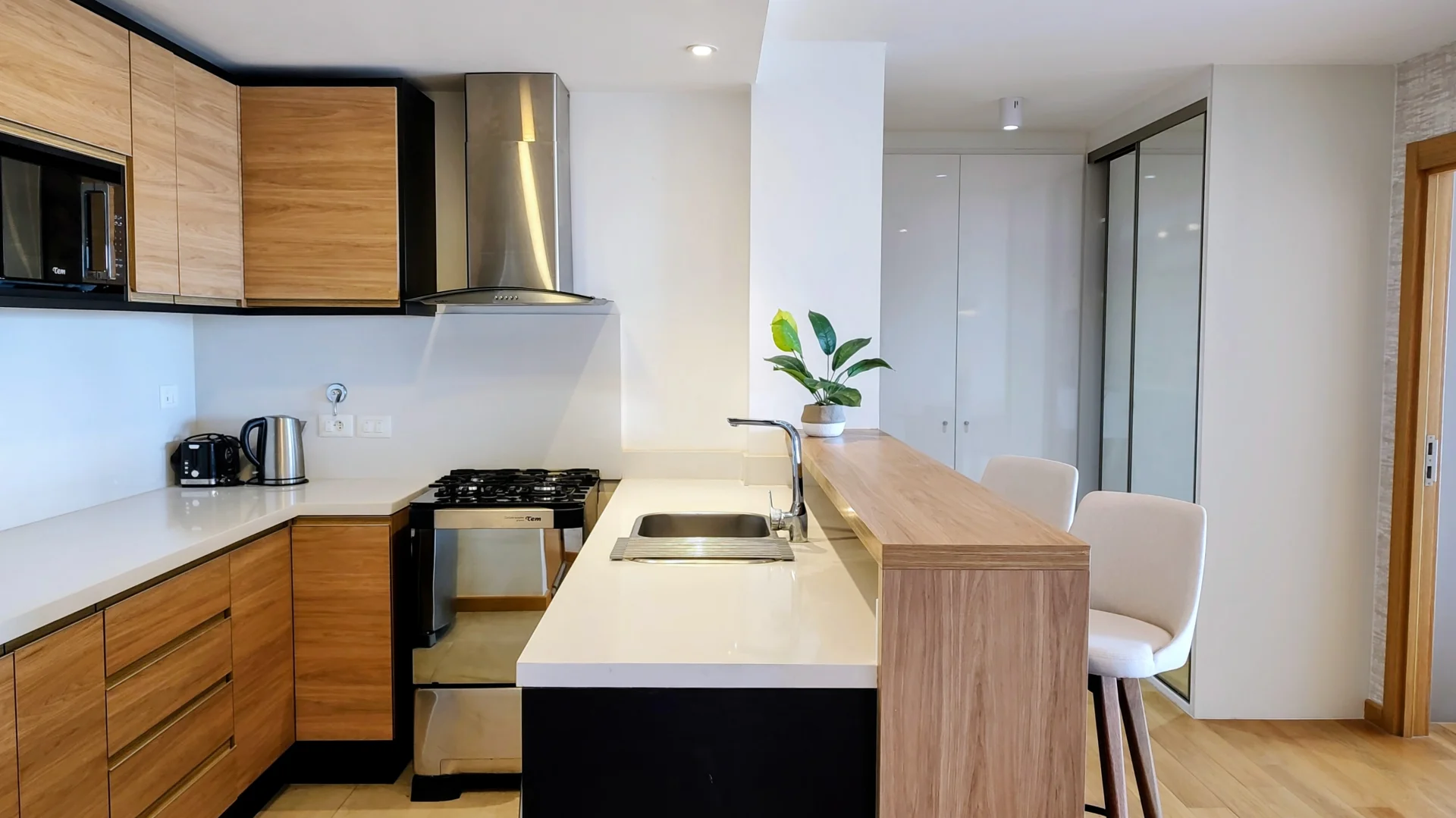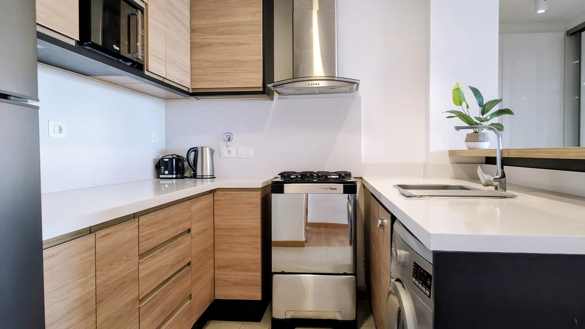 La cocina integrada está equipada con heladera, anafe, horno, extractor, lavavajillas y microondas, complementada con placares alto y bajo mesada que optimizan el almacenamiento.