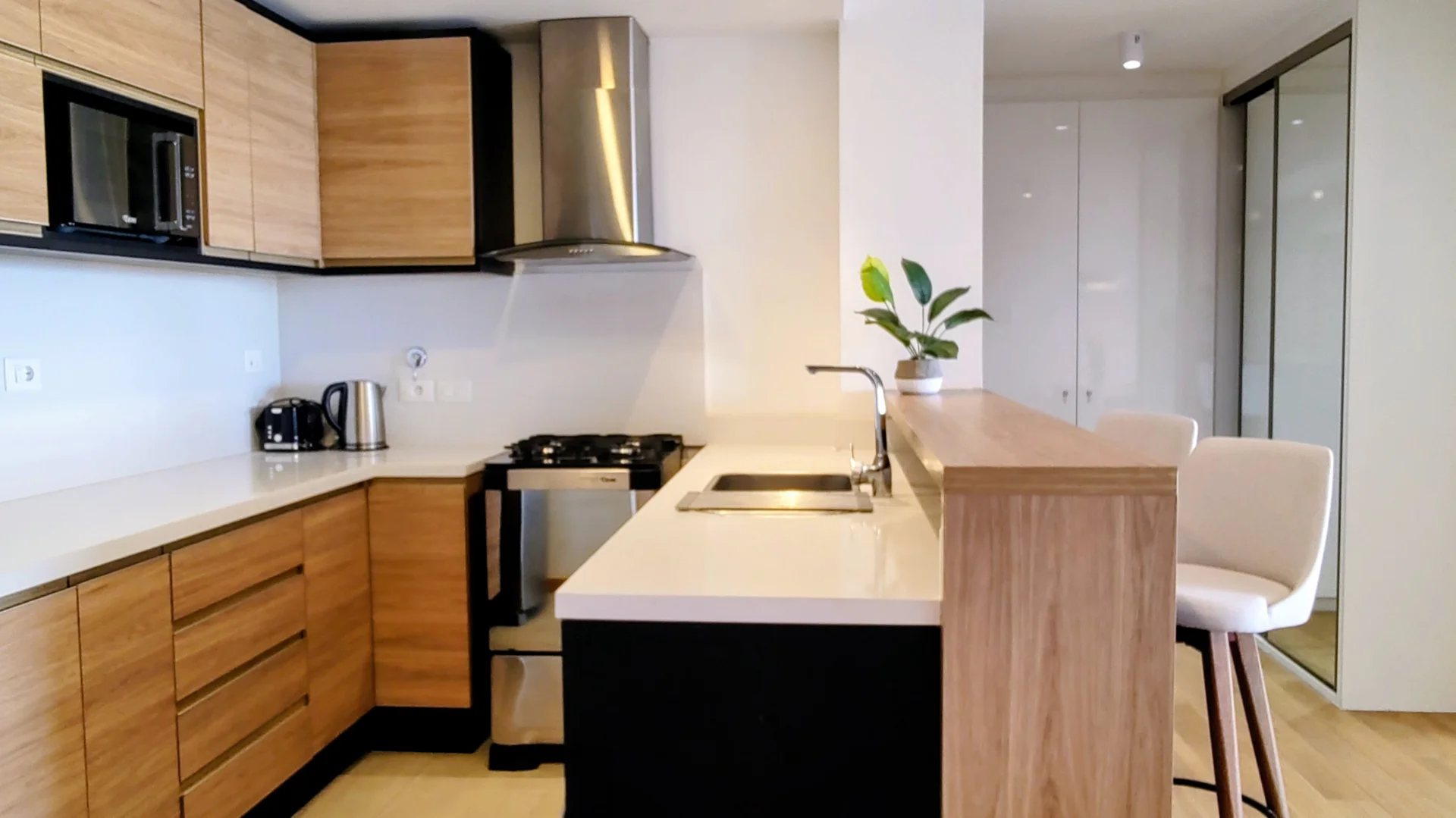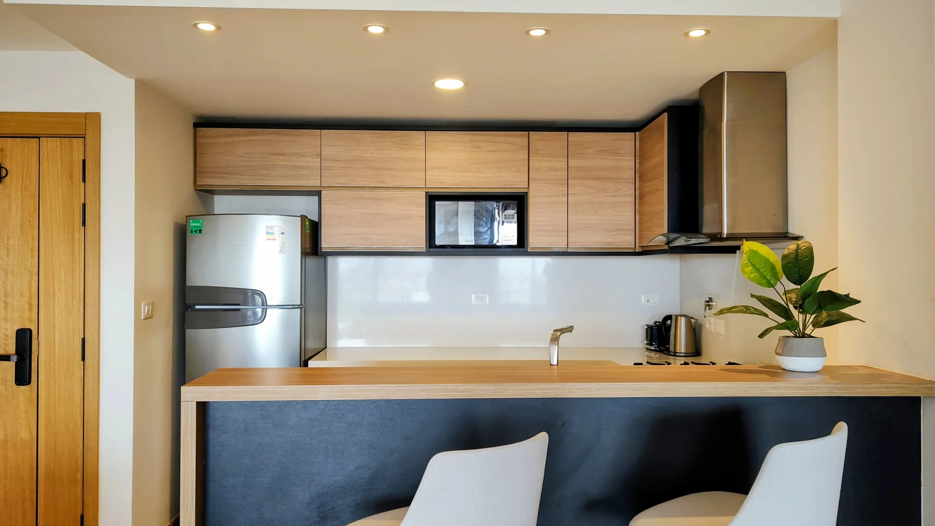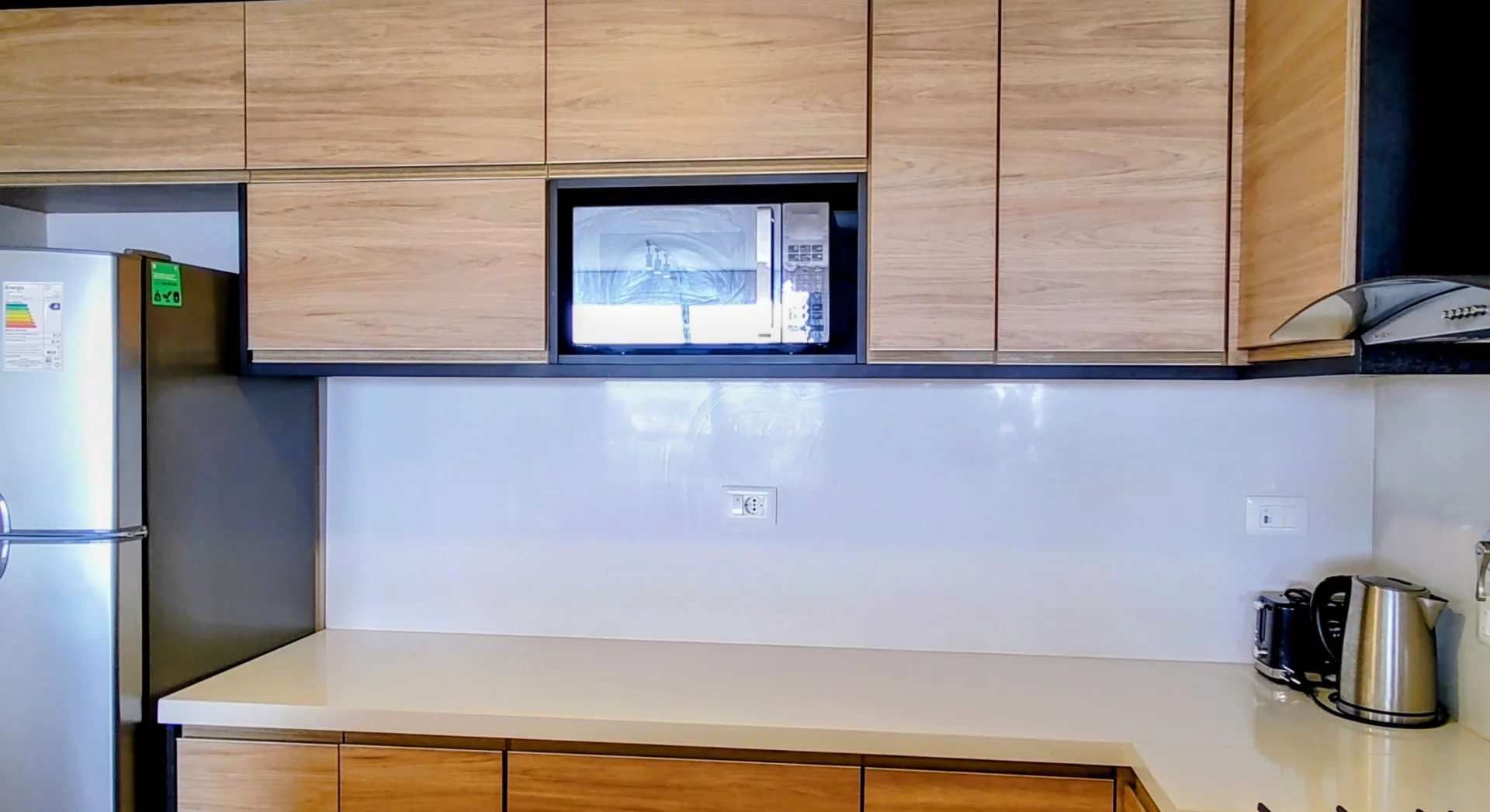 La cocina integrada está equipada con heladera, anafe, horno, extractor, lavavajillas y microondas, complementada con placares alto y bajo mesada que optimizan el almacenamiento.