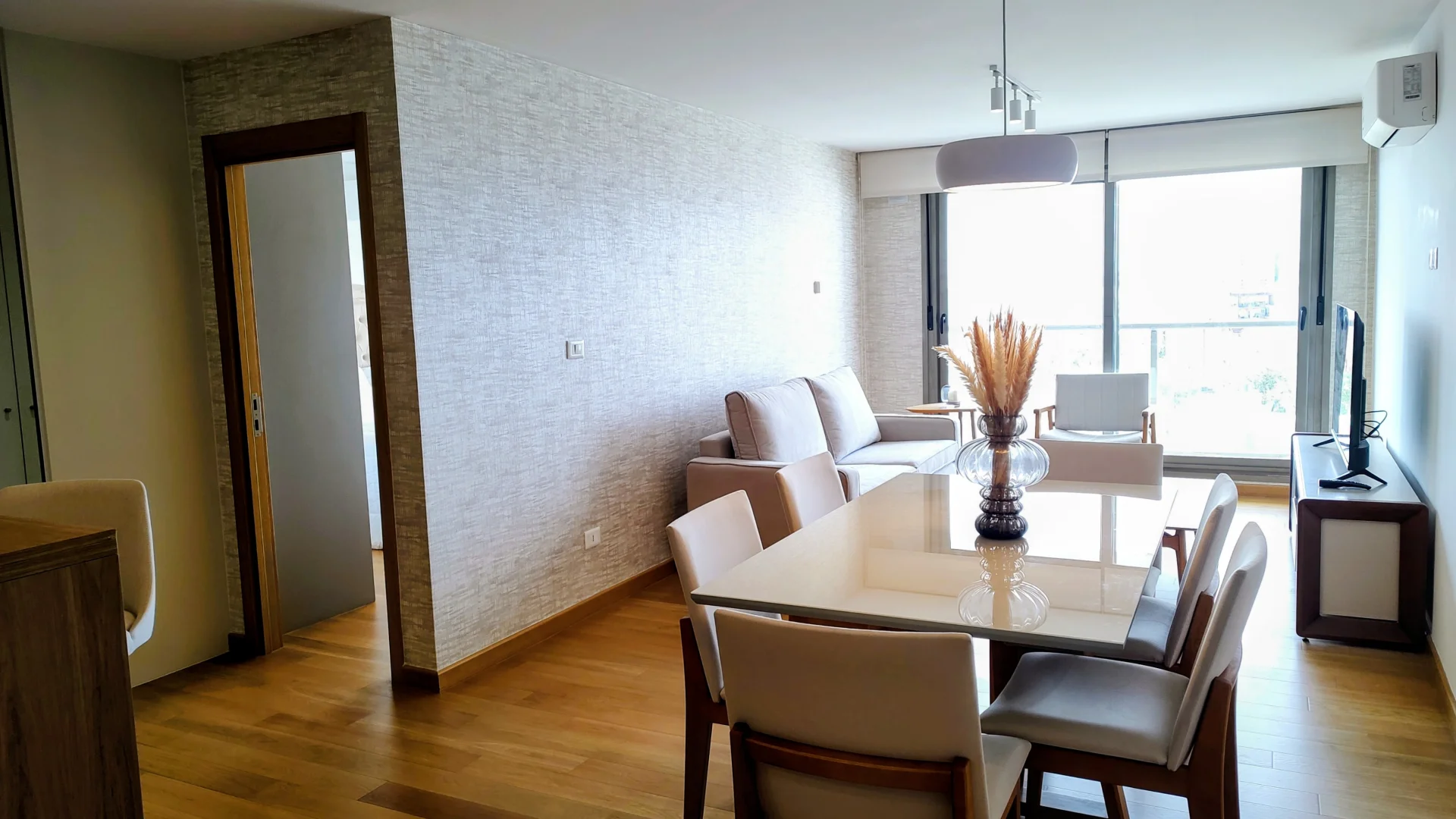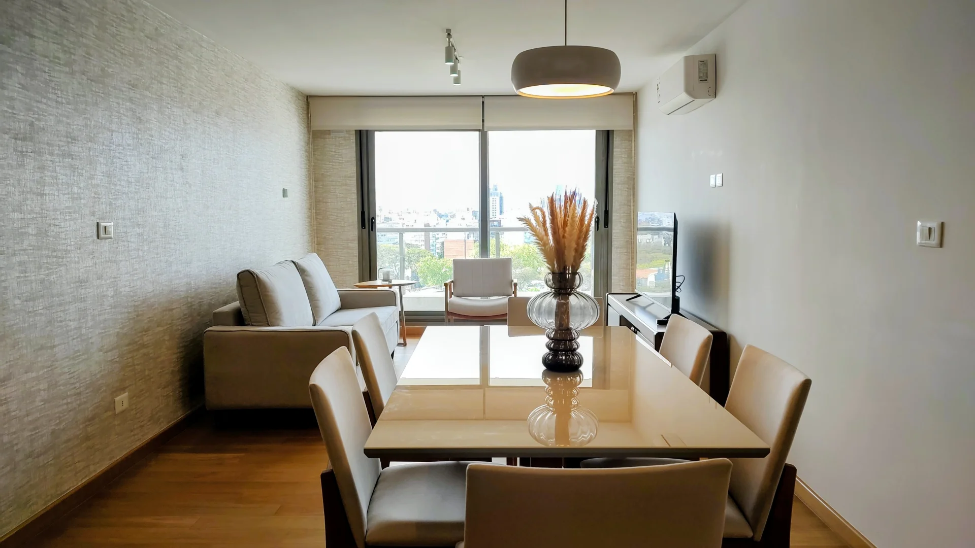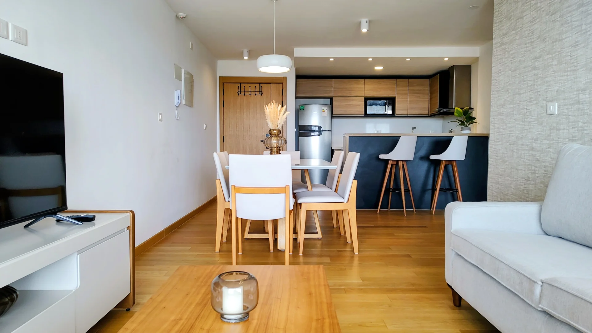El living comedor, diseñado para el máximo confort, incluye un sofá, sillón, TV y una elegante mesa comedor.