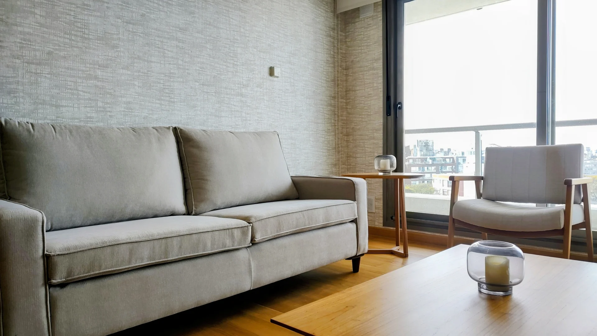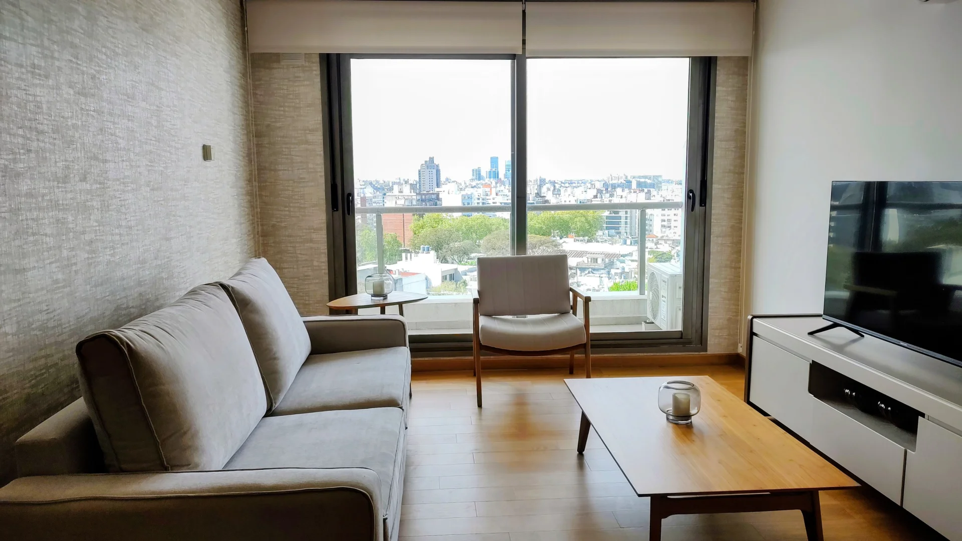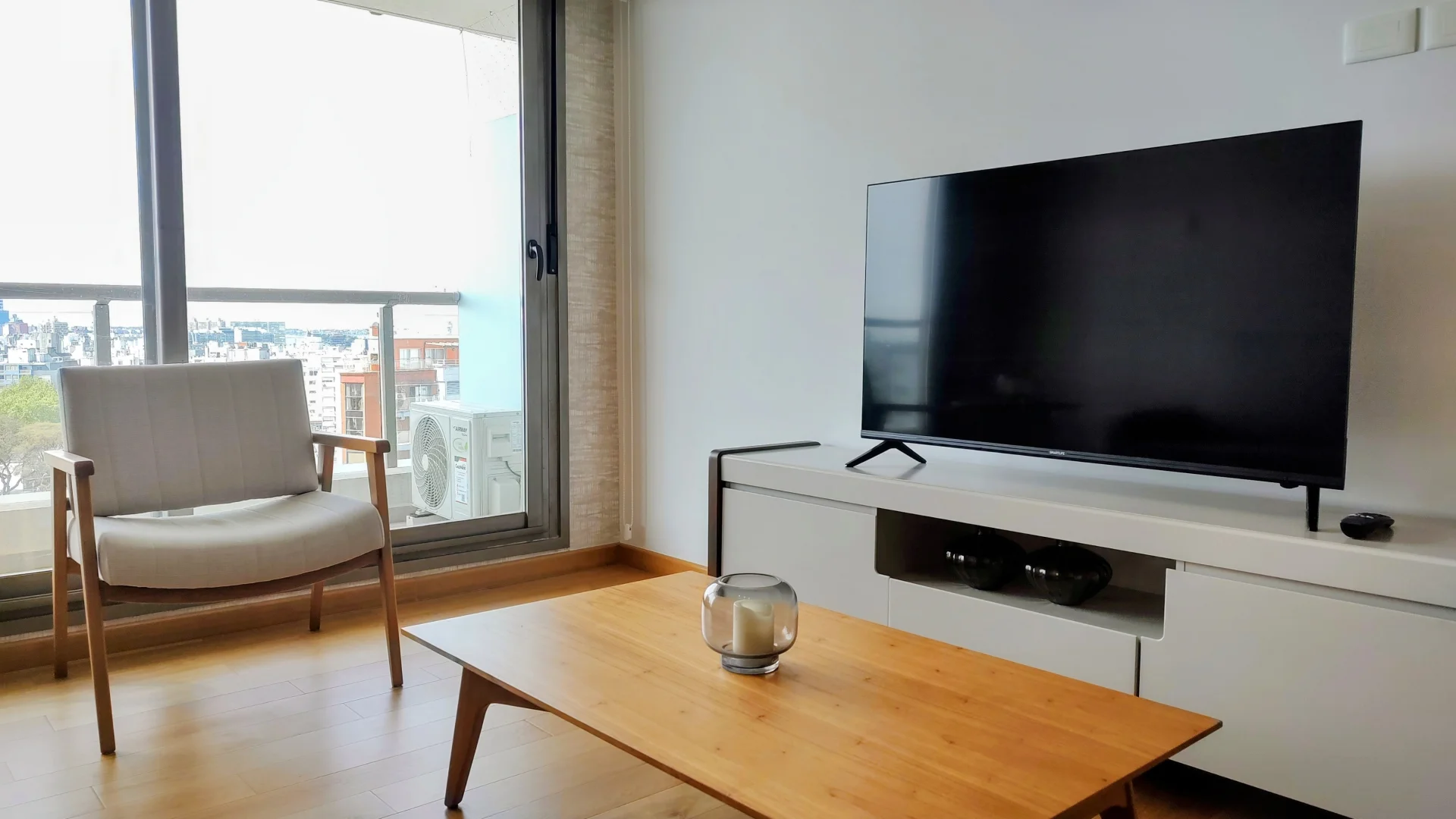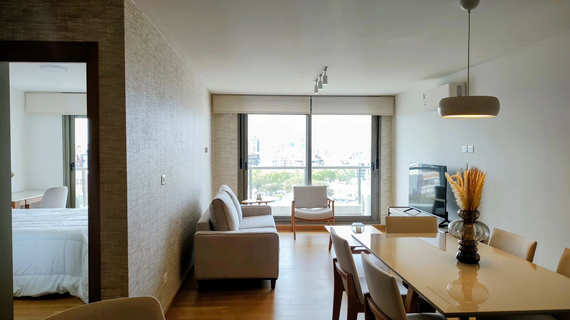 El living comedor, diseñado para el máximo confort, incluye un sofá, sillón, TV y una elegante mesa comedor.