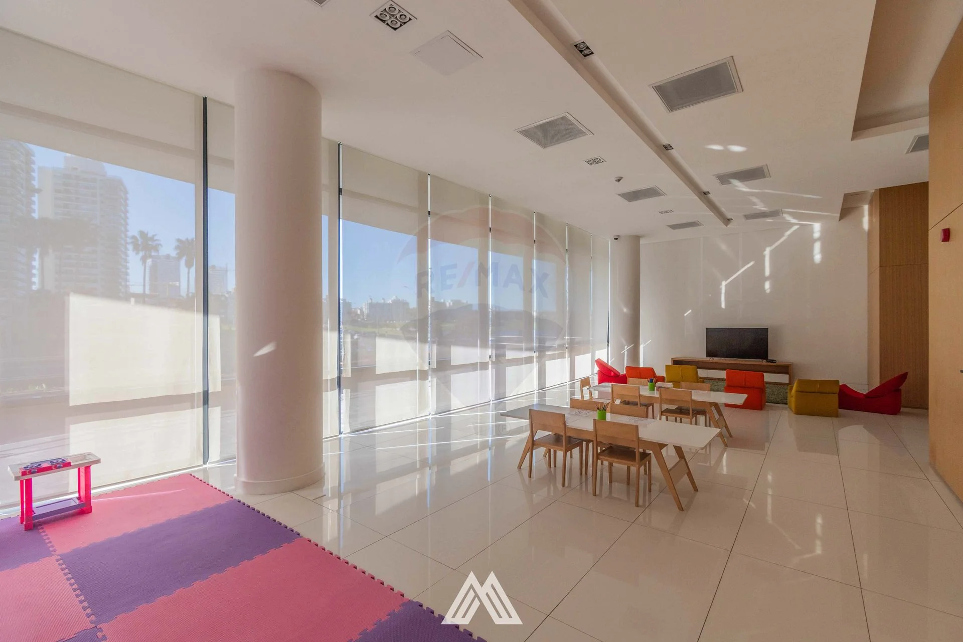 Al entrar nos recibe un living modernamente amoblado con barra que divide el living del área de la cocina la cual se encuentra 100% equipada, salida a un muy generoso balcón con sol garantizado y espacio para juego exterior.