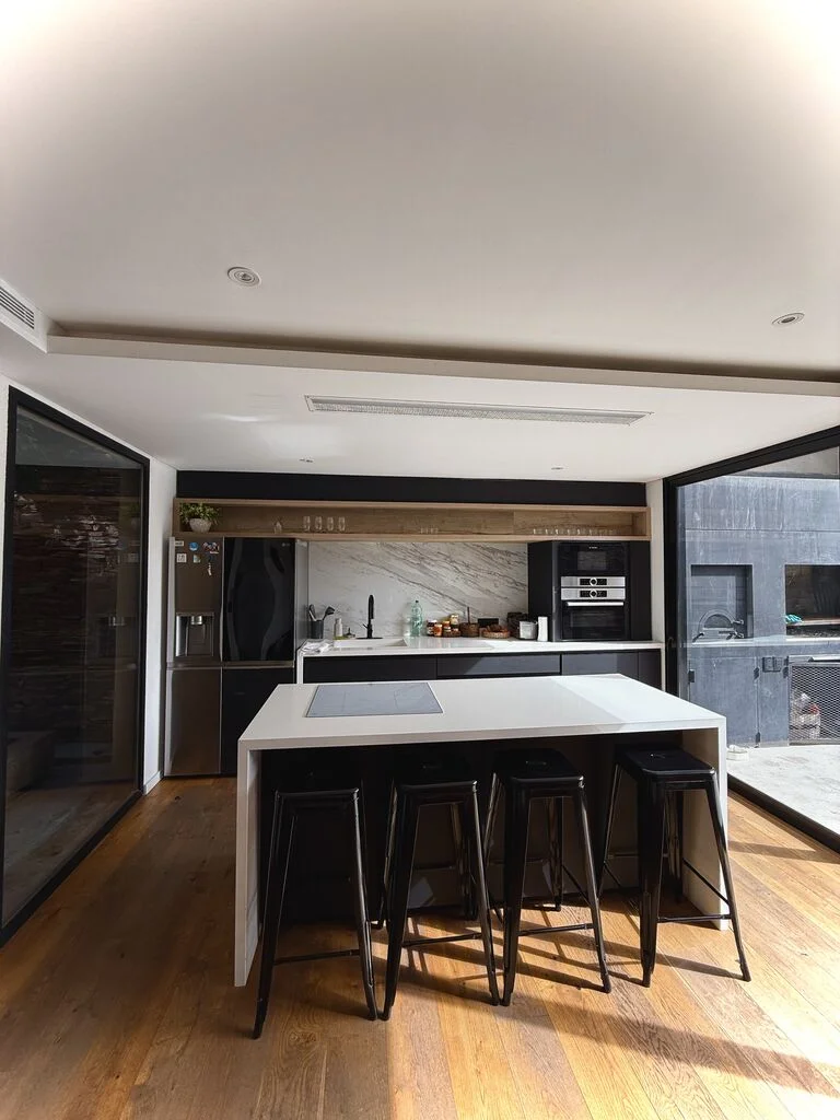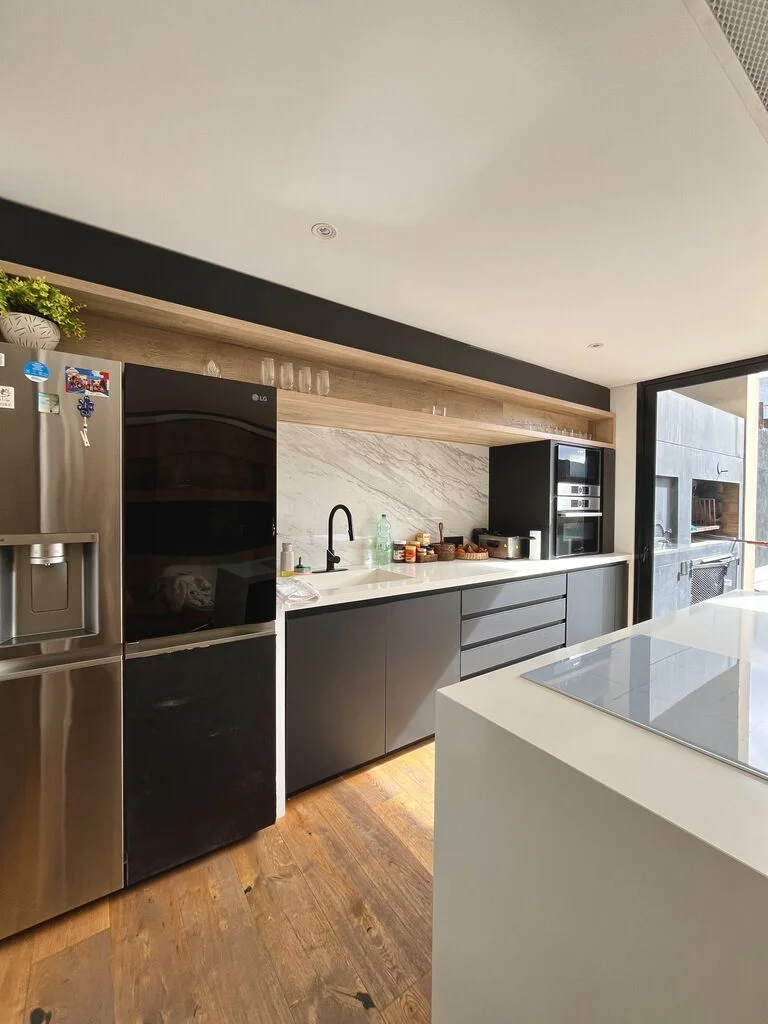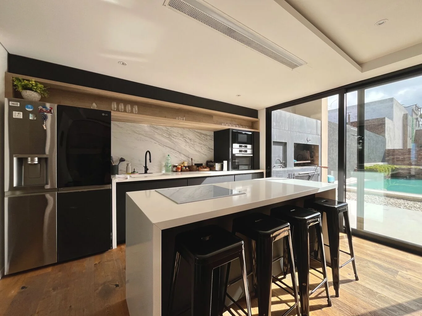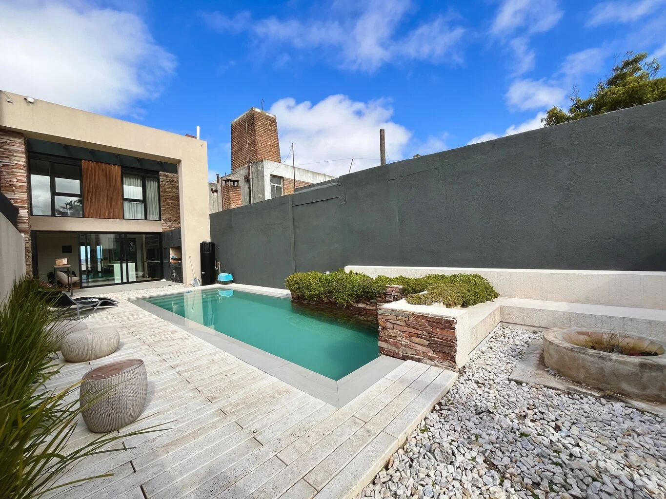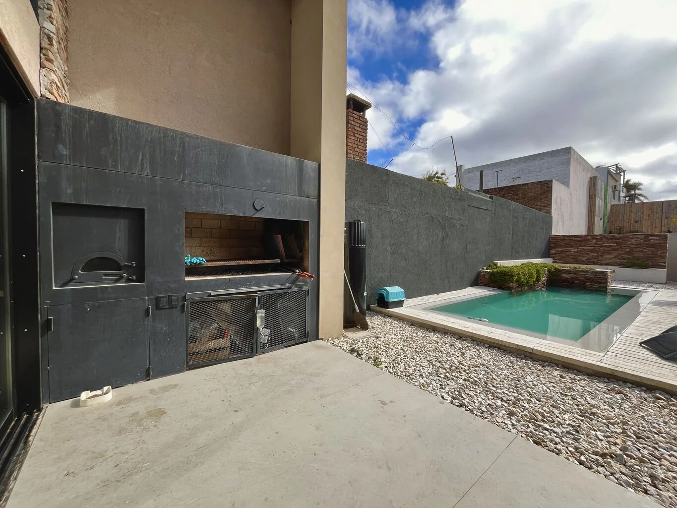 Baño social, cocina definida de generosas dimensiones con doble mesada y gran capacidad de almacenamiento, con salida directa a un patio íntimo con parrillero y piscina climatizada, ideal para disfrutar todo el año.
