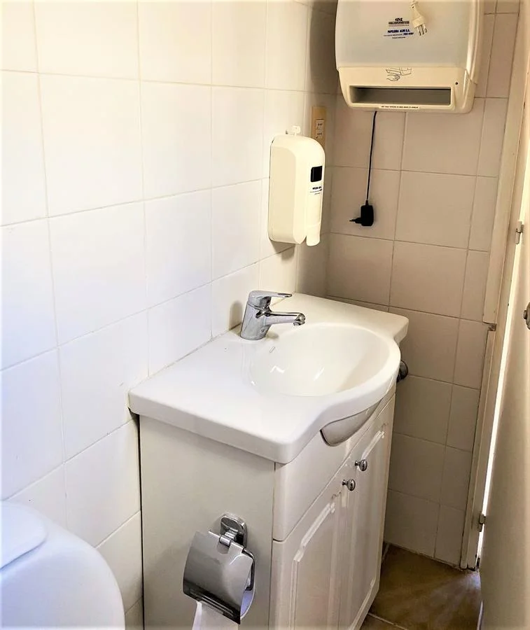 Cocina completa, ante cocina y lavadero (o vestuario de personal) con patio para colgar ropa con rejas.