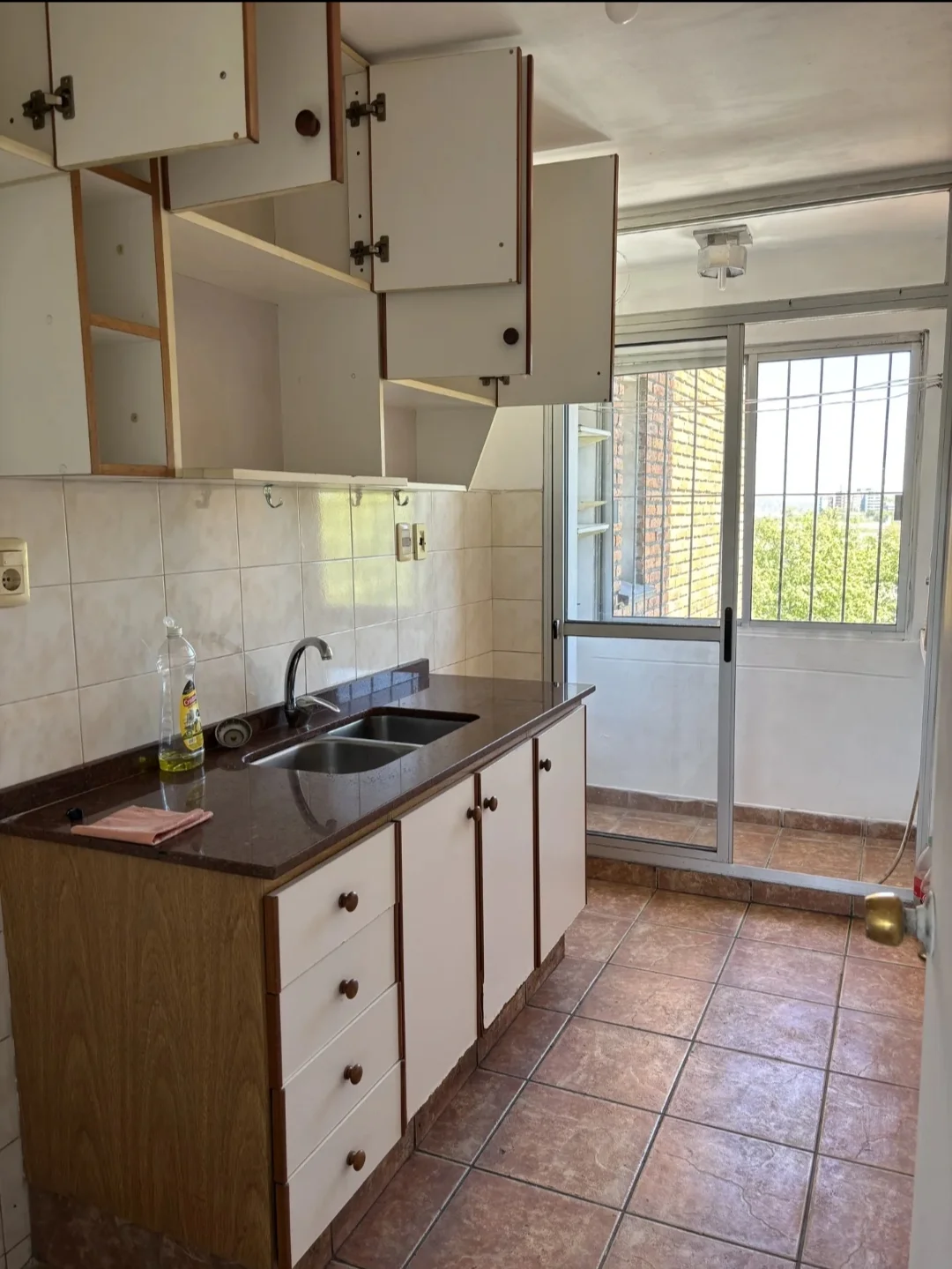 Cocina definida con muebles aéreos y bajo mesada, y salida a terraza lavadero, con instalación para lavarropas.