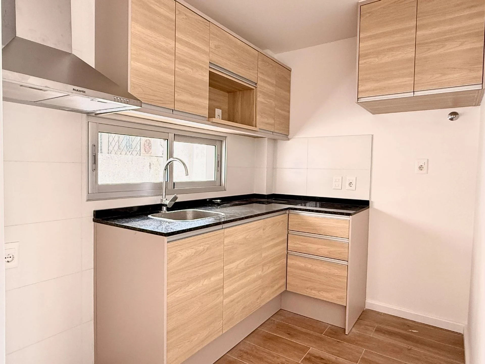 La cocina semi integrada presenta un diseño moderno, con muebles aéreos y bajo mesada, campana extractora y buen espacio de guardado, integrándose de forma funcional al área social.