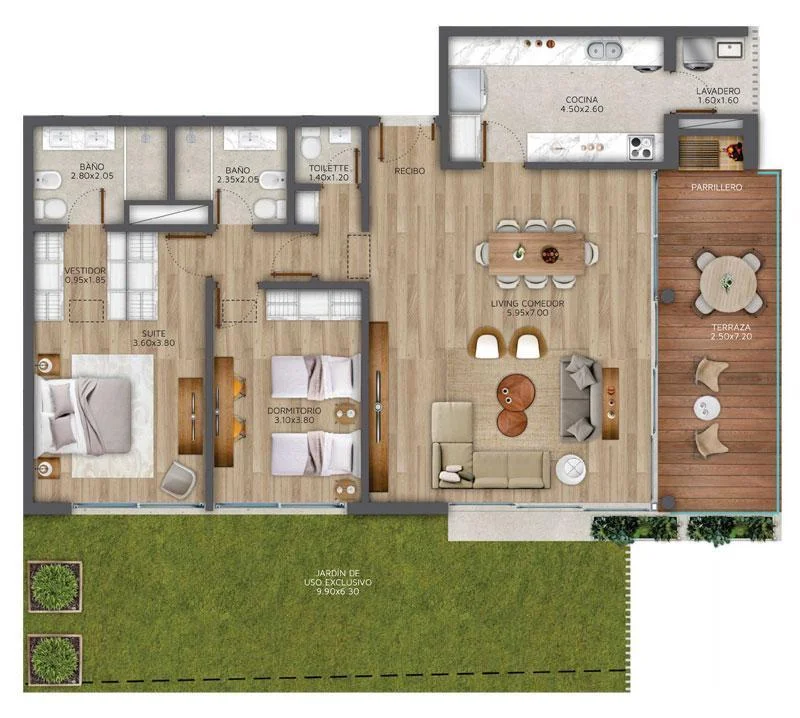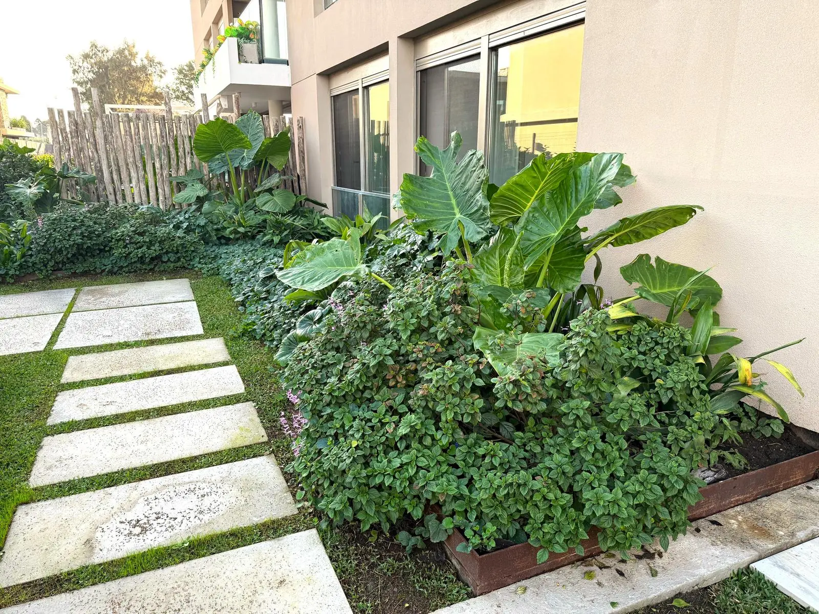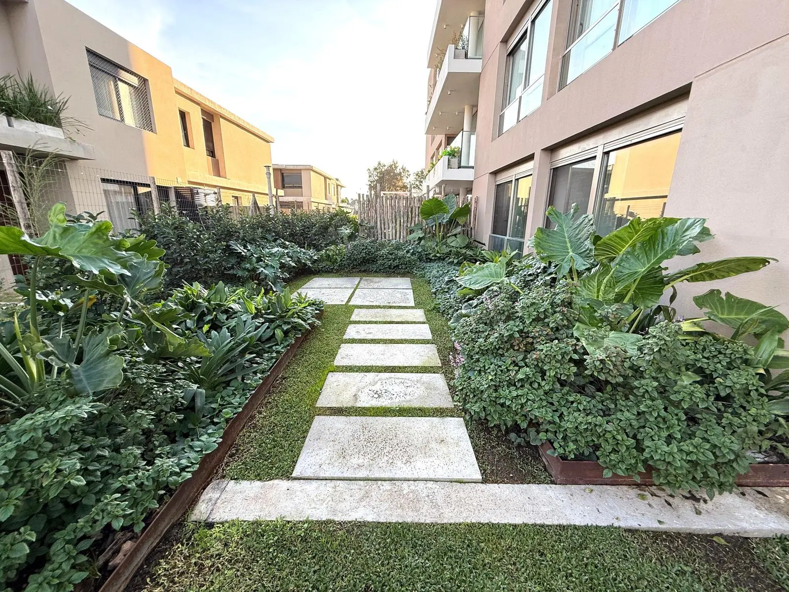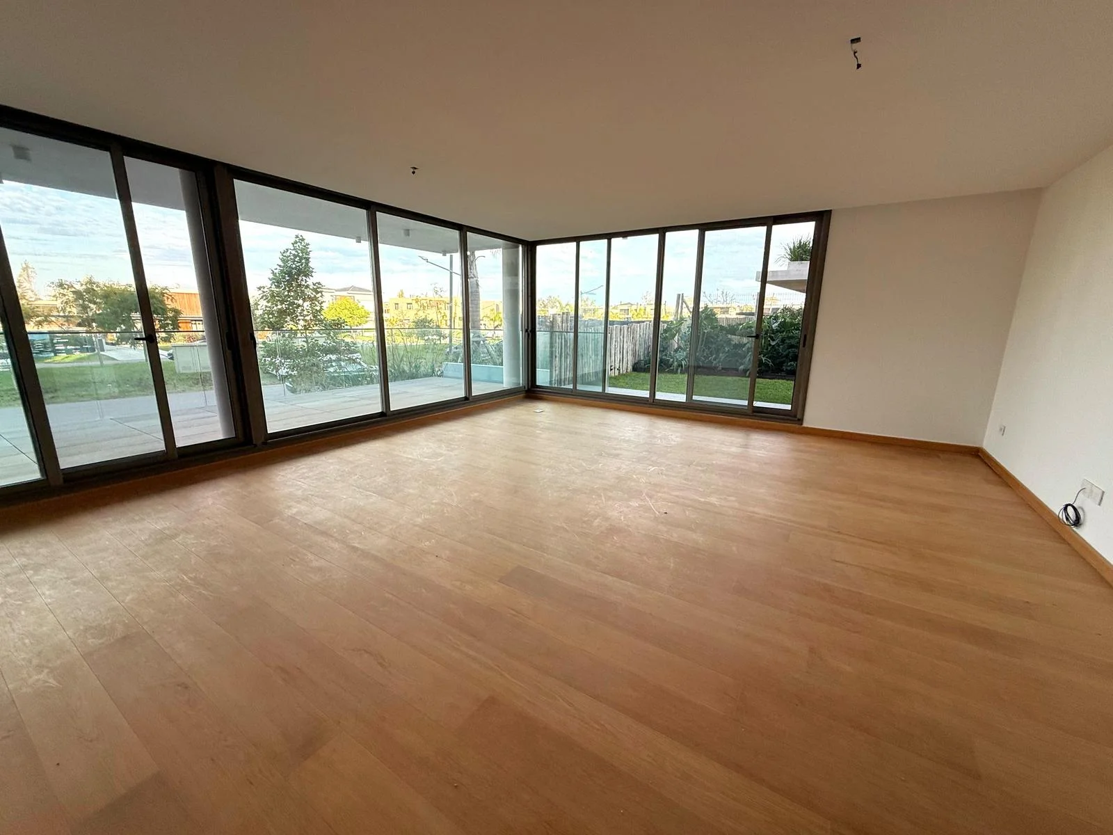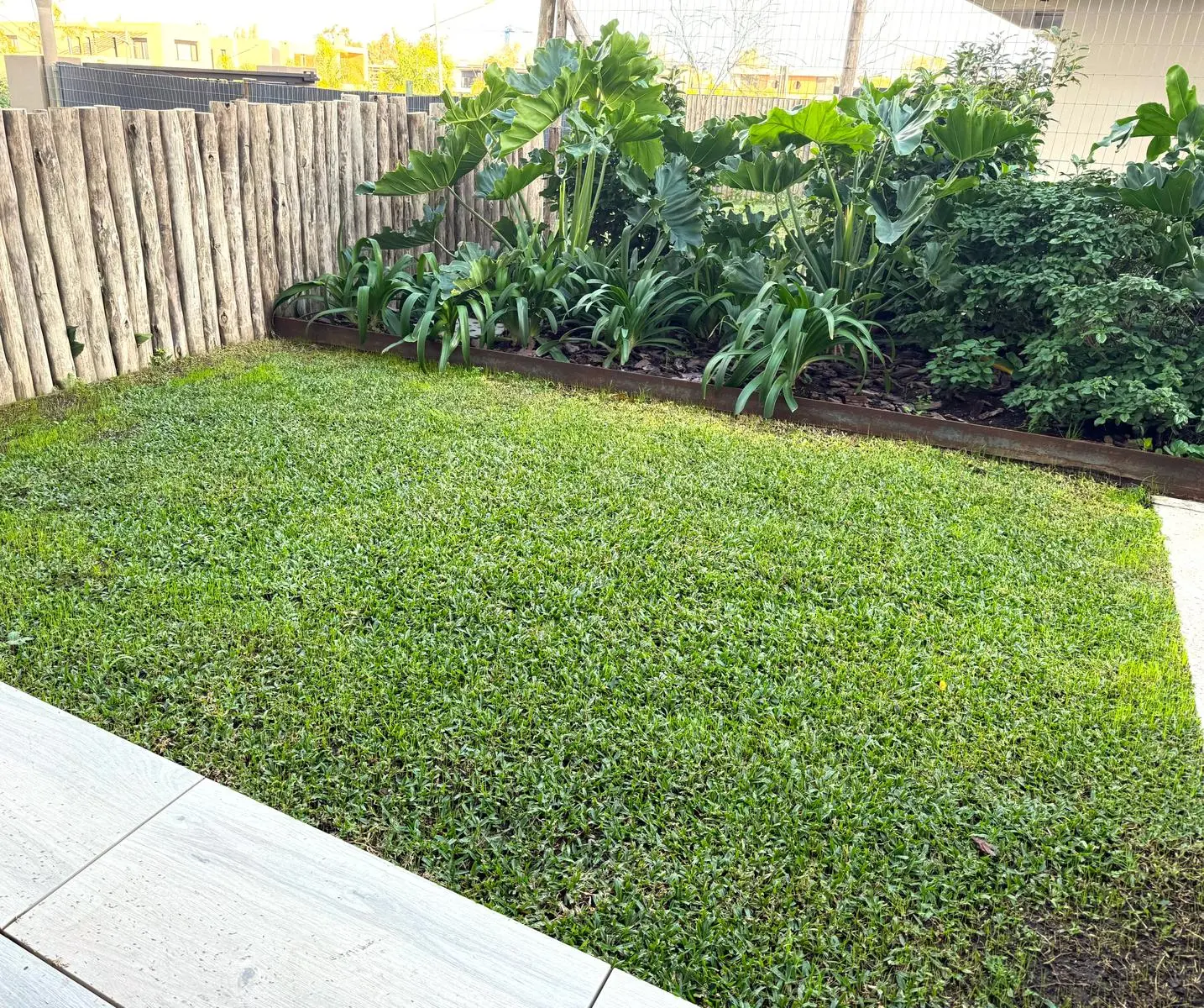Entrada a un amplio living comedor de forma cuadrada, con grandes ventanales de altura completa equipados con doble vidrio hermético (DVH), que garantizan excelente luminosidad y aislamiento térmico. Desde el living, se accede a una generosa terraza orientada al este, ideal para disfrutar del sol de la mañana, con cómodo parrillero. Jardín de uso exclusivo con un paisajismo de estilo tropical.