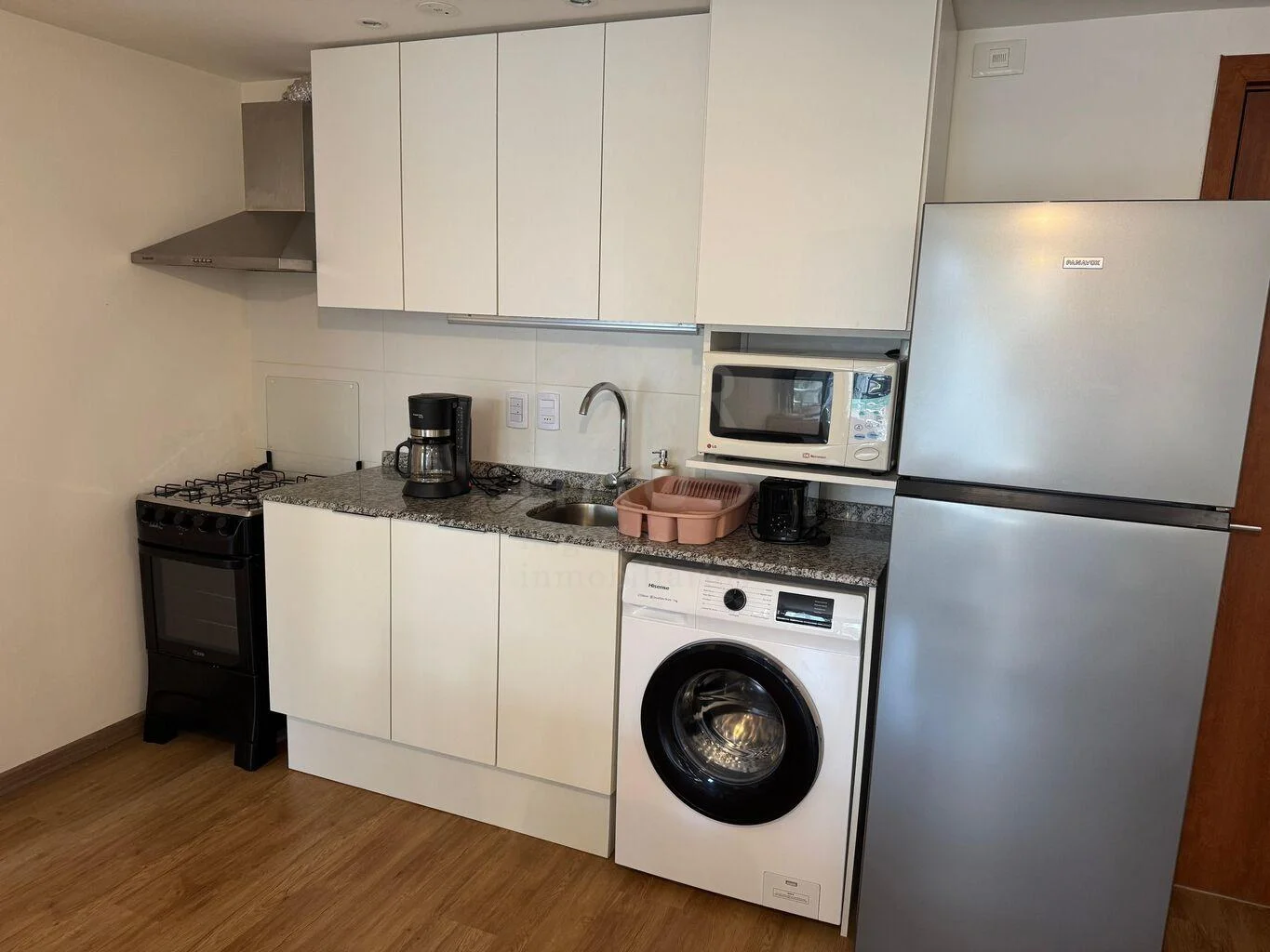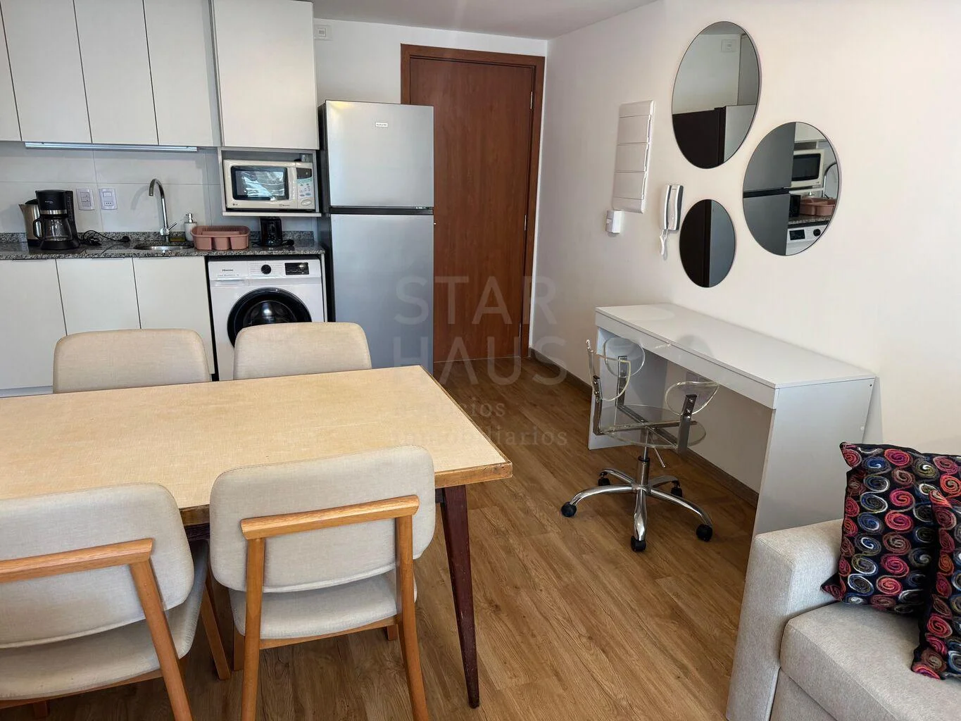 Totalmente amoblado con todo lo que se ve en las fotos (sillón, mesa de comedor con 4 sillas, escritorio, rack tv, mesa ratona, tv, 2 equipos de aire acondicionados, heladera, cocina, microondas, calefón, campana extractora en la cocina, extractor de baño, lavaseca ropa, sommier 2 plazas, mesa de luz, comoda acolchados, almohadas, vajilla)