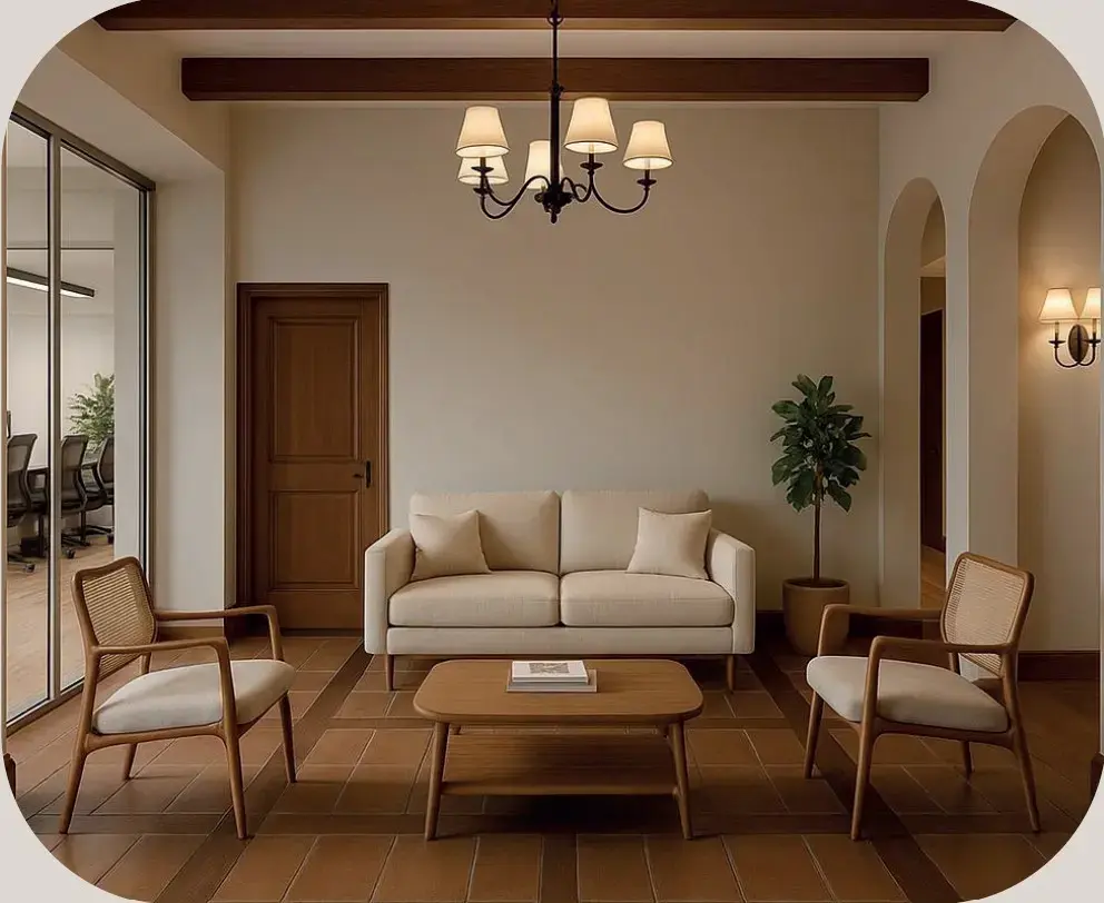 Ambiente profesional con recepción, sala de reuniones, cocina y baños de uso común. Entorno verde con jardín y espacios exteriores.