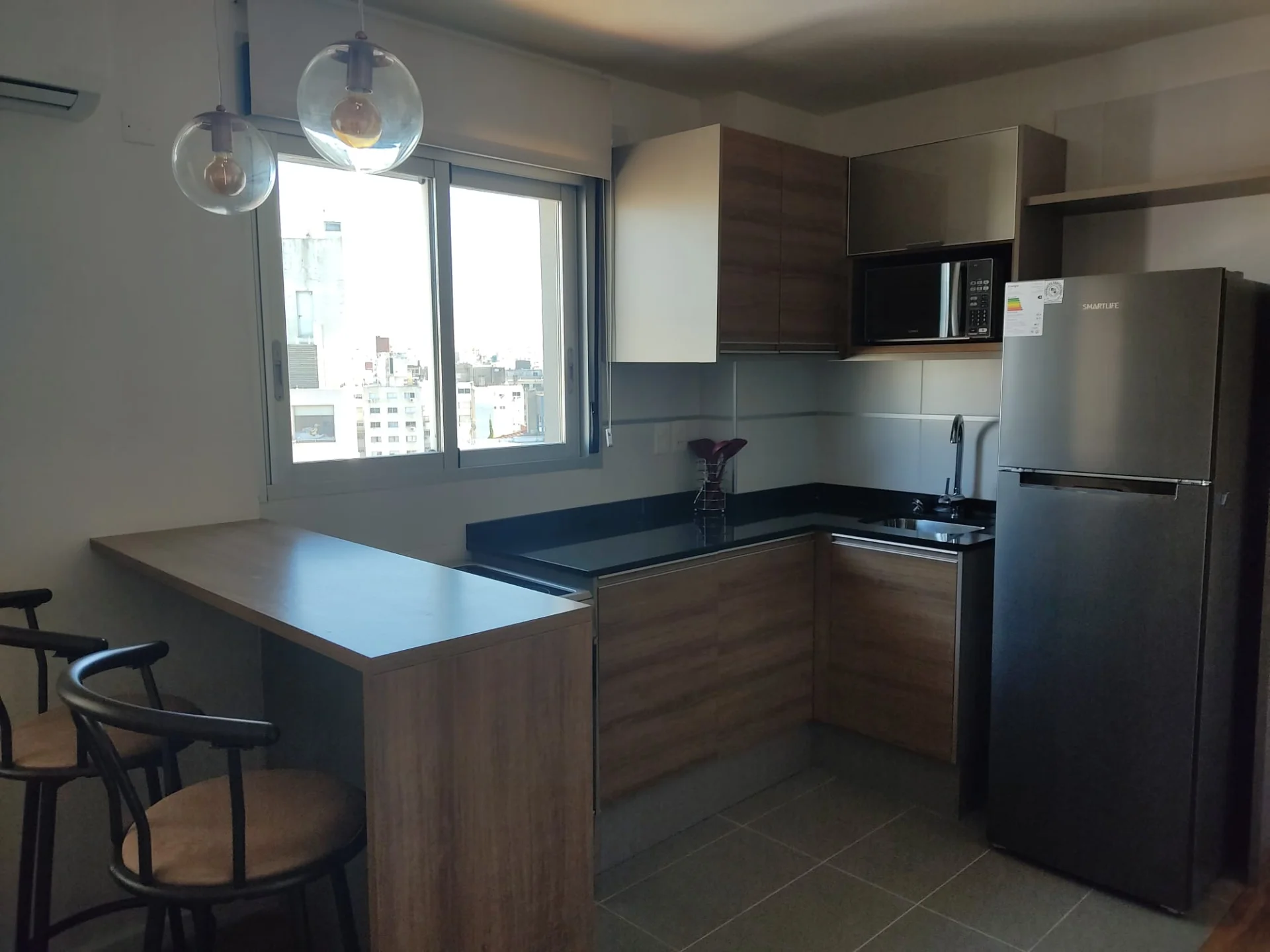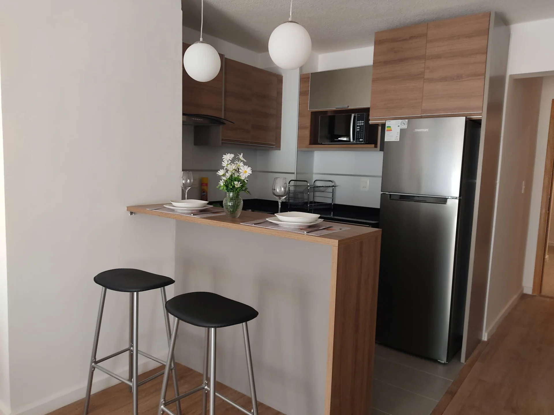 La cocina, compacta y funcional, está completamente equipada con electrodomésticos modernos. Además, cuenta con una barra estilo americano y amplios ventanales que permiten la entrada de luz natural y otorgan atractivas vistas panorámicas de la ciudad. Entre sus características clave, destacan los pisos de madera, un balcón privado, la práctica barra estilo americano y una cocina completamente equipada.