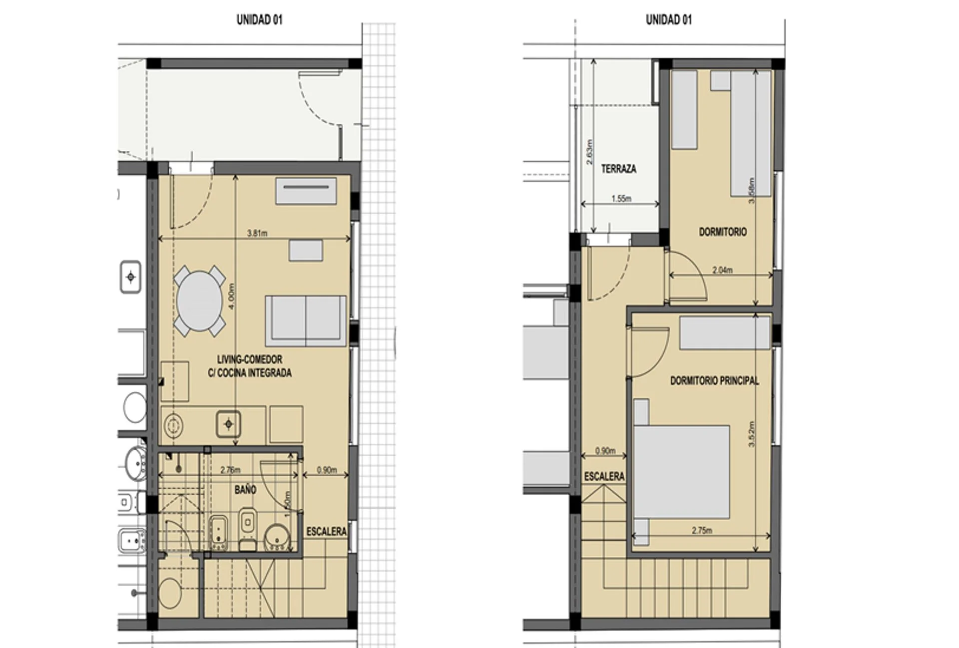 Se desarrolla en 60 m2 más 5 m2 de terraza lavadero, de uso particular de la unidad, la que se ubica en planta alta. Cuenta con 2 dormitorios, living comedor con cocina integrada. A la unidad se accede mediante pasillo abierto de circulación común.