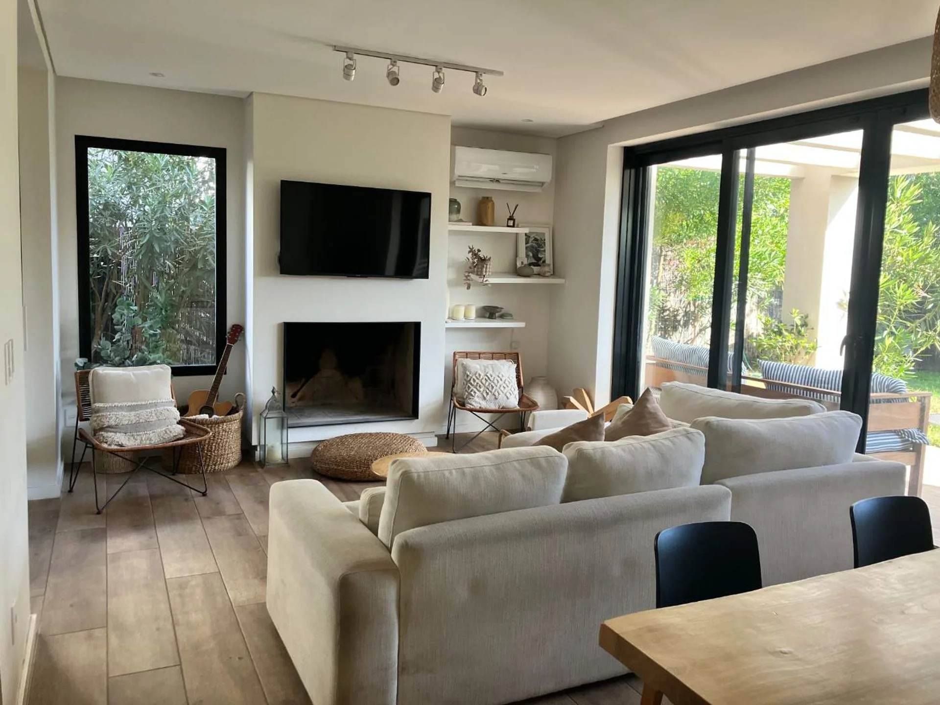 En planta baja, ingreso por hall de distribución con toilette de recepción, escalera a planta alta y acceso al área social. Amplio living comedor con estufa de alto rendimiento y grandes ventanales que conectan con el jardín. Cocina integrada al estar, equipada con horno, anafe y campana.