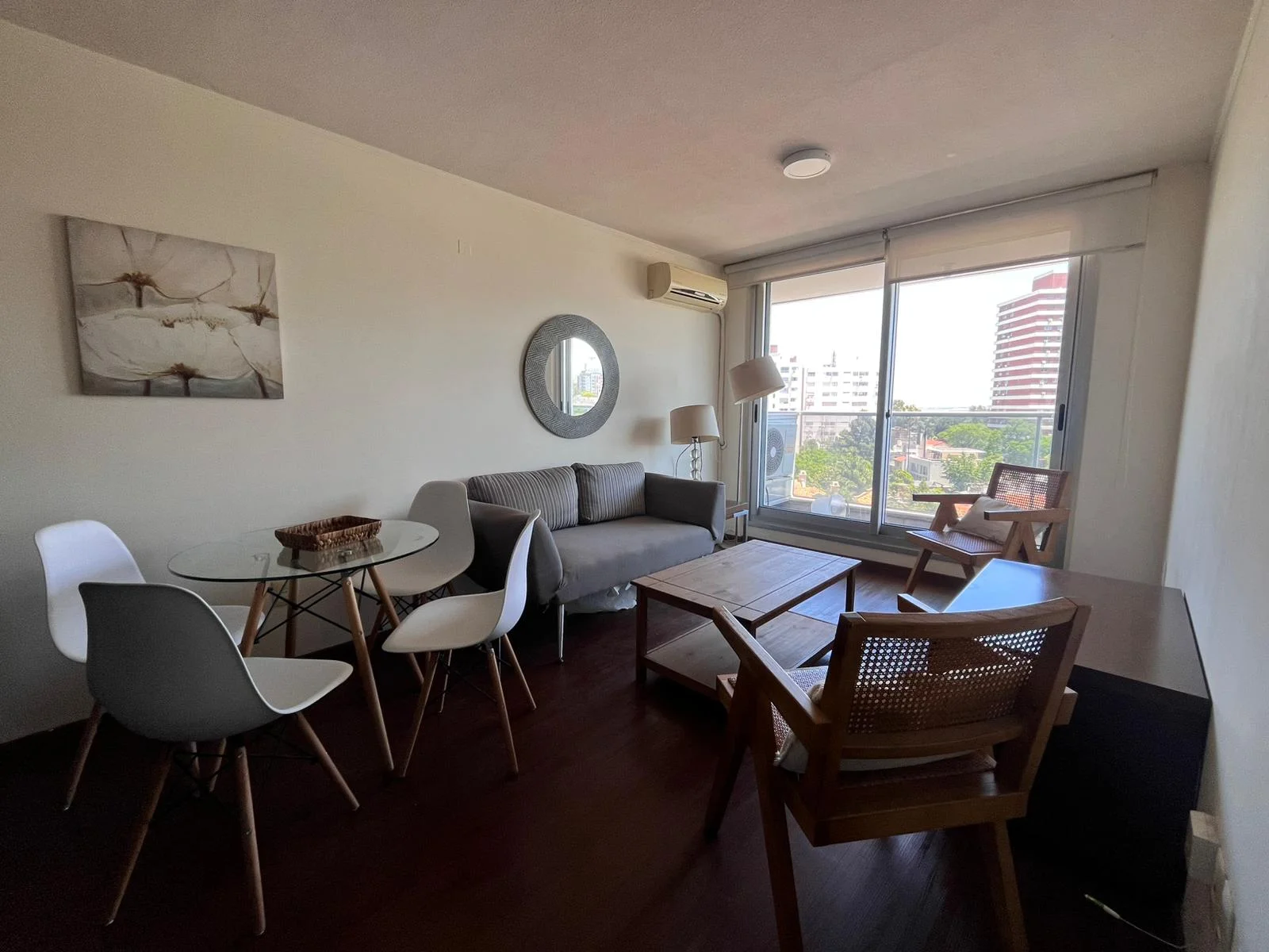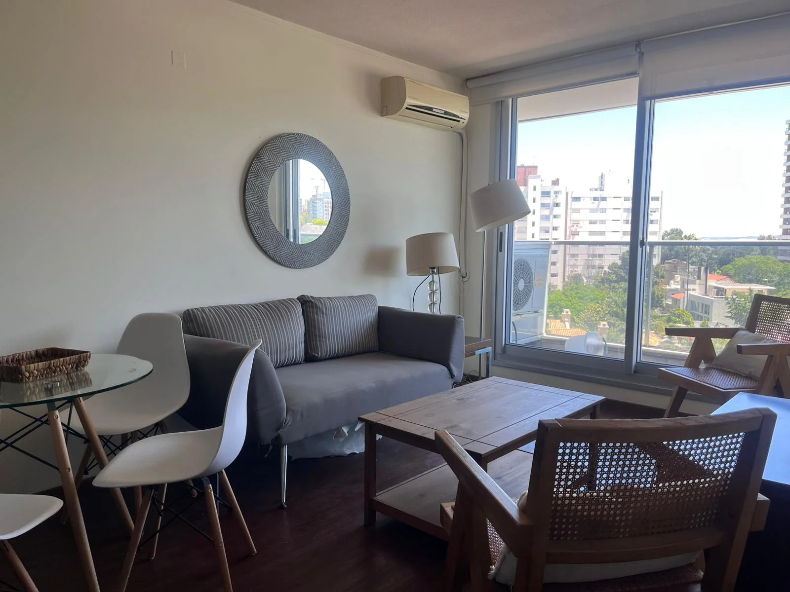 Alquiler apartamento 1 dormitorio con muebles. Piso alto muy luminoso, vista despejada. A pasos del Club de Golf.Living-comedor con ventana doble, salida a terraza y aire acondicionado. Dormitorio con placard, aire acondicionado y ventana doble. Cocina integrada con línea blanca. Baño completo. Garage para un auto. Rooftop con parrillero y vista al mar.