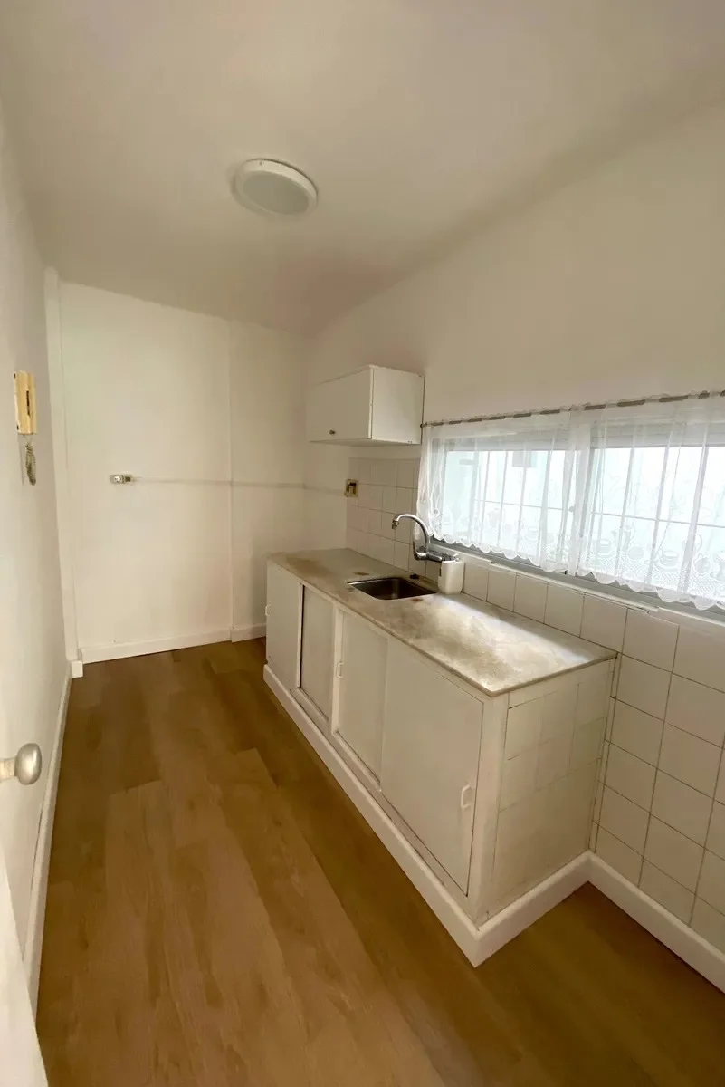 • Cocina completa con ventana hacia un patio de uso exclusivo, ideal para disfrutar de un espacio privado al aire libre.