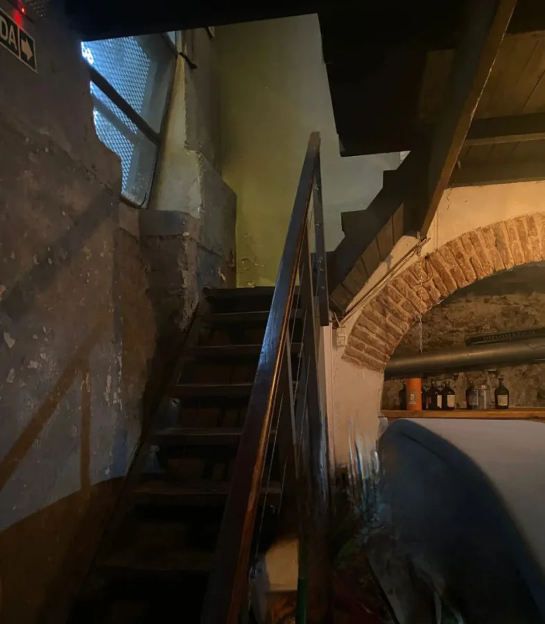 Desde el salón, escalera en buen estado hacia el sótano de buenas dimensiones, paredes de piedra, barra de madera, extractor.