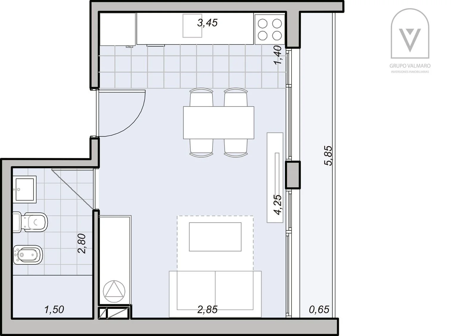 El espacio también incluye un pequeño balcón que recorre toda la longitud del apartamento. Los residentes tienen acceso a una variedad de espacios comunes que enriquecen la experiencia de vivir aquí, incluyendo un coworking, gimnasio, laundry, plaza de juegos infantiles, jardines, barbacoas y un solarium.
