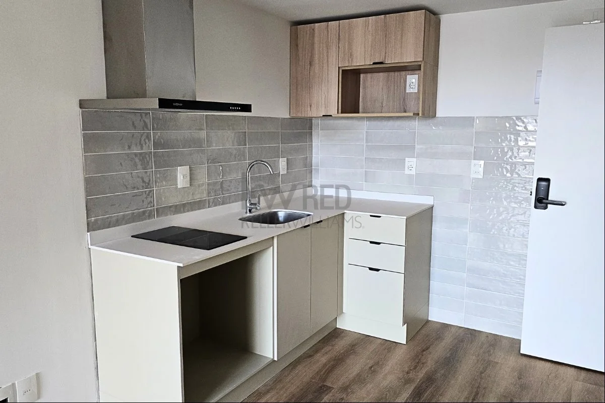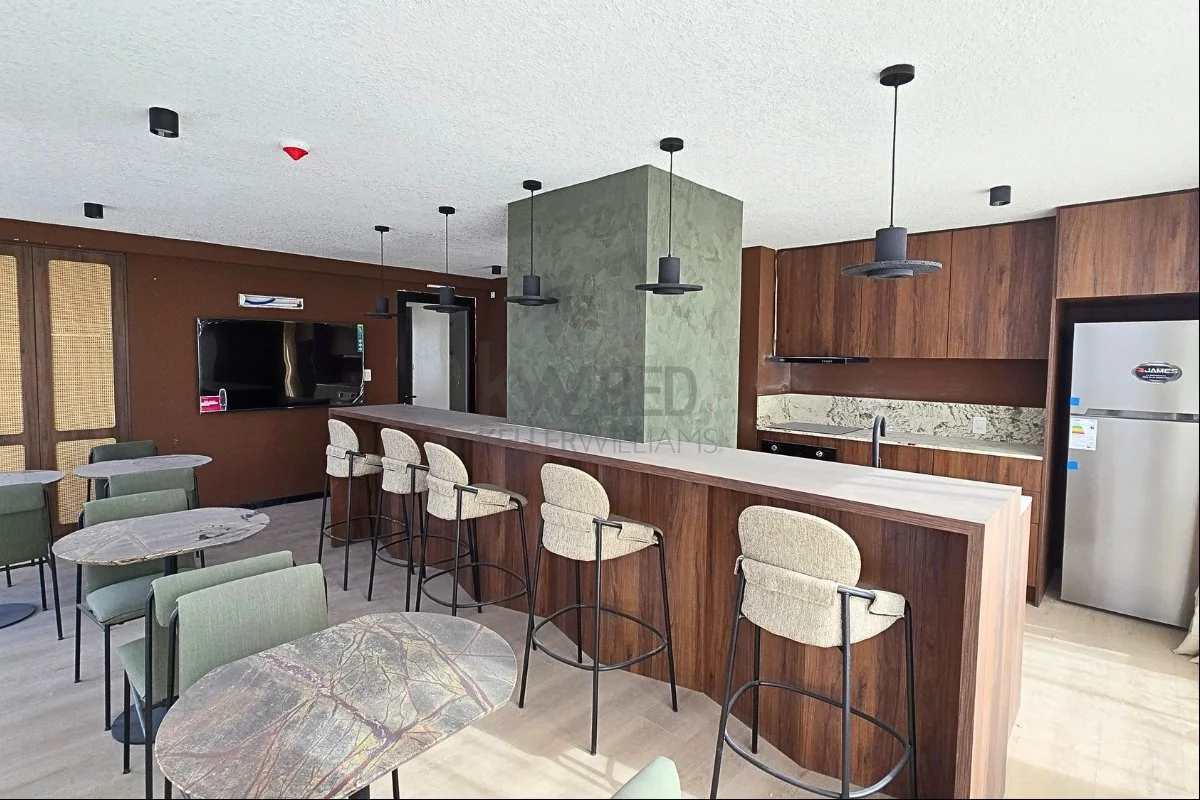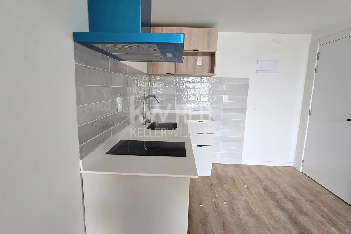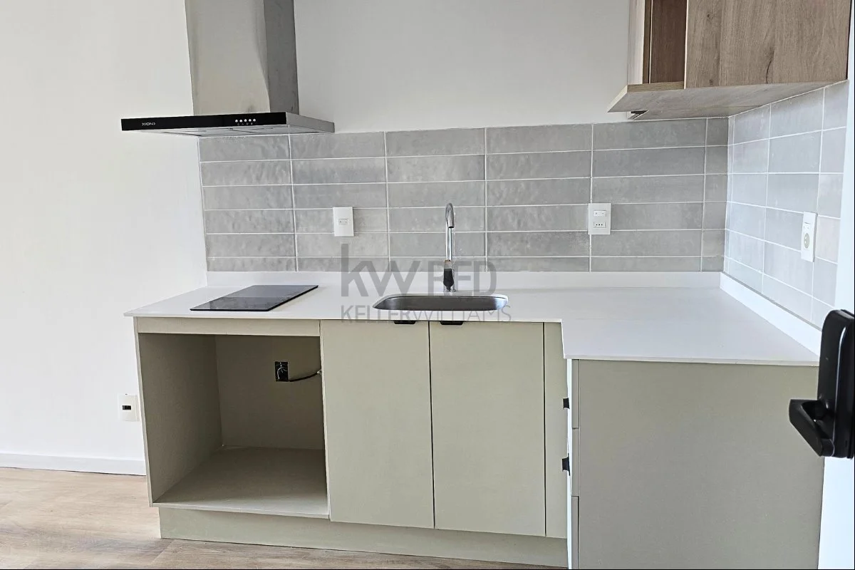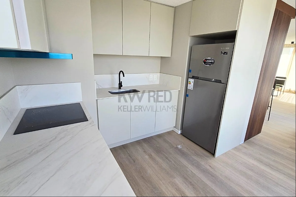 Cocina integrada con doble mesada, muebles bajo y sobre mesada, anafe, campana y horno empotrado ya incluidos.