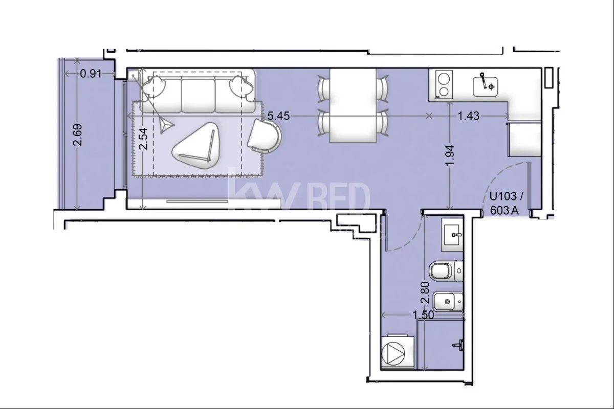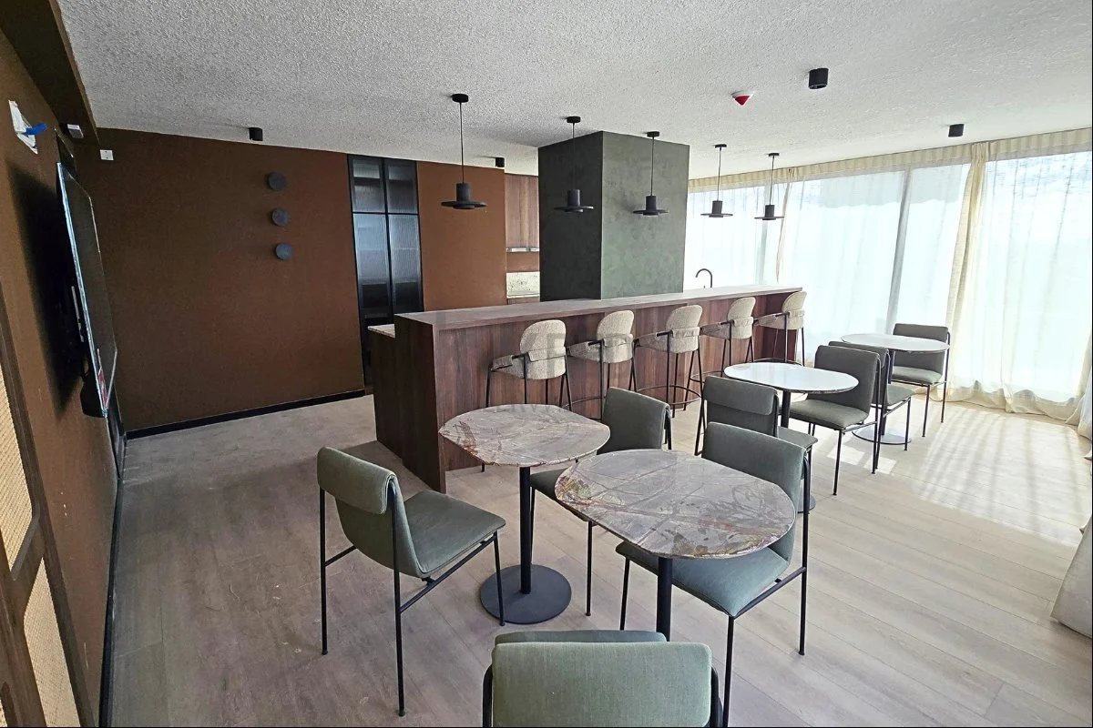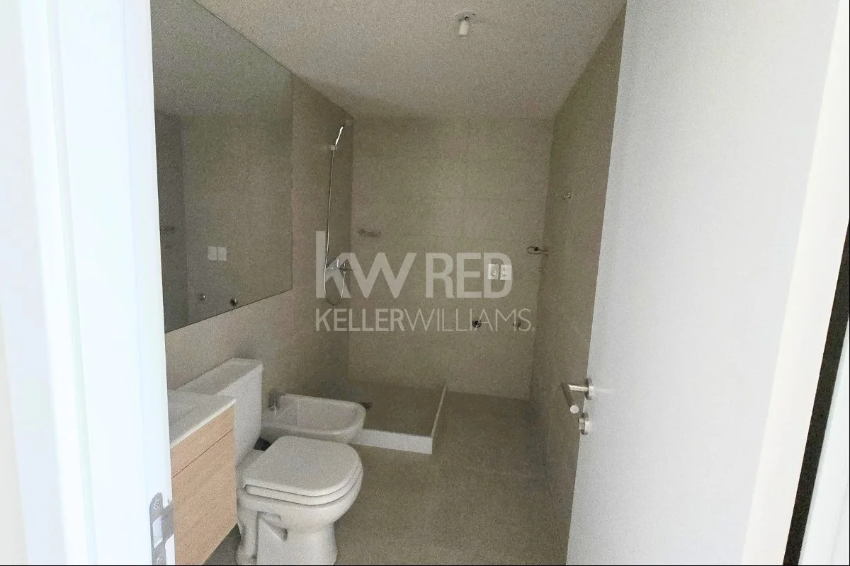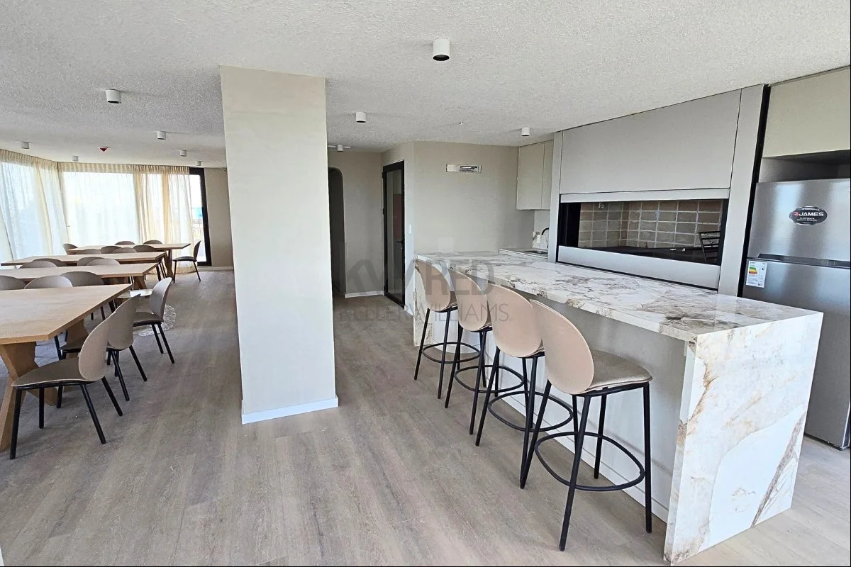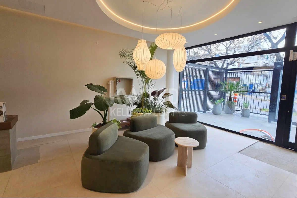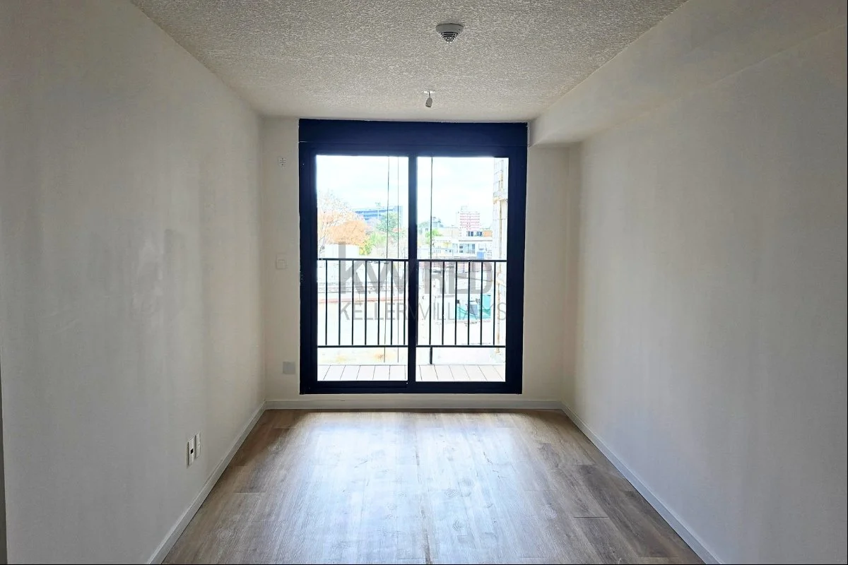 Monoambiente con amplio ventanal y terraza.