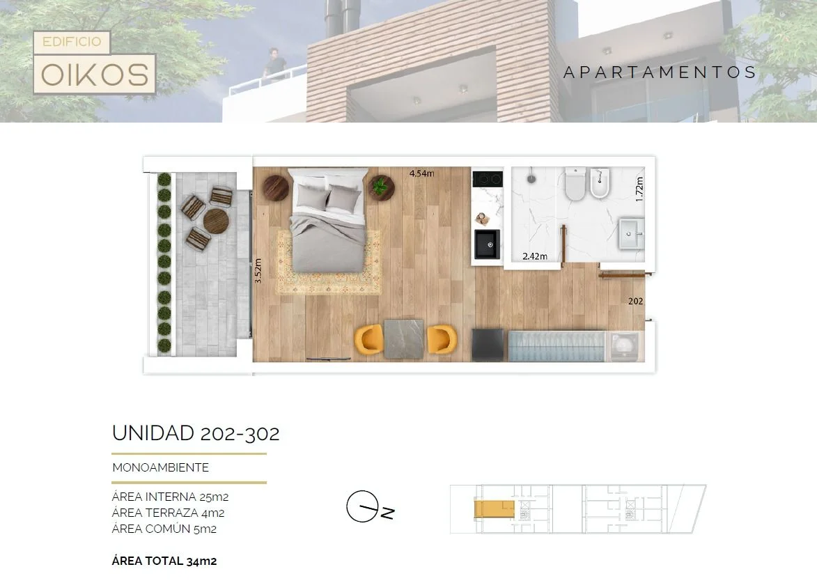 Es un monoambiente moderno y funcional, ideal para quienes buscan comodidad y eficiencia en un espacio reducido pero bien distribuido. Con un total de 36 m², esta unidad incluye una área interna de 25 m² y una terraza privada de 4 m².