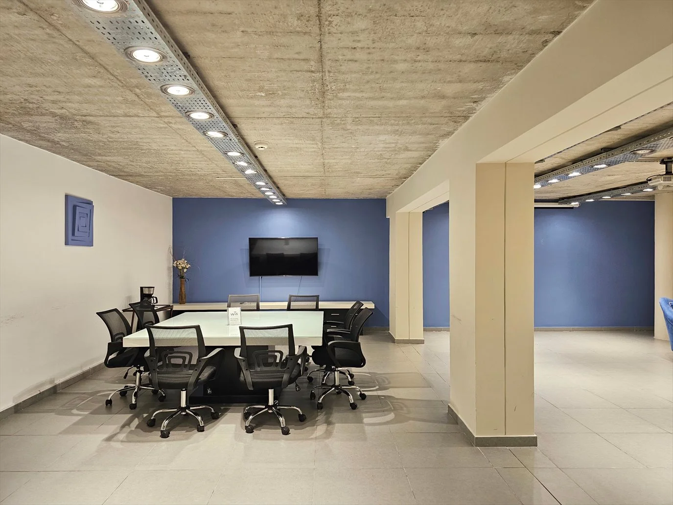 - Sala de uso múltiples - Sala de Conferencias o Sala de Reuniones- equipada con mobiliario, monitor y proyector. Costo mínimo de limpieza.