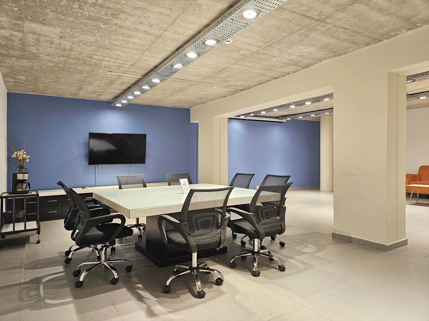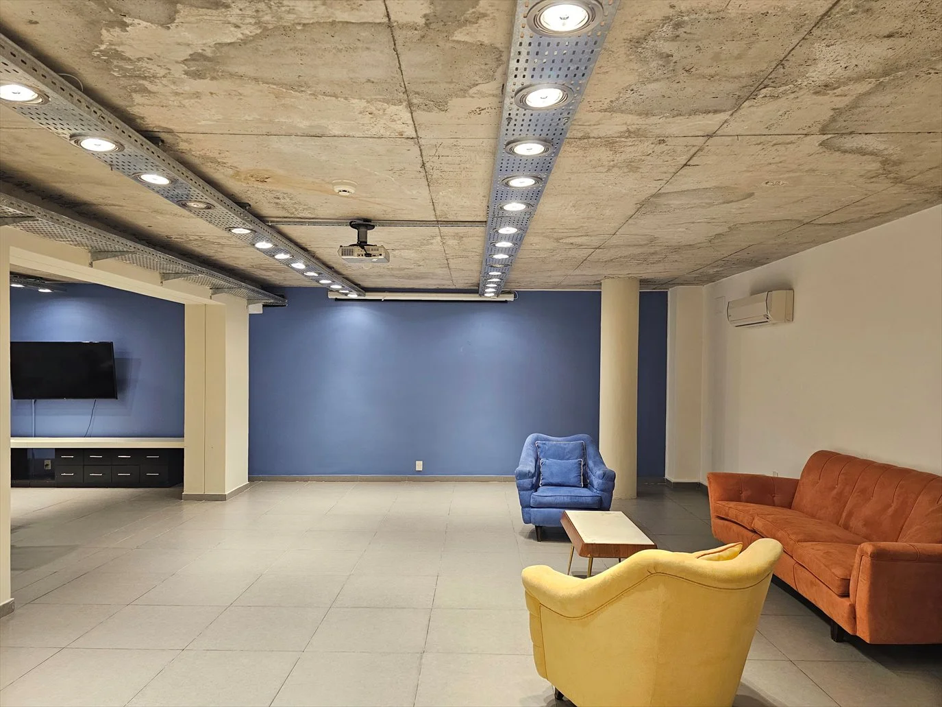 - Sala de uso múltiples - Sala de Conferencias o Sala de Reuniones- equipada con mobiliario, monitor y proyector. Costo mínimo de limpieza.