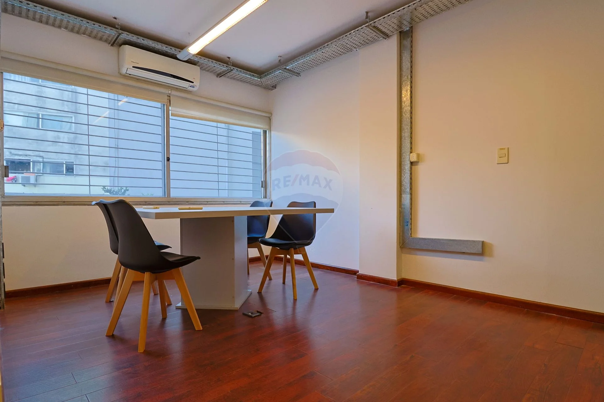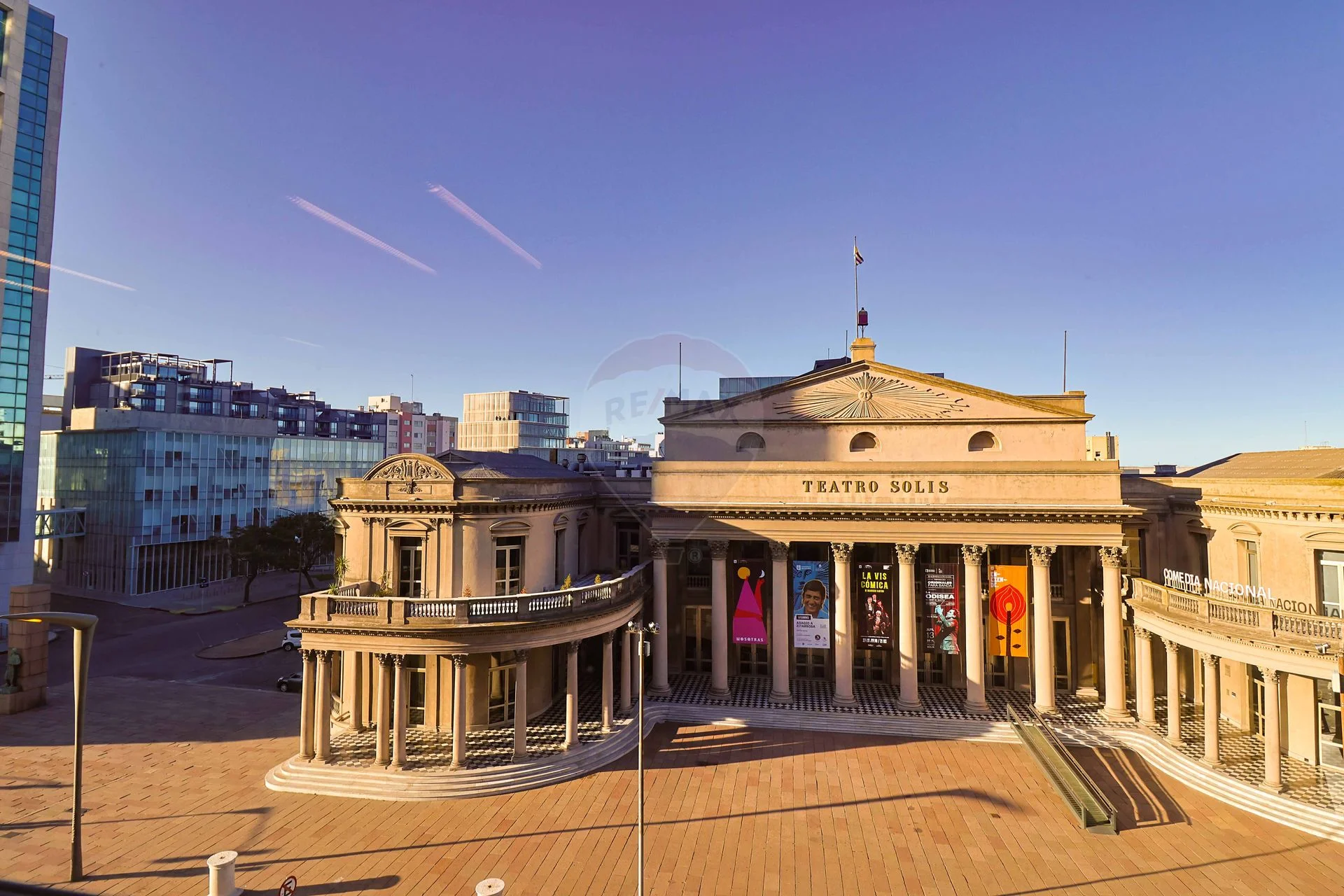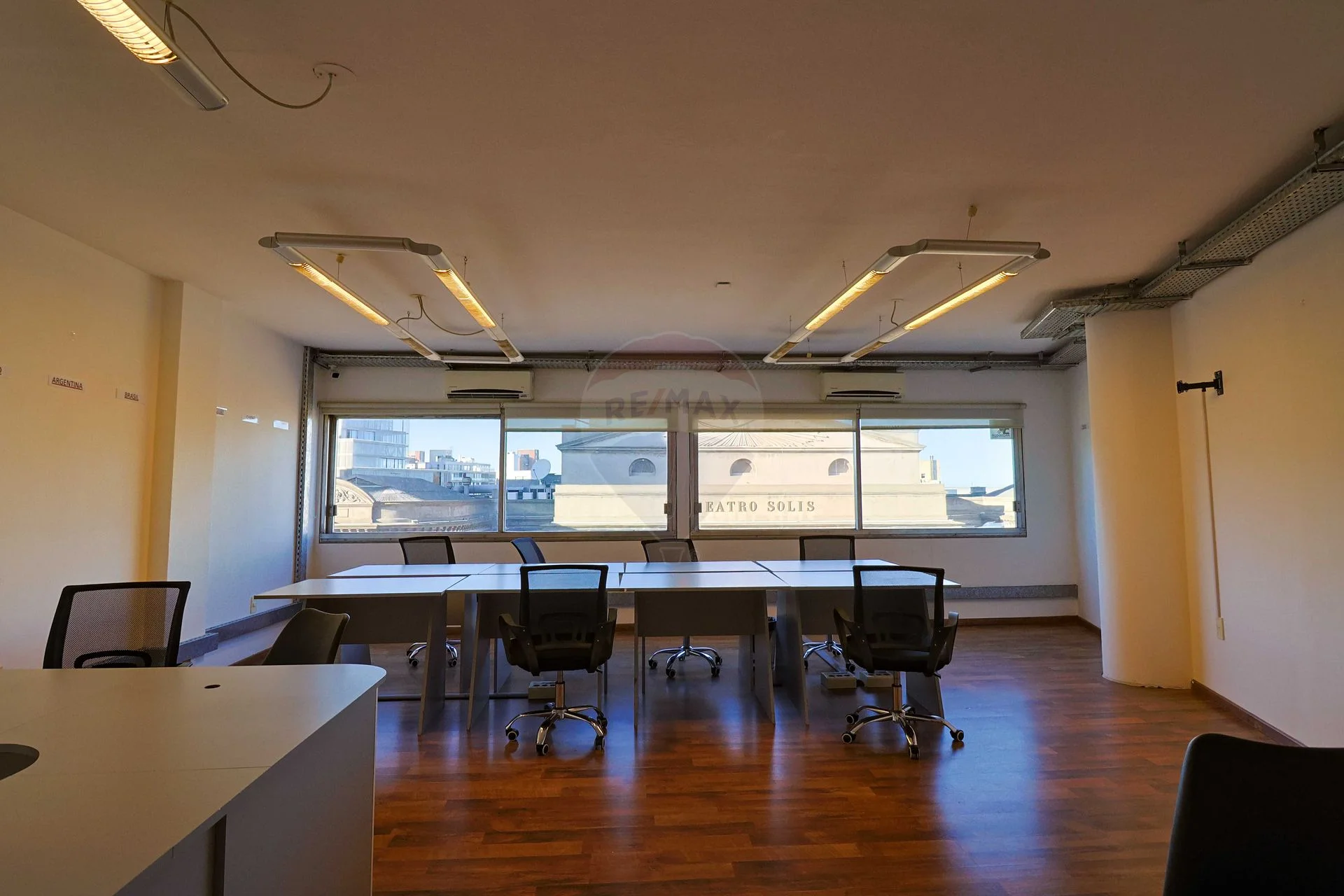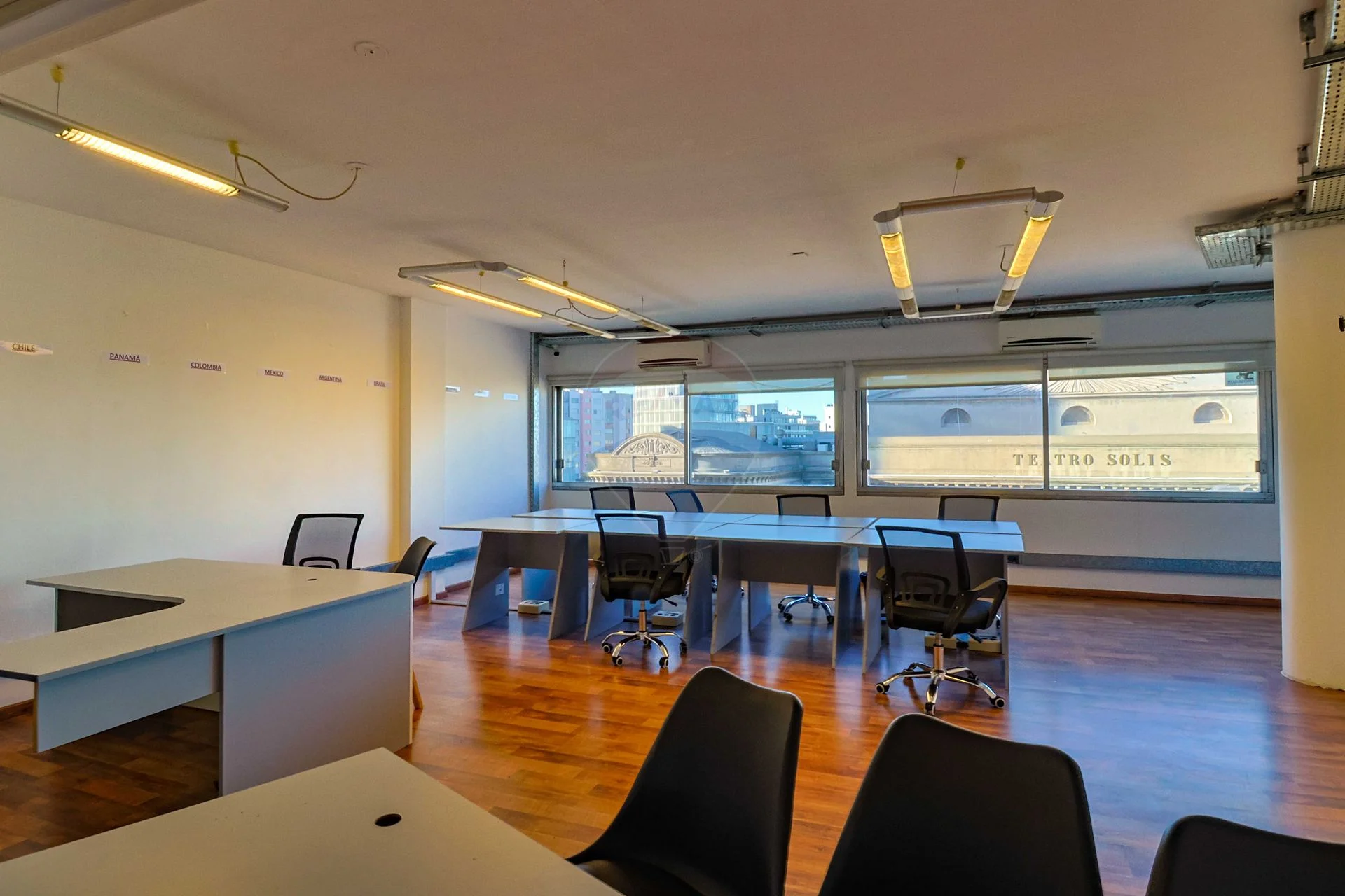 Primer oficina con Orientación Sur, vista al Teatro Solís, aire acondicionado frio/calor y cortinas, cómoda mesa de reunión con sillas.