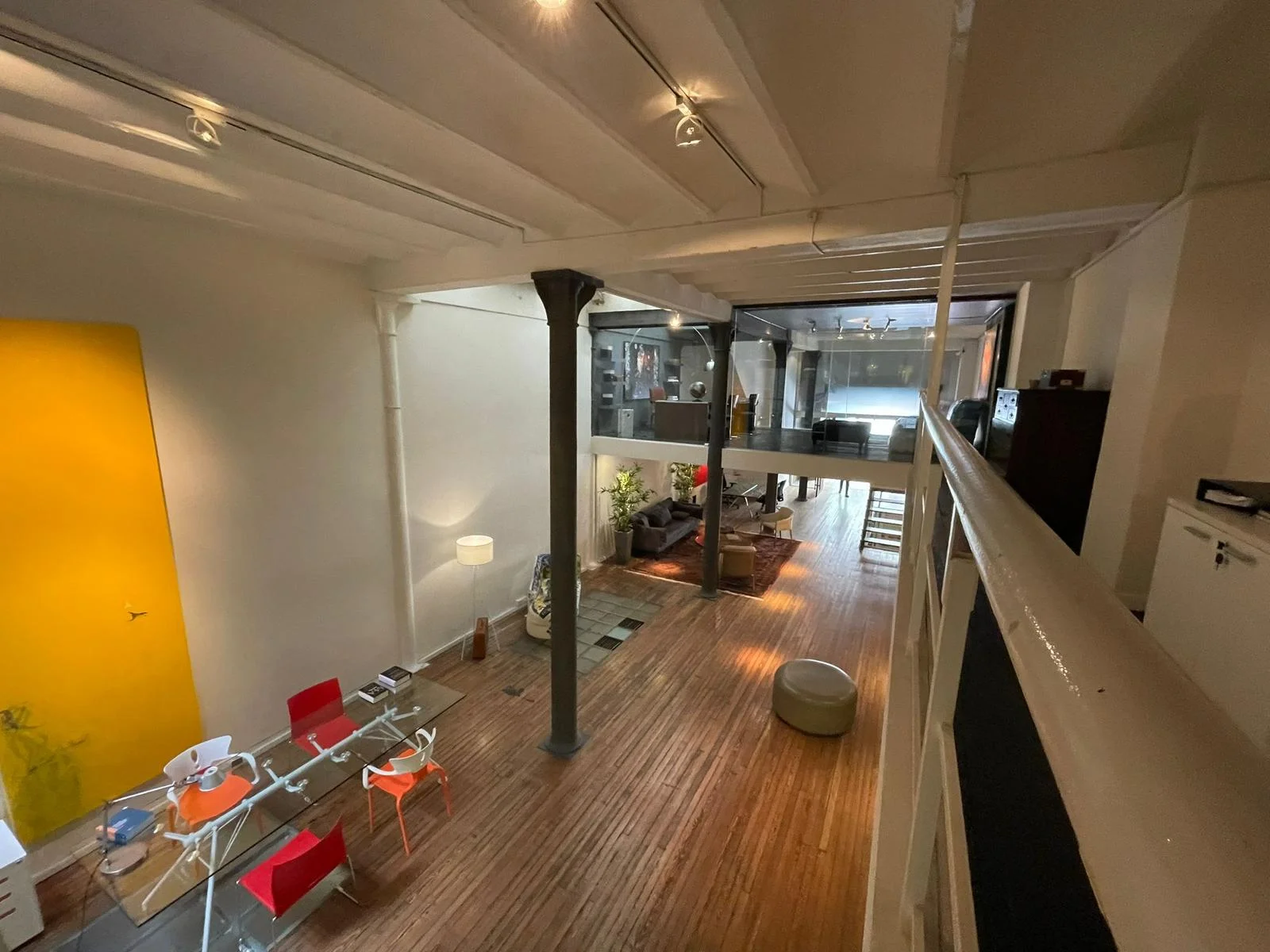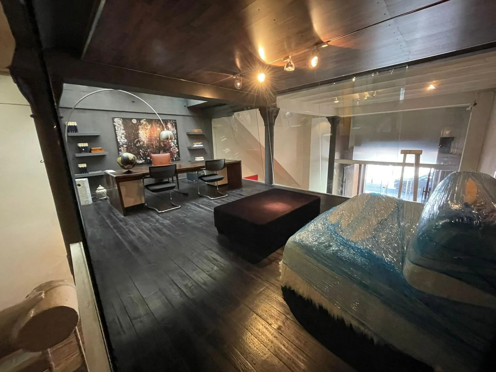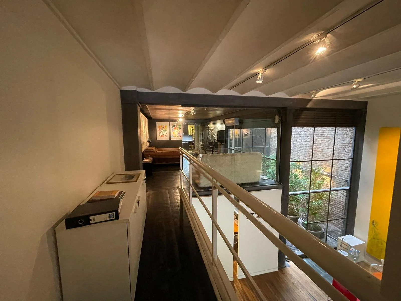 En Planta alta, 110 mts un entrepiso de ensueño que balconea a la planta principal, con una oficina central con acceso independiente, 2 sectores de baños con espacios privados y ropería.